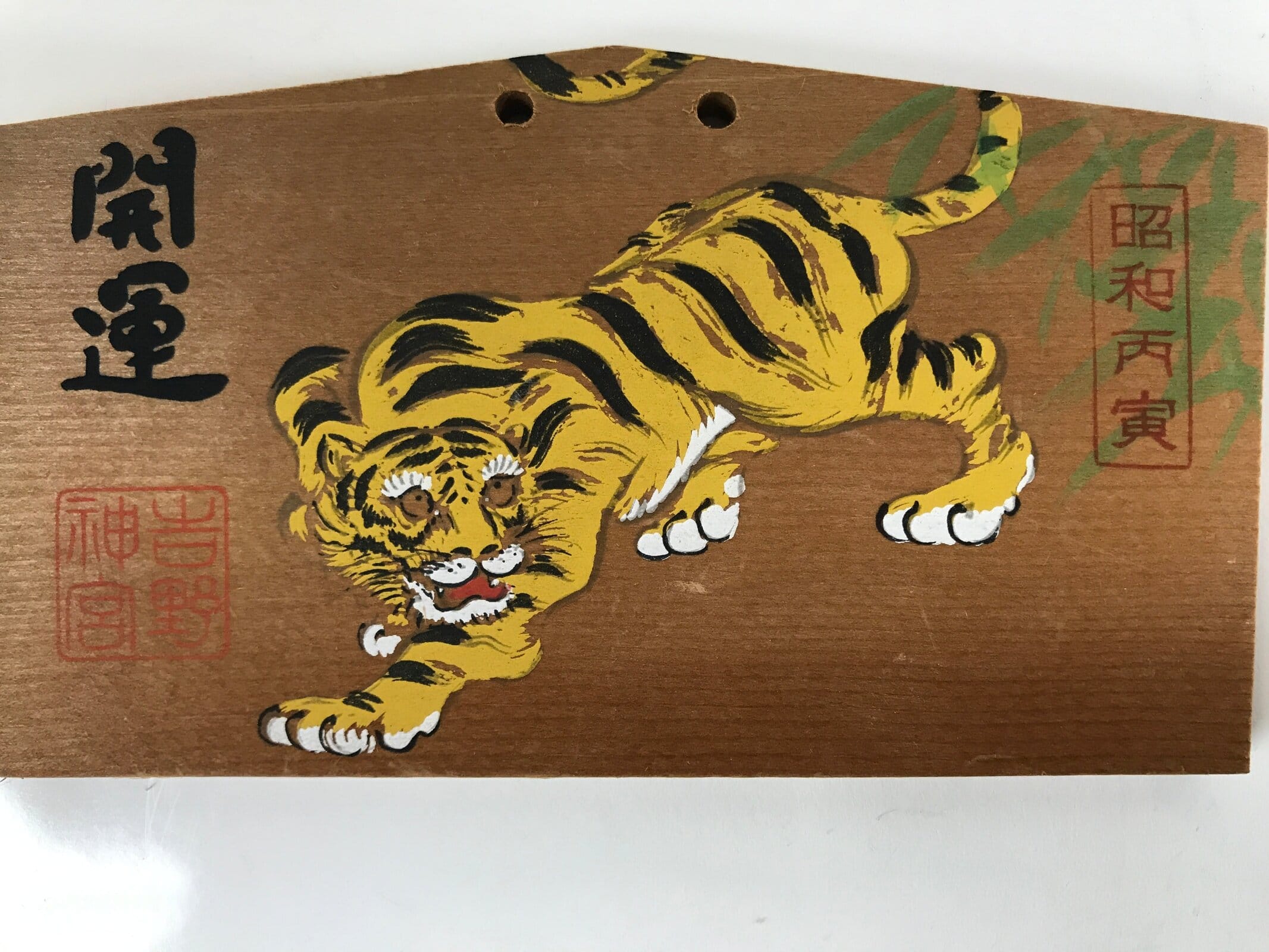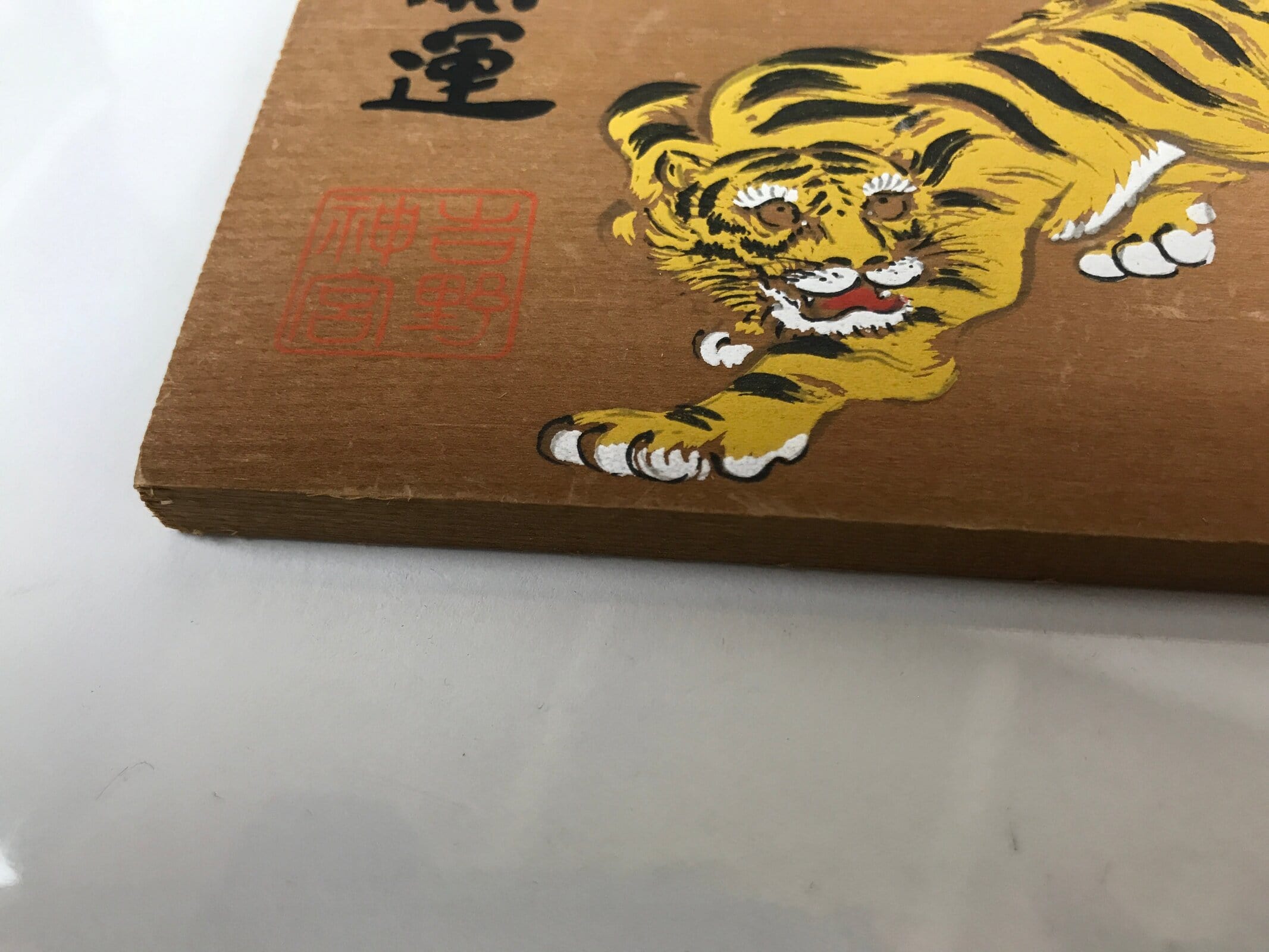 This vintage Japanese ema plaque features an illustration of a yellow and black tiger. It has some vertical inscriptions as well as a red seal with the name of the shrine.