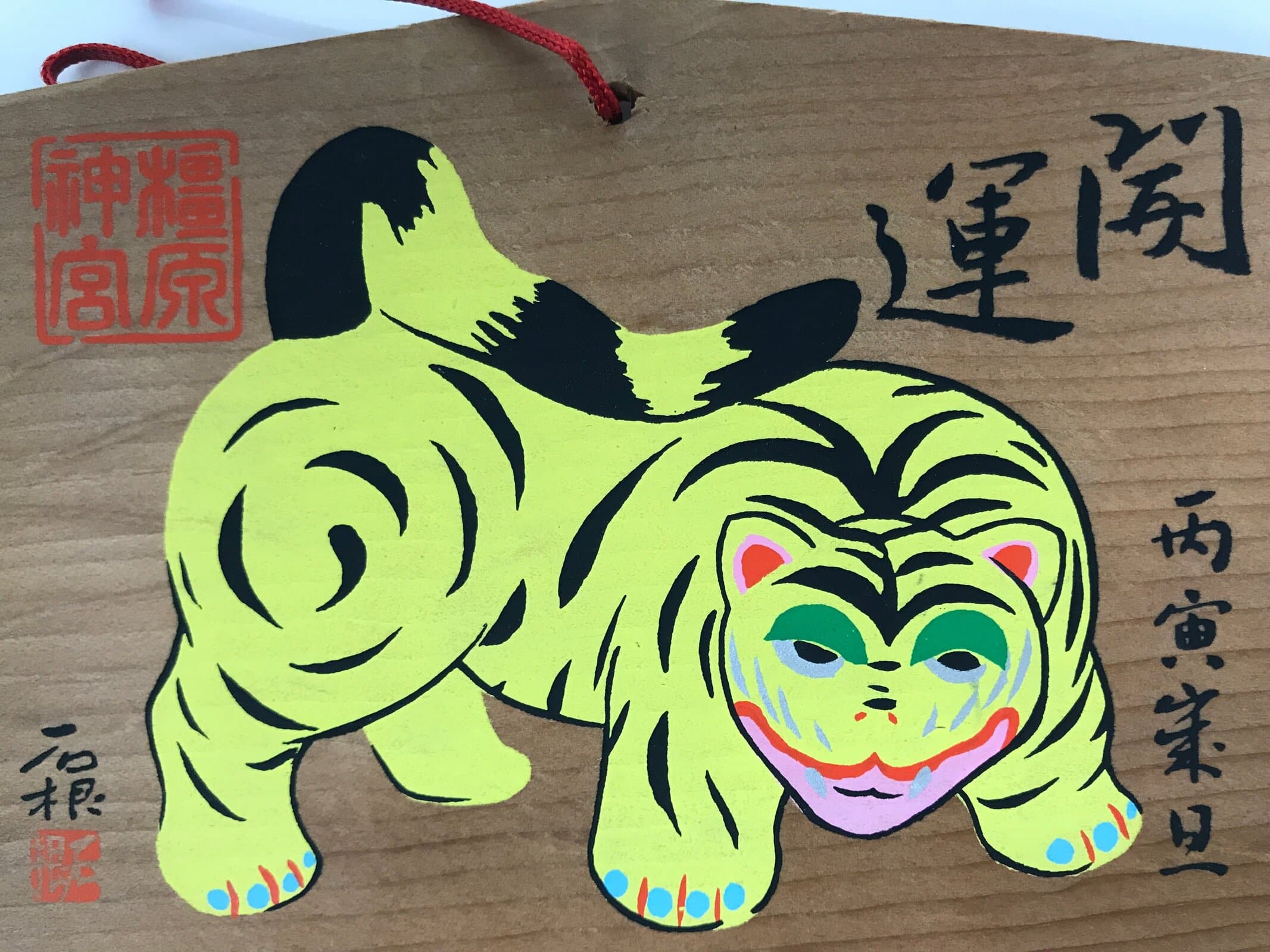 This vintage Japanese ema plaque features a yellow tiger with colored details. It is a plaque celebrating the year of the Tiger. It has several inscriptions in Japanese and a red seal with the name of the shrine. It has a red braided cord.