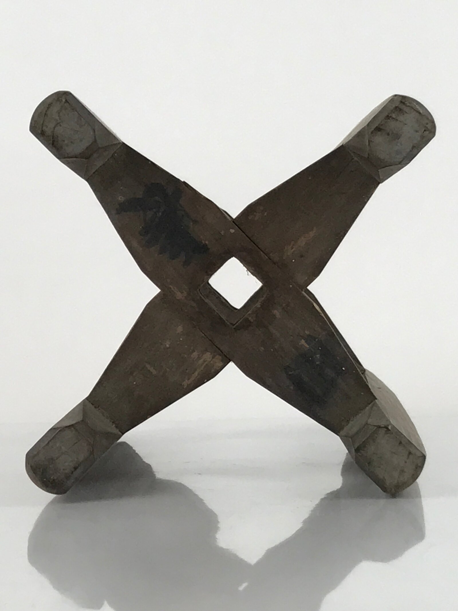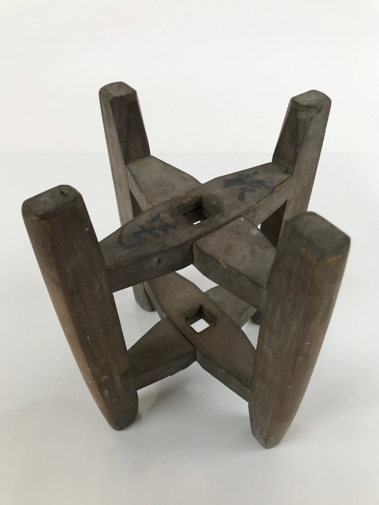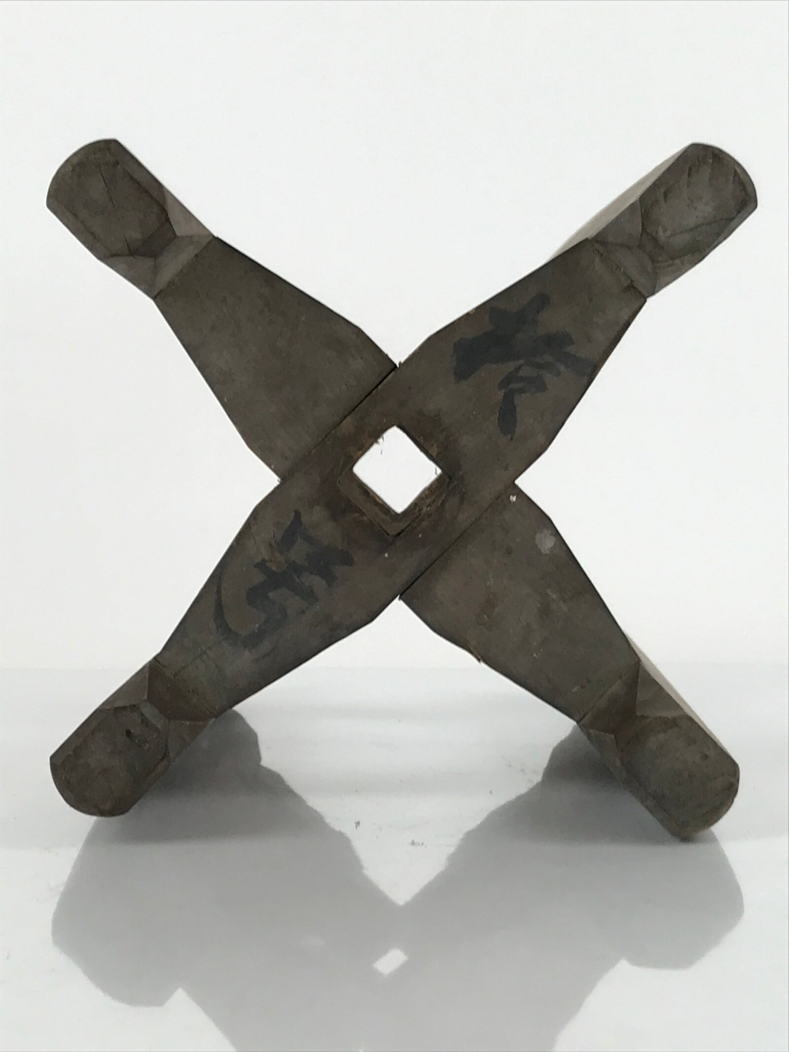 This is a vintage Japanese spool, or itomaki, used to wind and store copious amounts of silk thread used in the production of kimono and other popular traditional textiles. The thread is simply wound around the frame like a modern bobbin. This item was used in tandem with a machine called “zakuri” which was typically hand-powered and spun silk thread with quick efficiency. There is calligraphy kanji written on both ends.