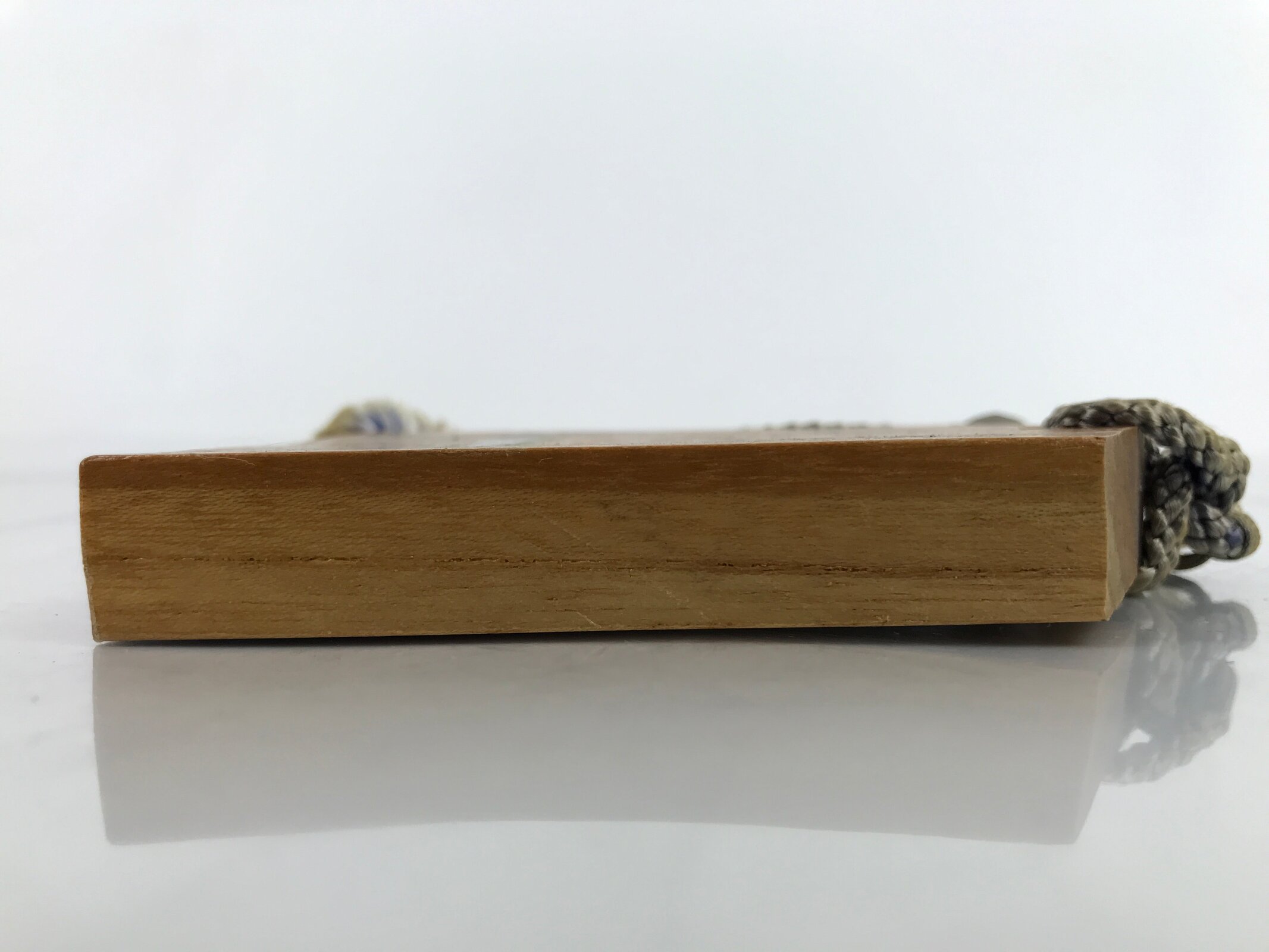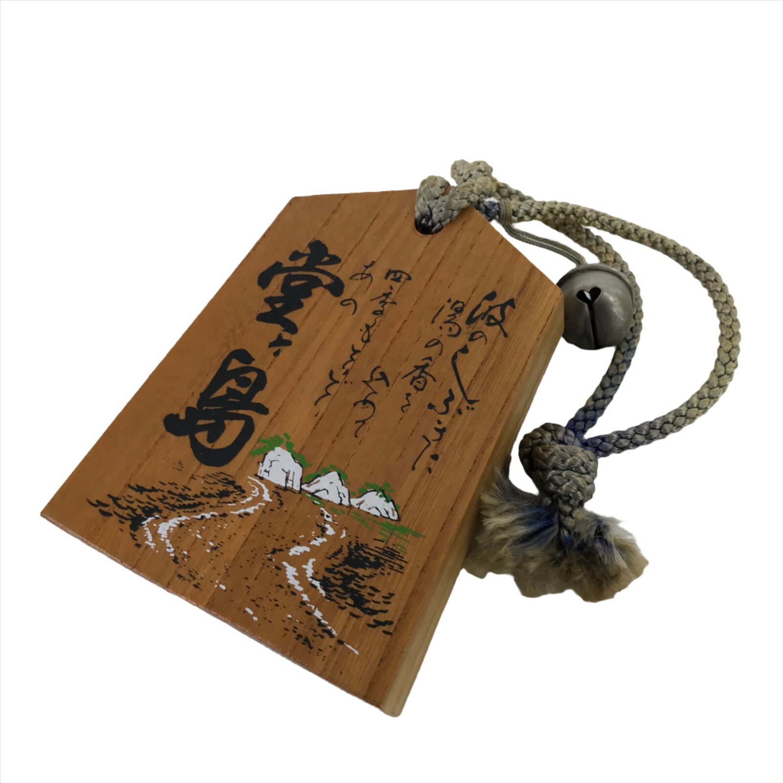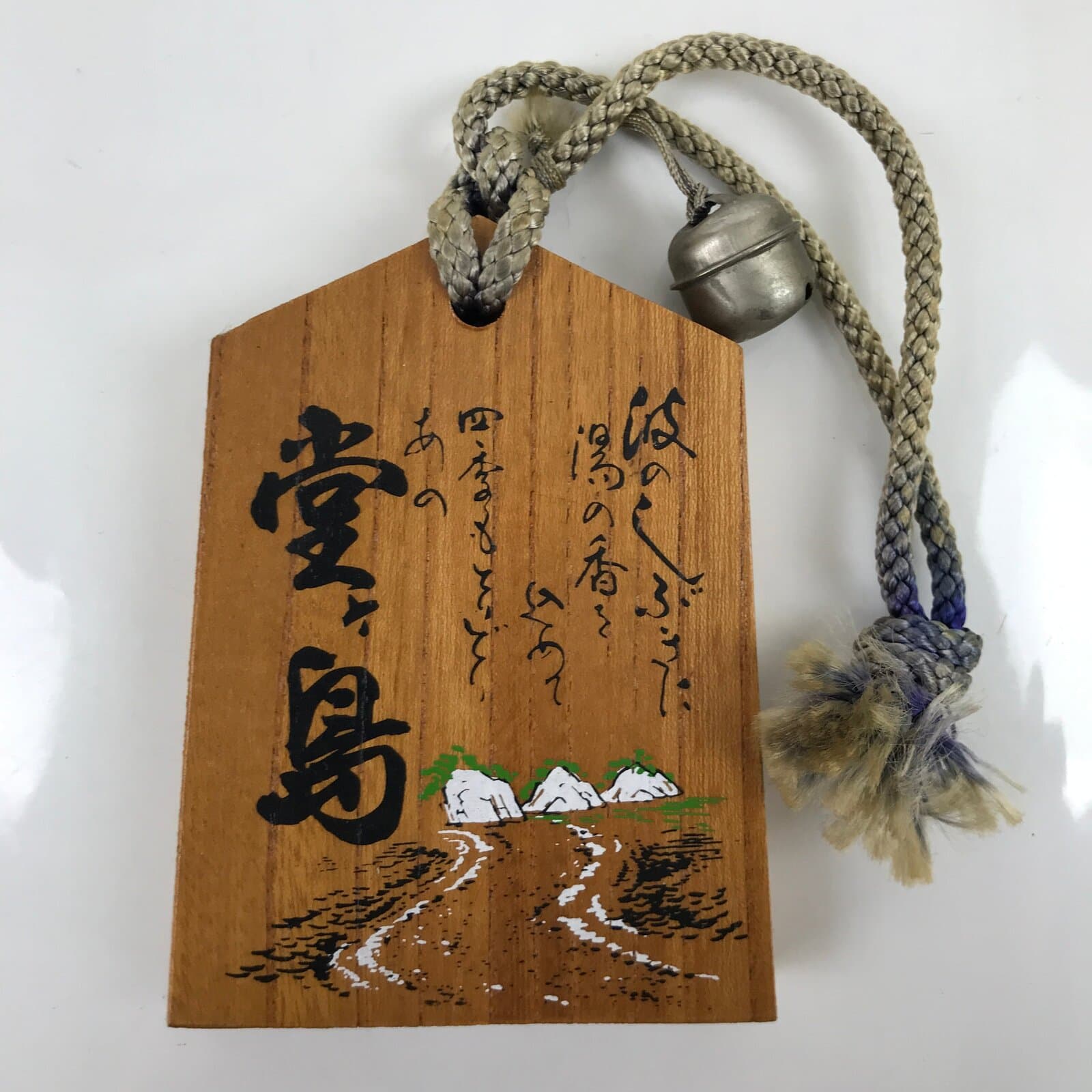 This vintage Japanese wooden souvenir plaque features a poem about Dogashima, an island in western Izu. The poem is illustrated with a white, green and black picture of the island. It has inscriptions on the back. This plaque has a purple and white braided cord and a small bell.