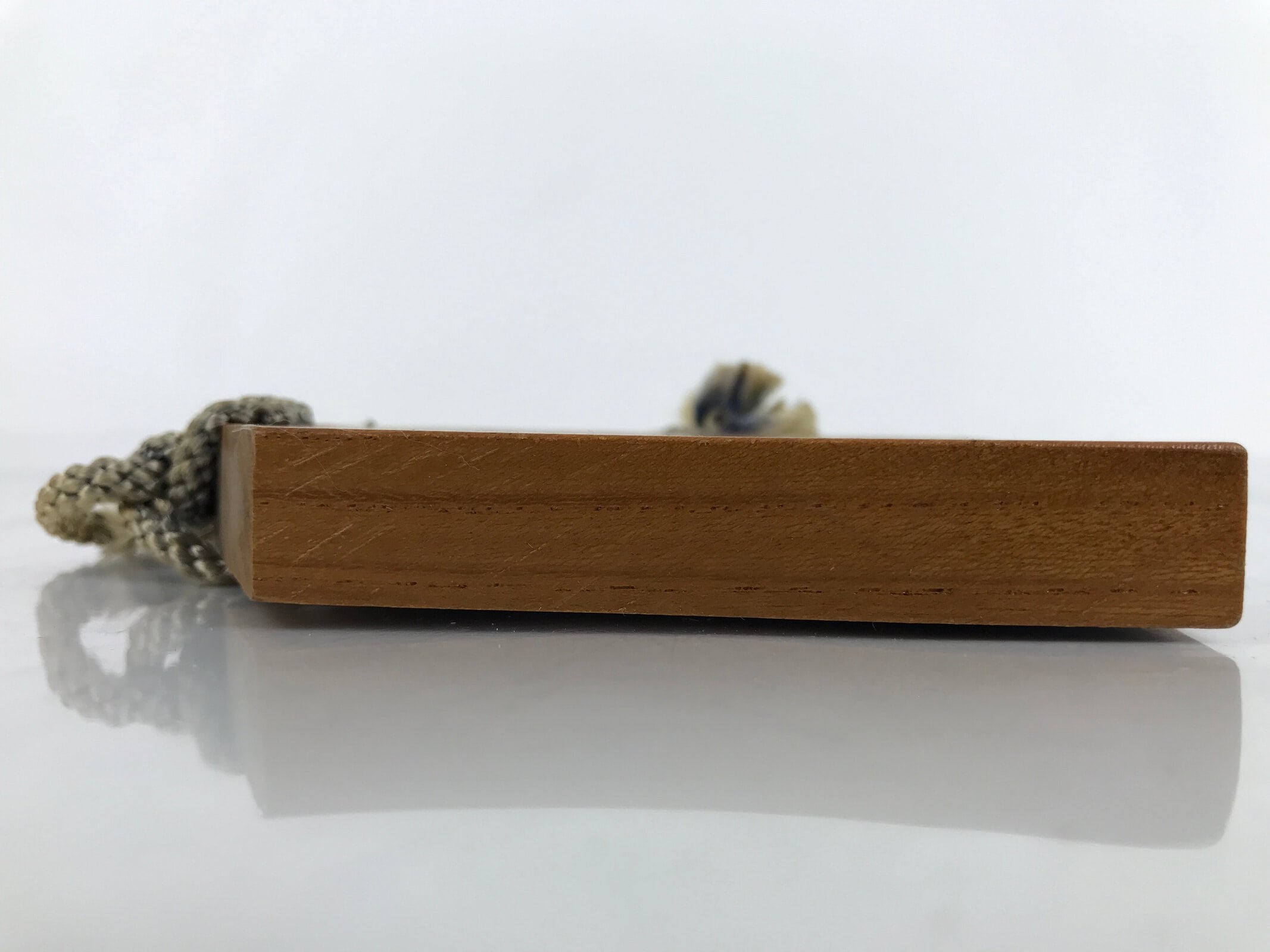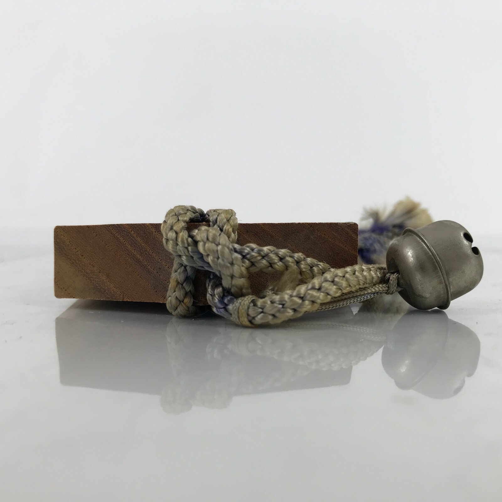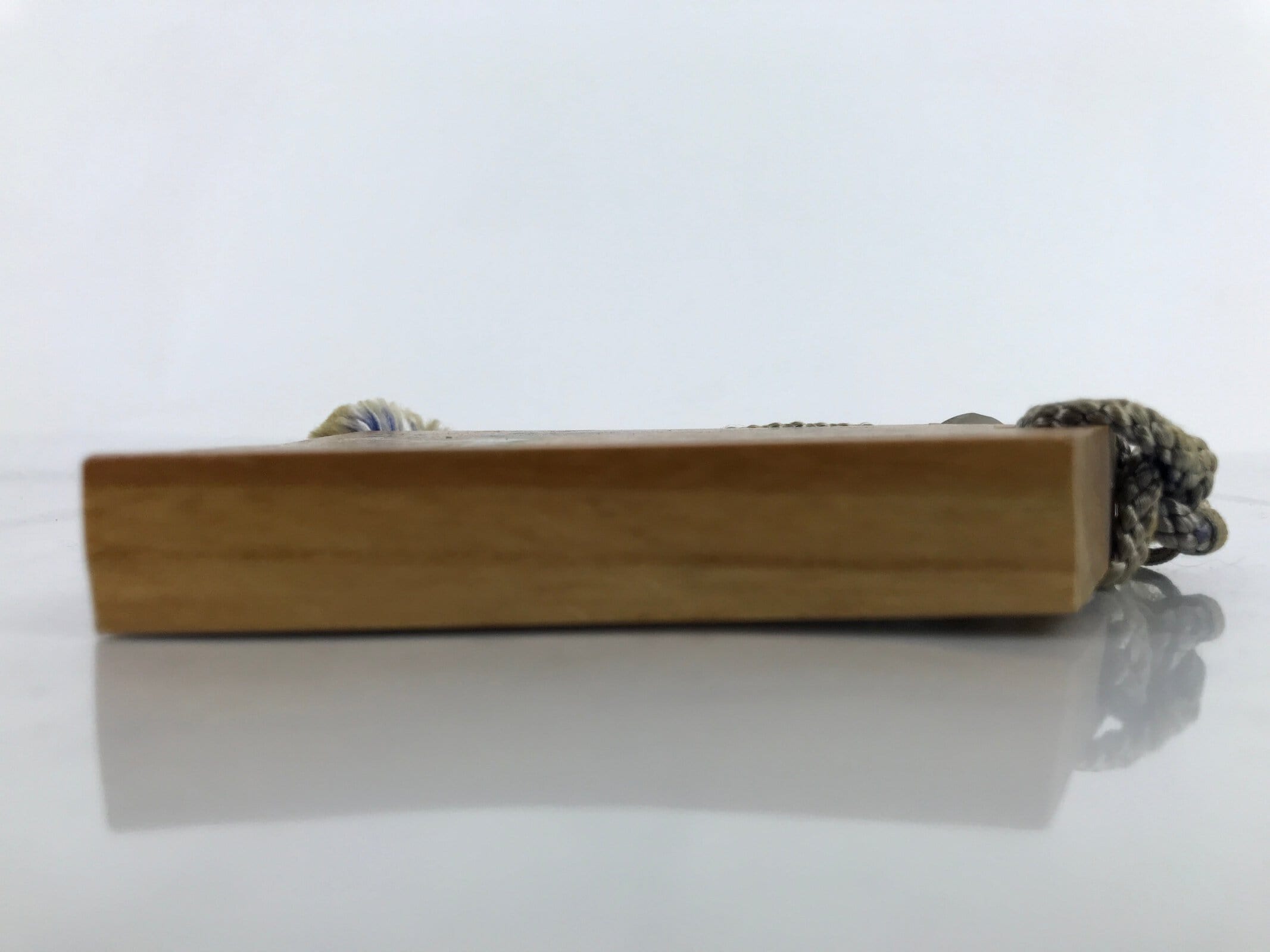 This vintage Japanese wooden souvenir plaque features a poem about Dogashima, an island in western Izu. The poem is illustrated with a white, green and black picture of the island. It has inscriptions on the back. This plaque has a purple and white braided cord and a small bell.