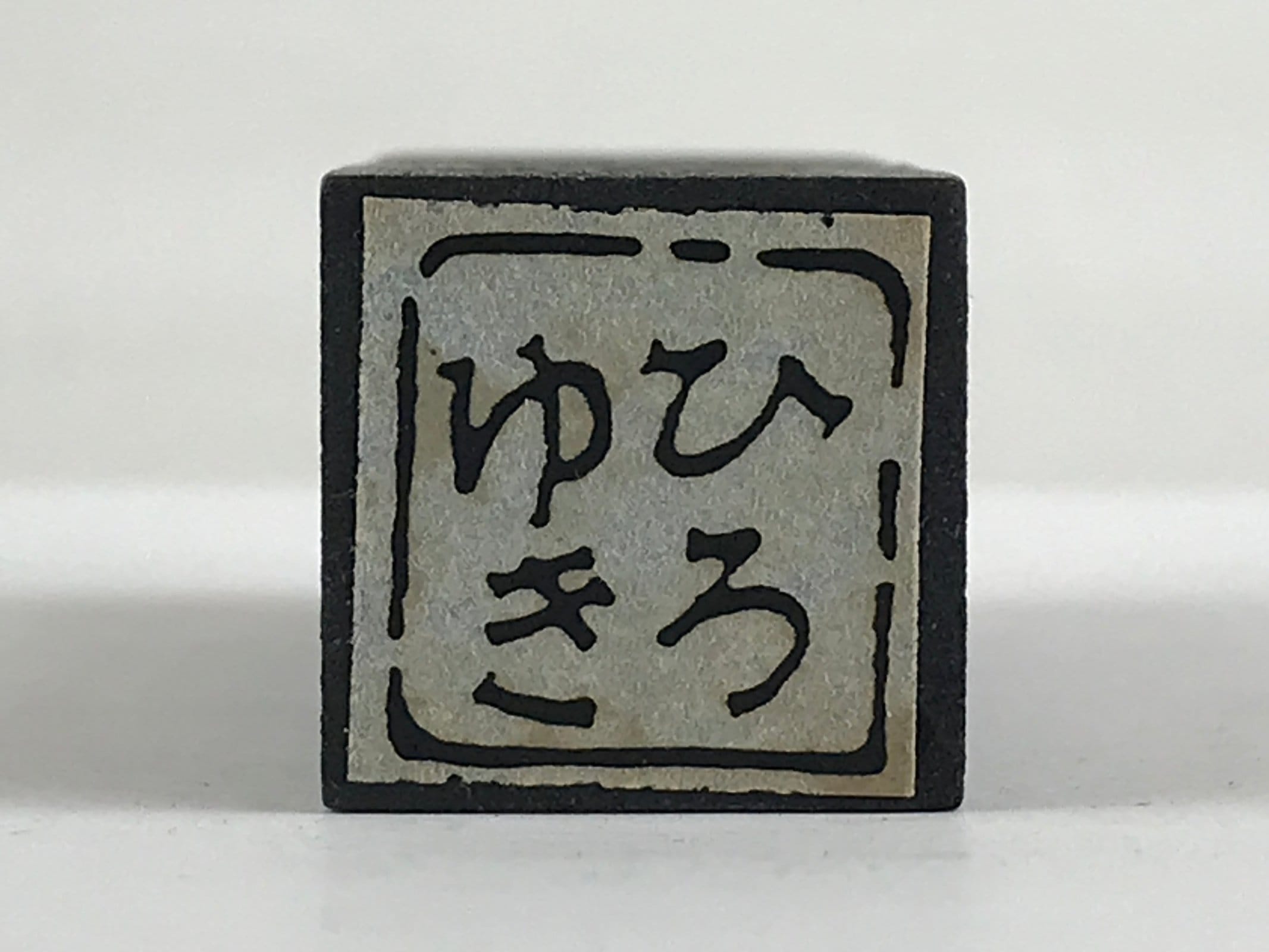 This is a vintage Japanese wood stamp, Hanko. A piece of wood has a rubber stamp on it with the Japanese male name “Hiroyuki”. The wood is painted black. The stamp is in very good condition.