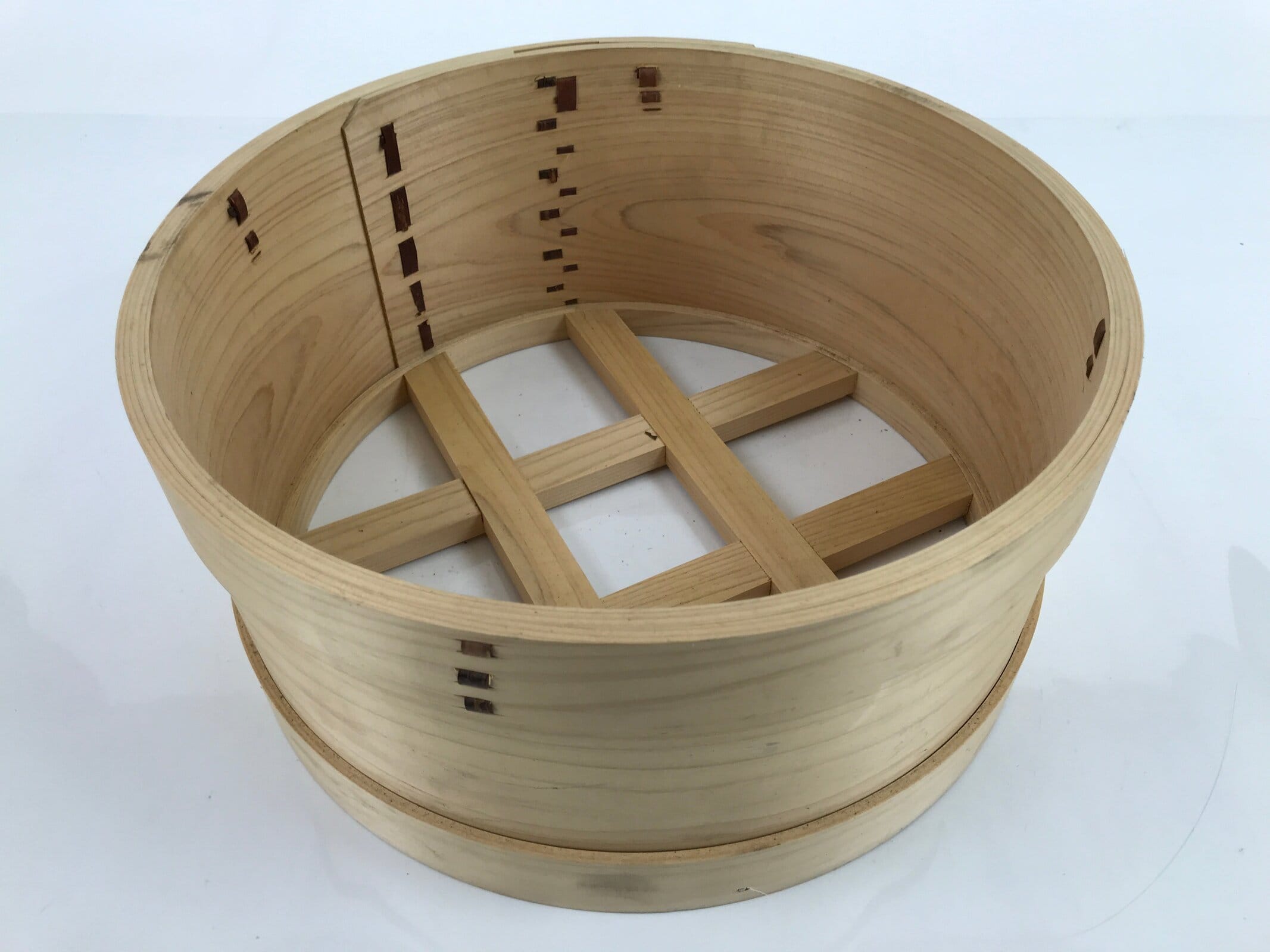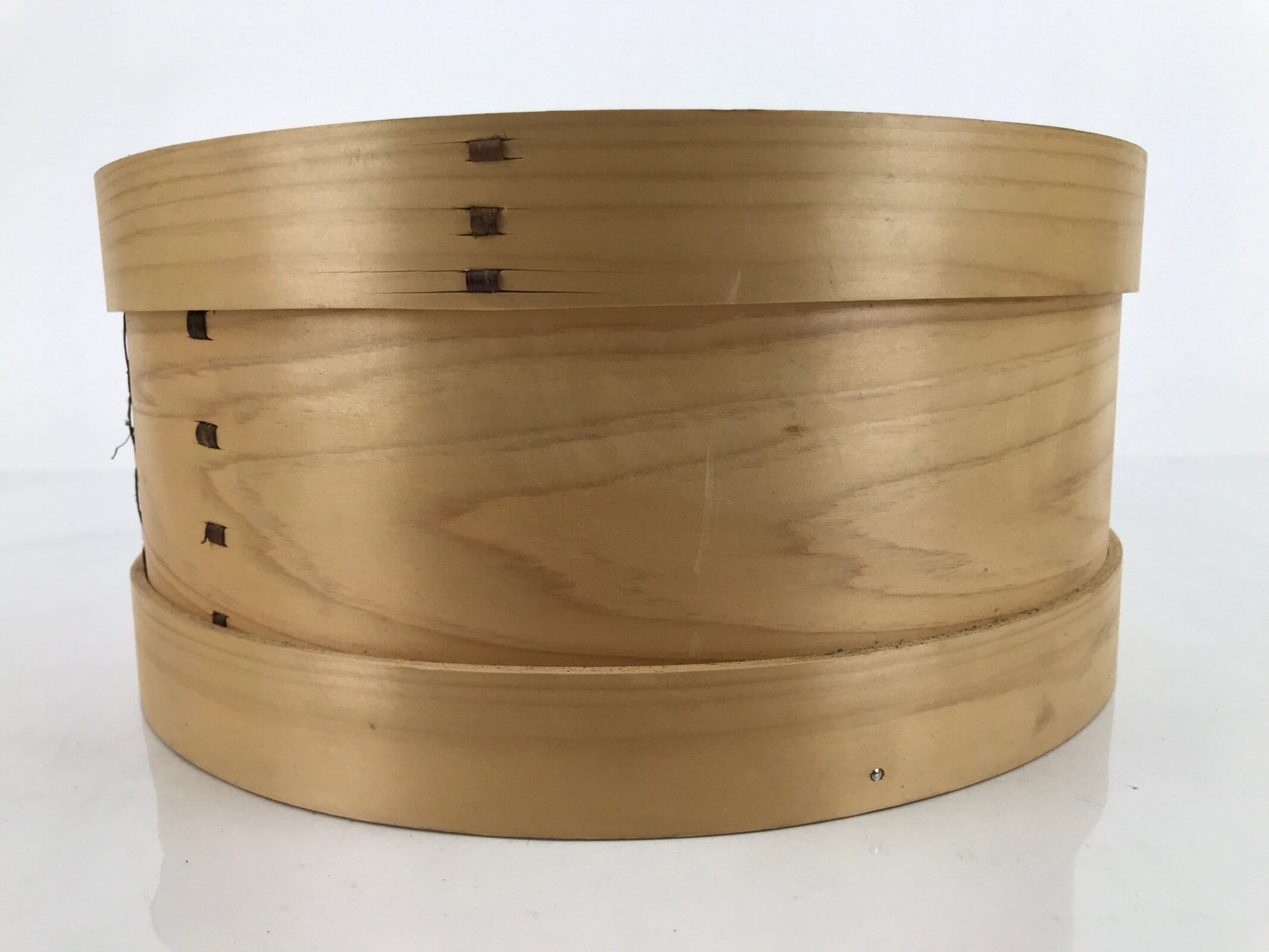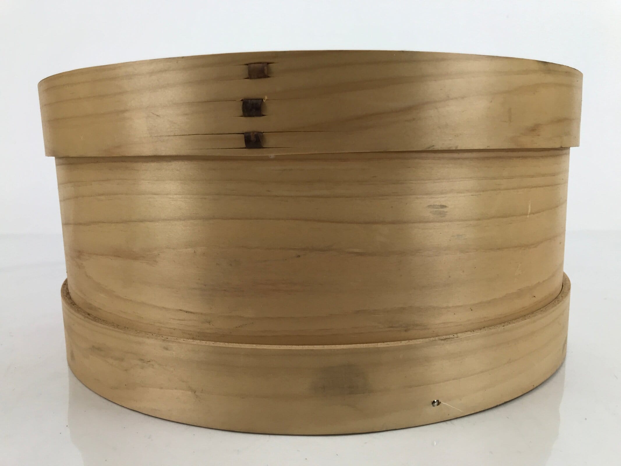 This vintage Japanese wooden steamer, or seiro, is made of wood and has a mat made of bamboo on the inside. It is a natural wood brown color.