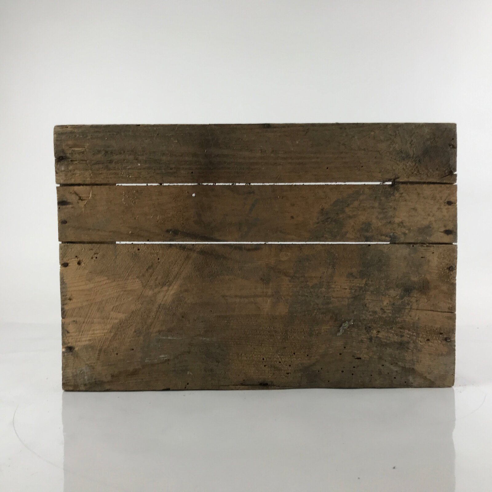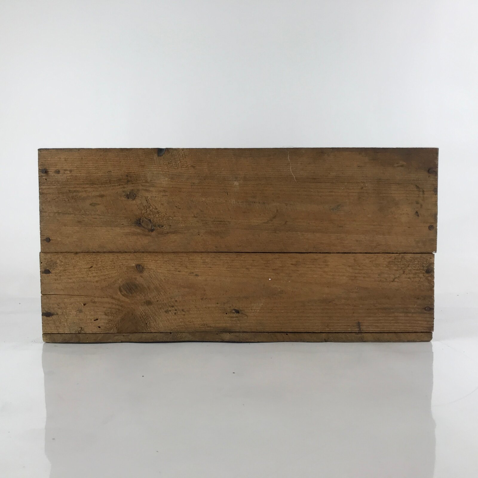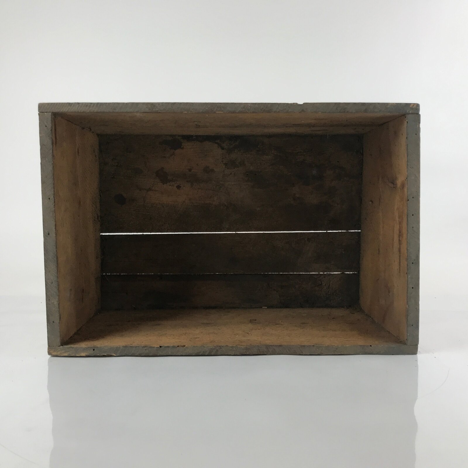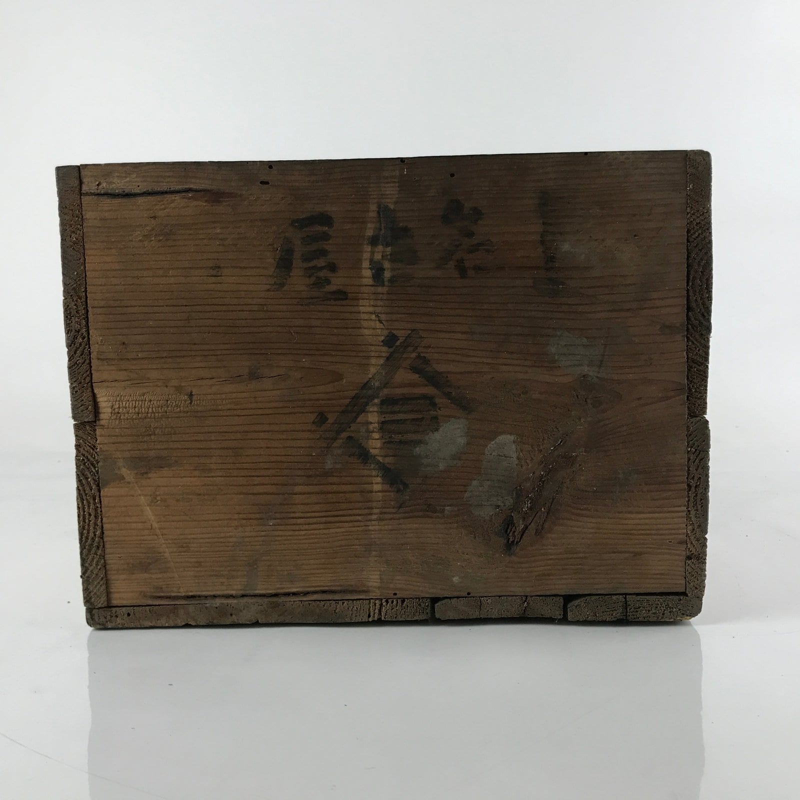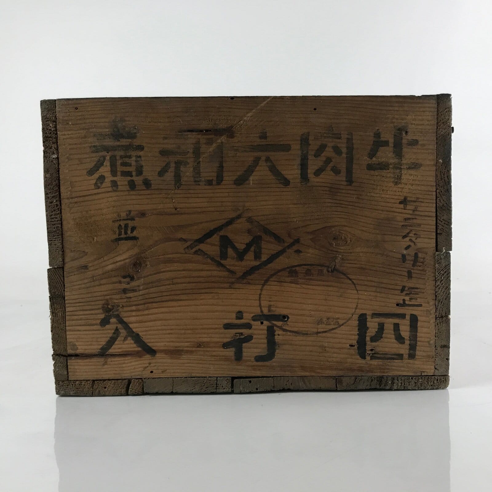 This is a vintage Japanese open wooden crate. It was once used to ship food to stores and restaurants. It may have had a lid at one time, but it is missing. It is a very sturdy box with thick-cut panels of wood.