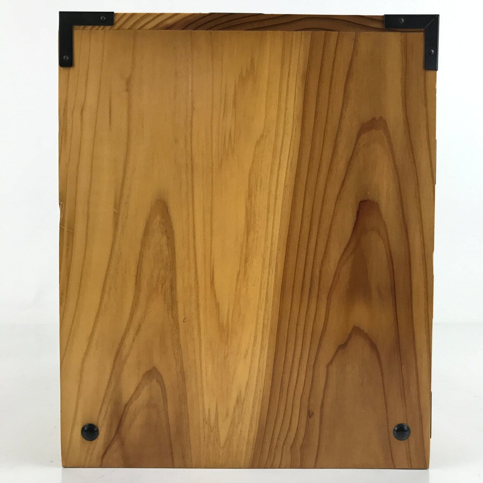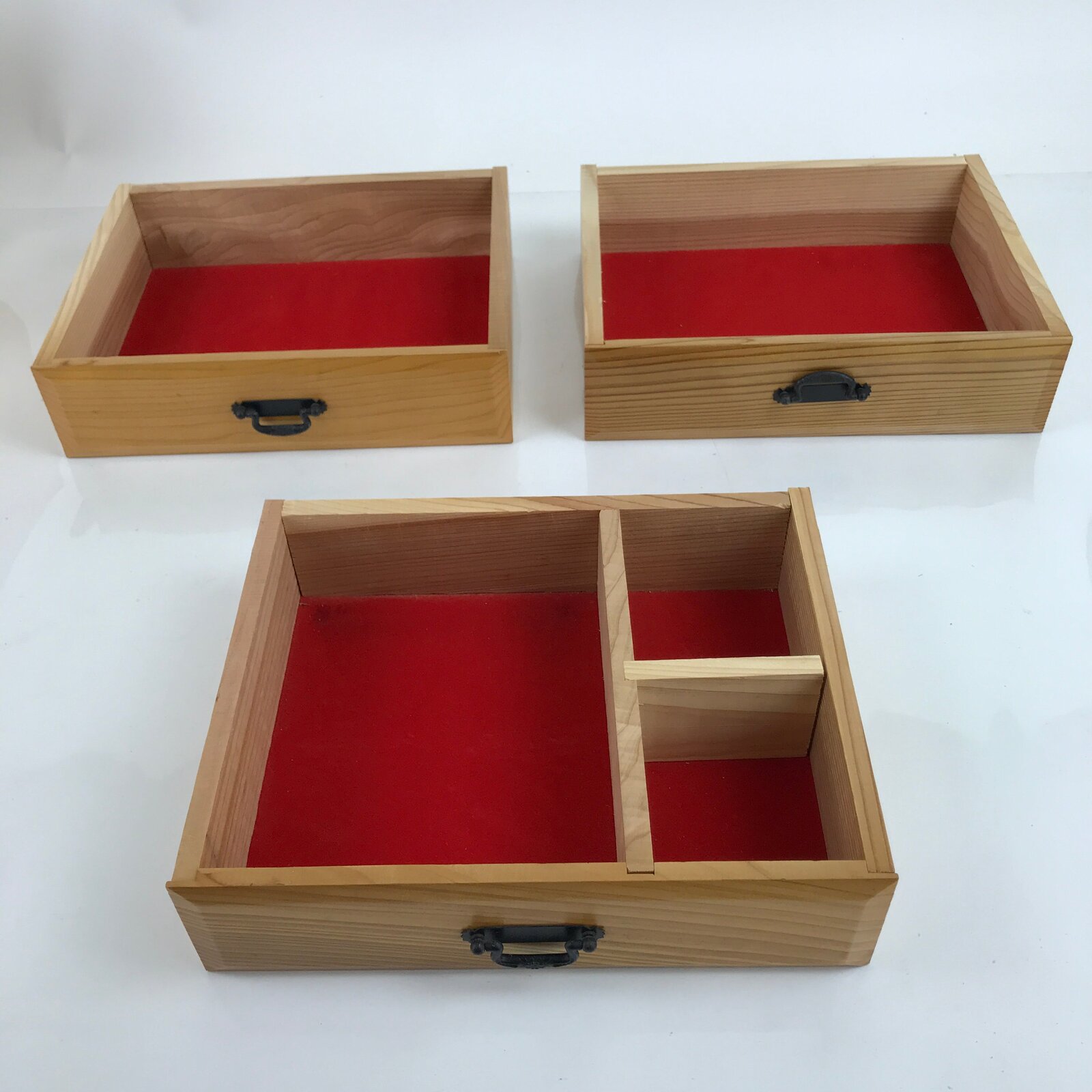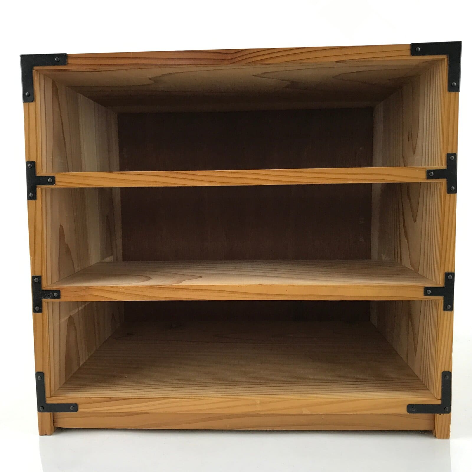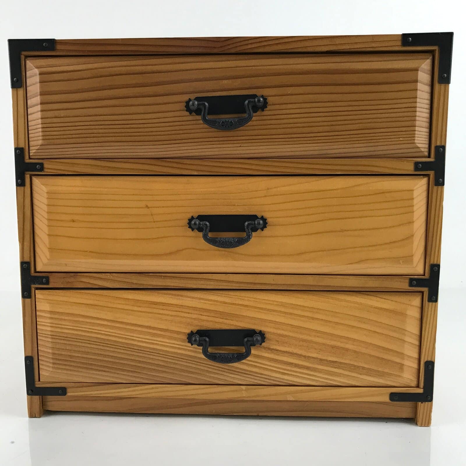 This is a Japanese storage chest, also called tansu. A natural brown color, this small chest has three wide drawers with metal handles. The insides of the drawers are lined with a red fabric. The corners of the box have black metal accents. This beautiful tansu chest can be used for storing sewing supplies, jewelry, or other trinkets.