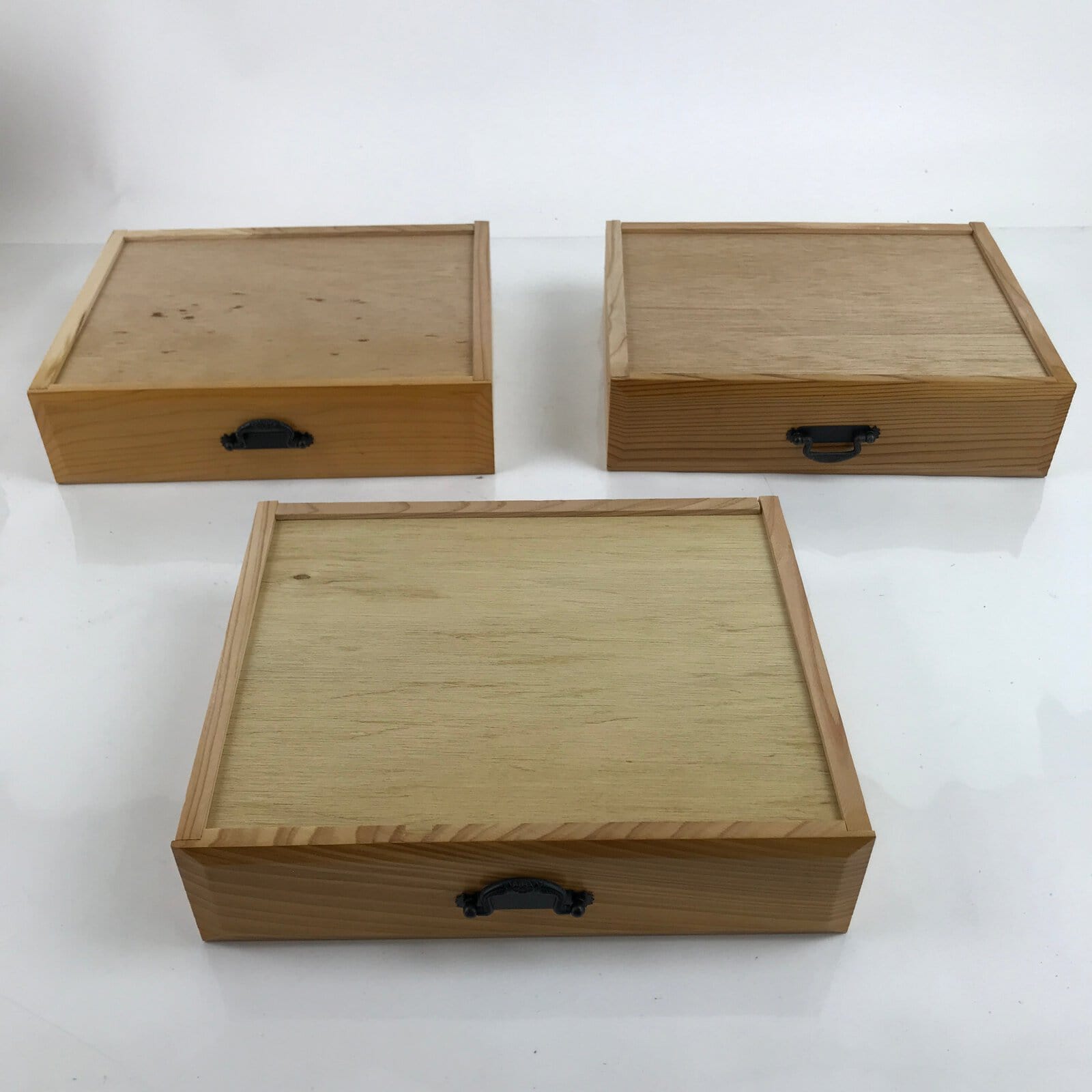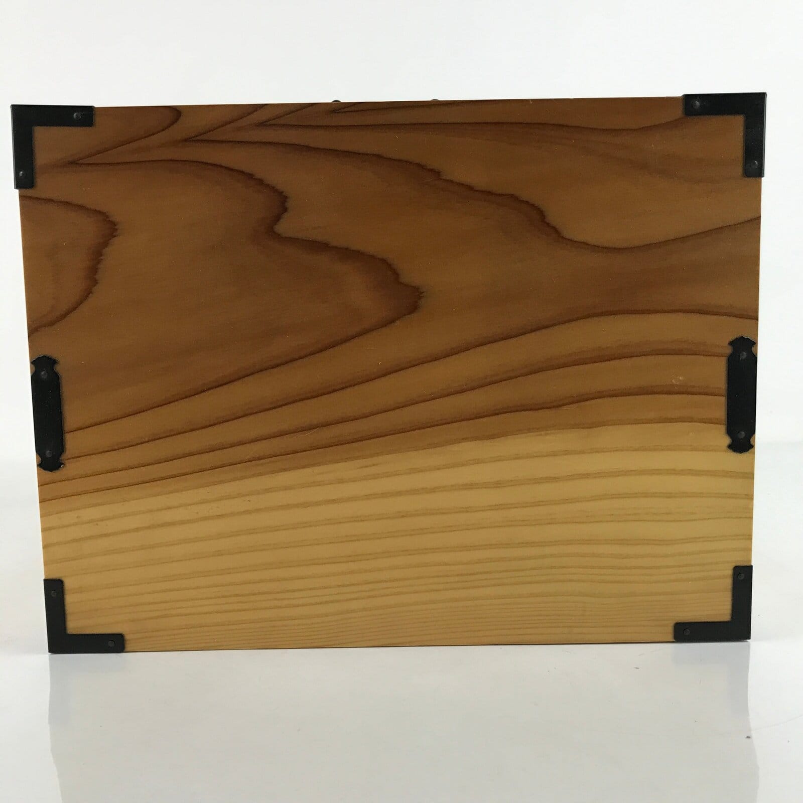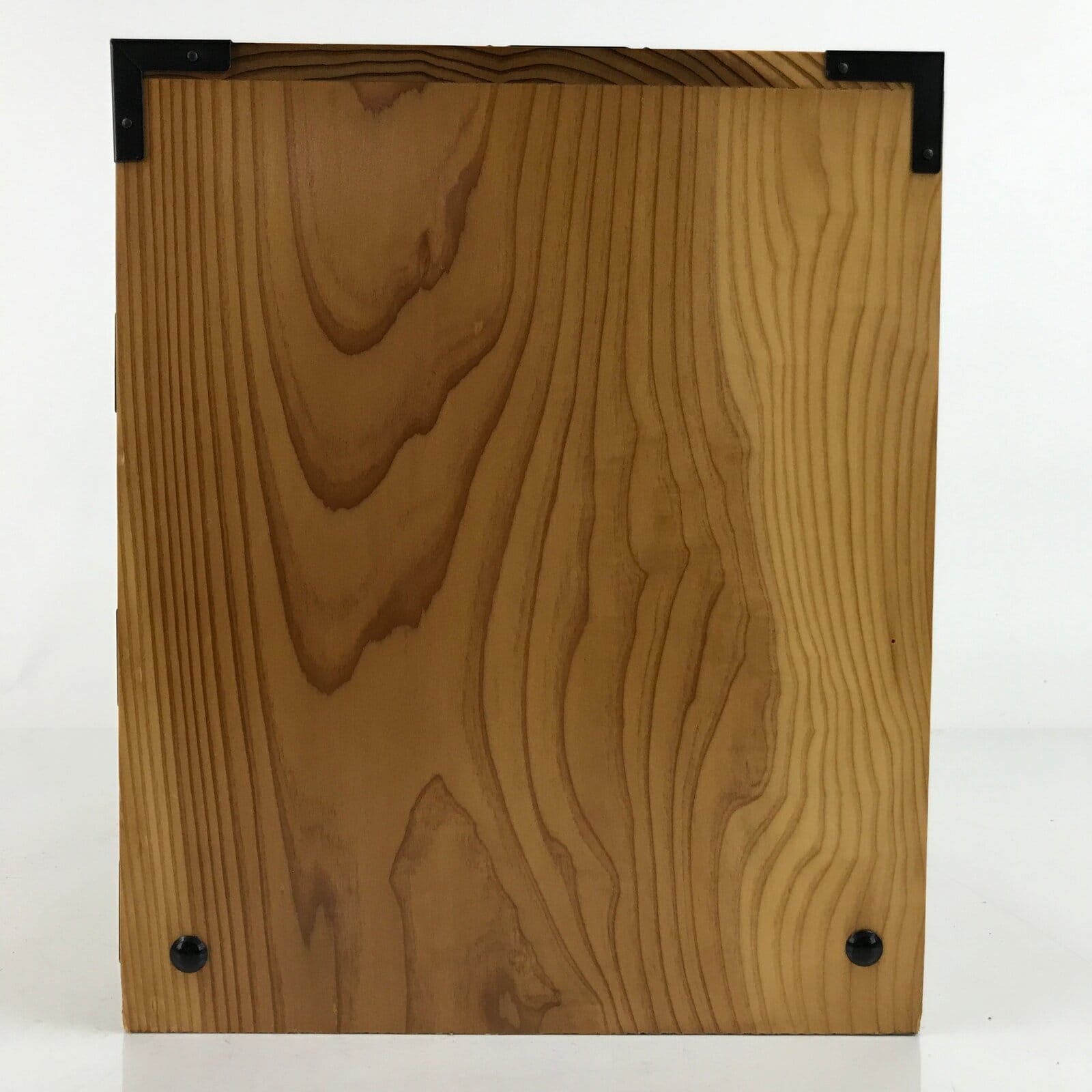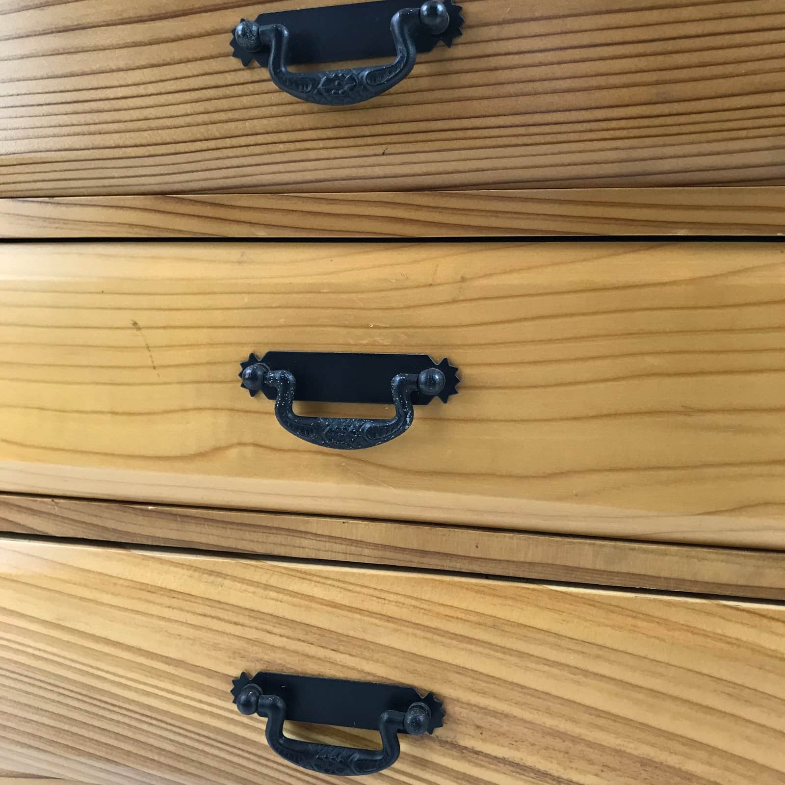 This is a Japanese storage chest, also called tansu. A natural brown color, this small chest has three wide drawers with metal handles. The insides of the drawers are lined with a red fabric. The corners of the box have black metal accents. This beautiful tansu chest can be used for storing sewing supplies, jewelry, or other trinkets.