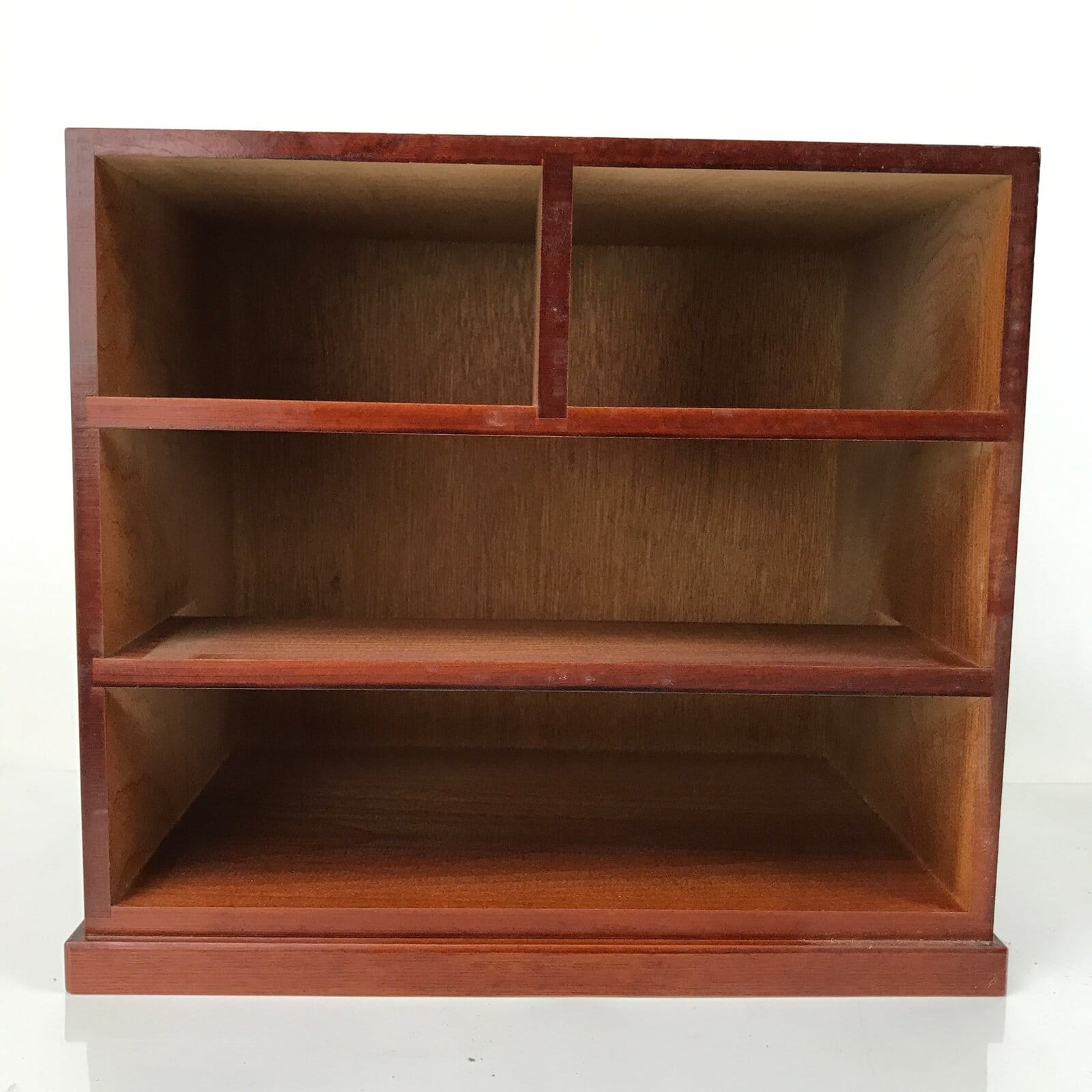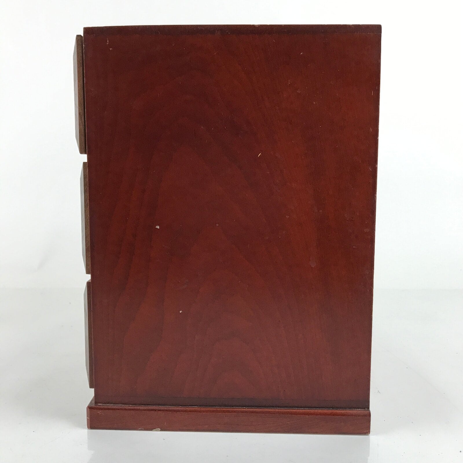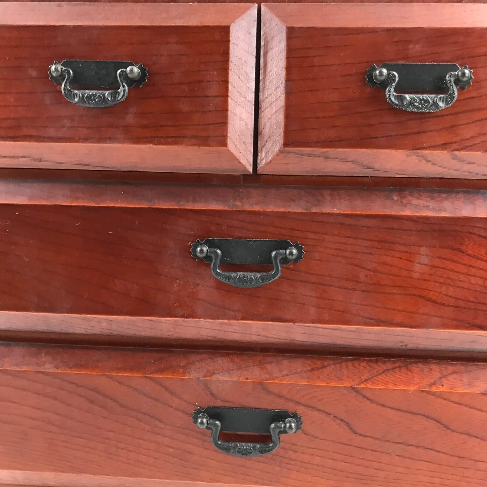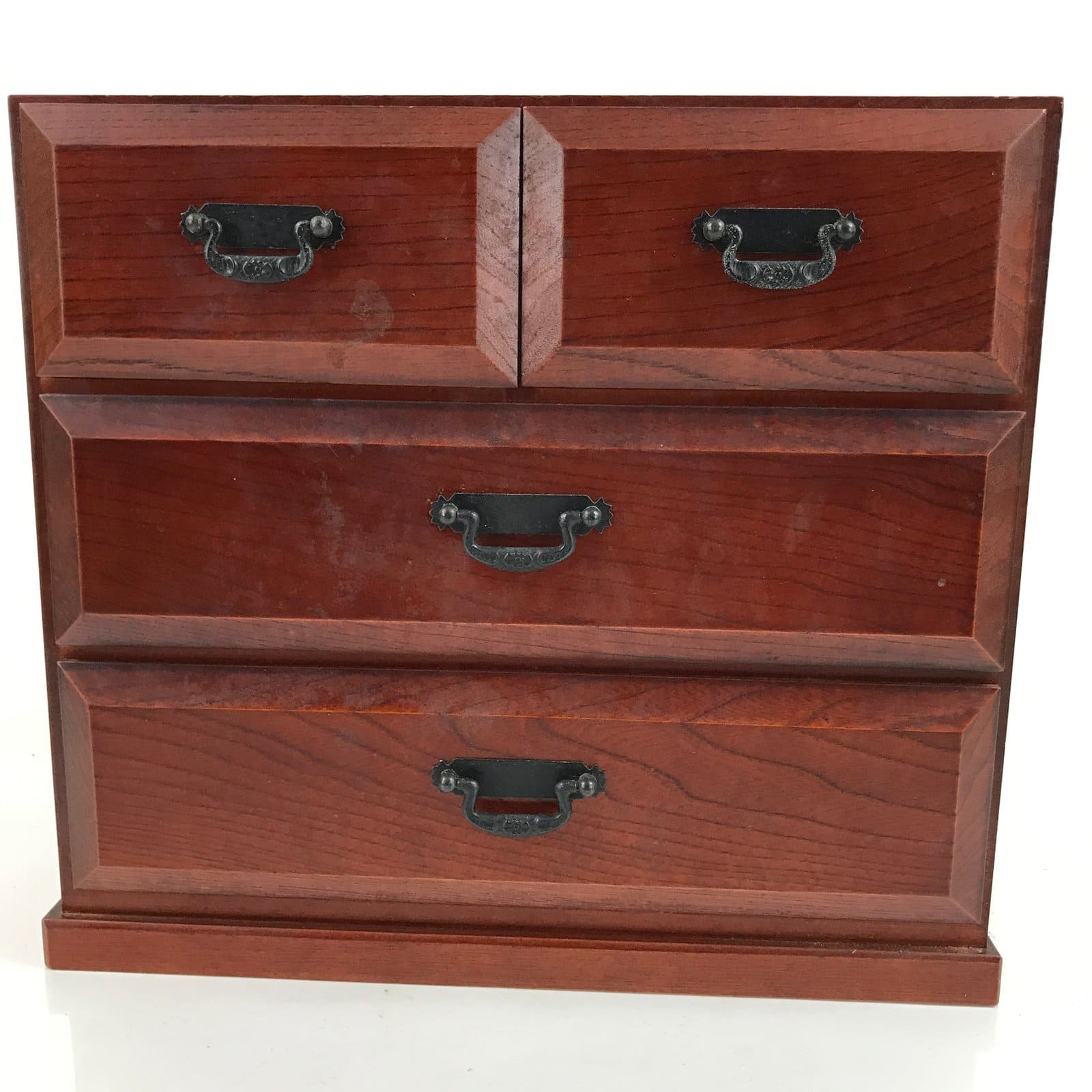 This is a Japanese storage chest, also called tansu. A rich reddish brown color, this small chest has two half-sized drawers and two full-sized drawers with metal handles. The insides of the drawers are lined with red fabric. This beautiful tansu chest can be used for storing sewing supplies, jewelry, or other trinkets.