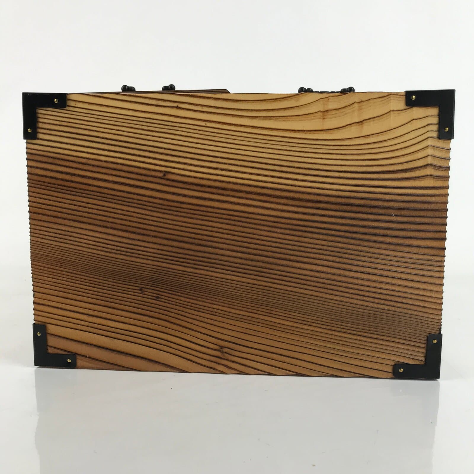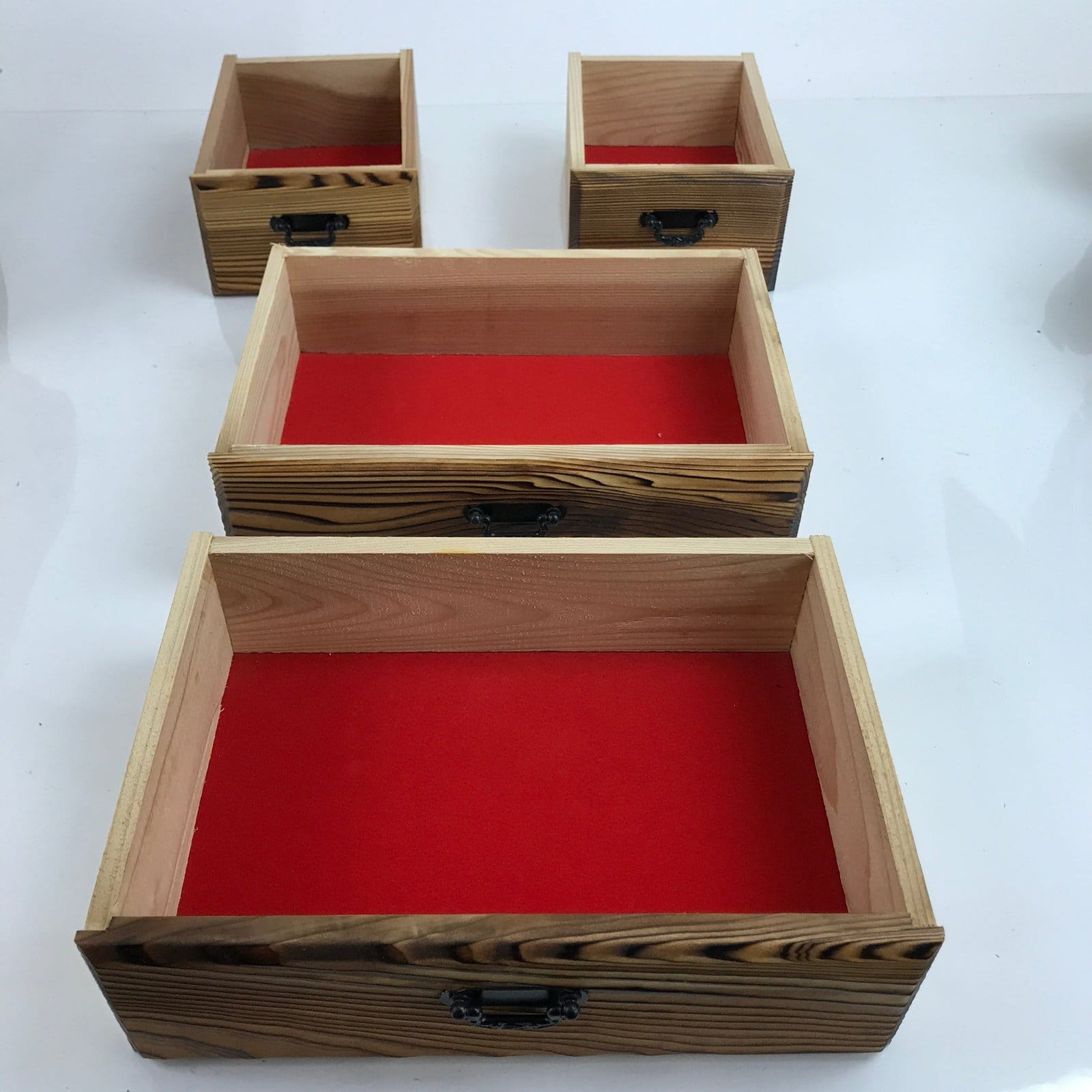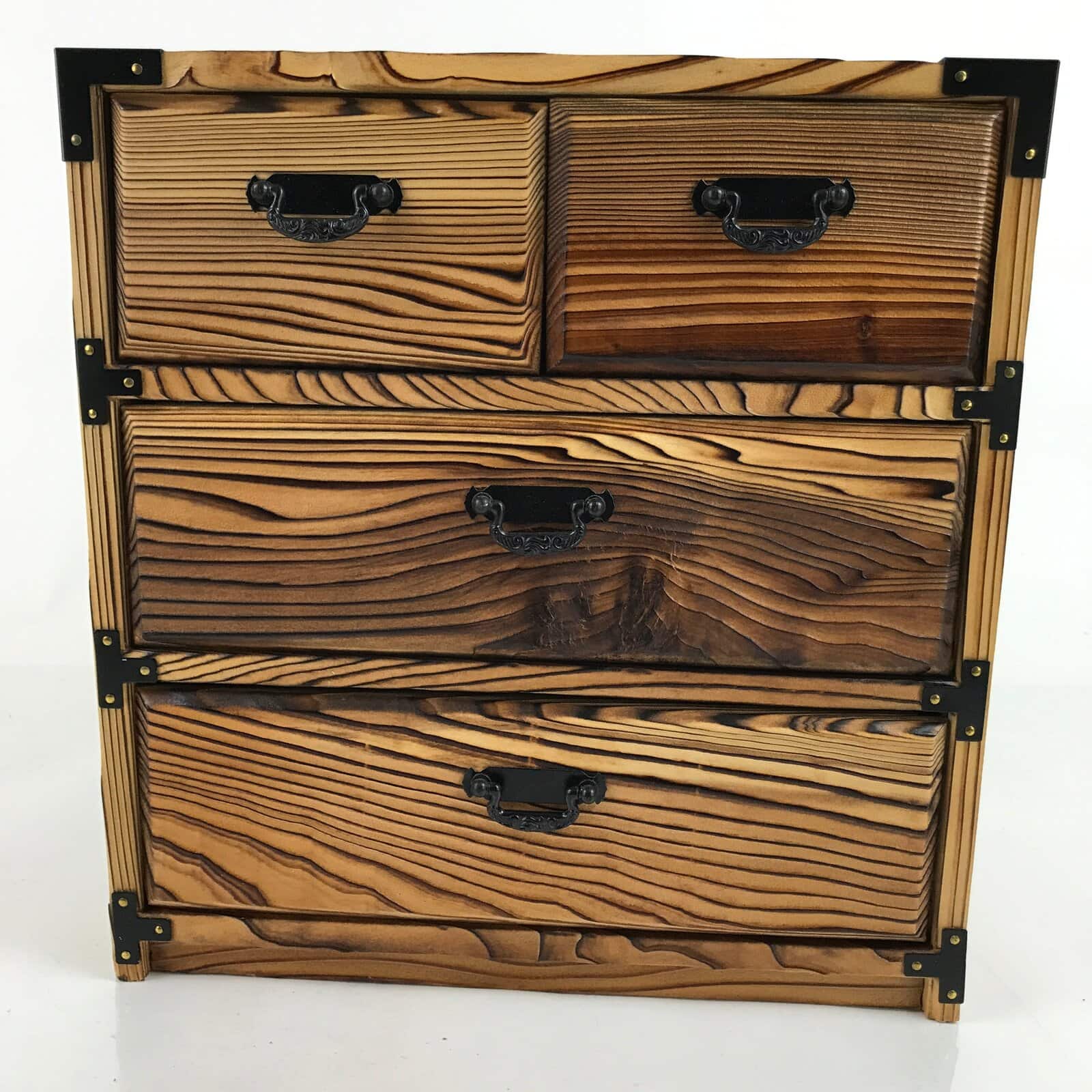 This is a Japanese storage chest, also called tansu. A natural brown color, this small chest has two half-sized drawers and two full-width drawers with metal handles. The insides of the drawers are lined with a red fabric. The corners of the box have black metal accents. This beautiful tansu chest can be used for storing sewing supplies, jewelry, or other trinkets.