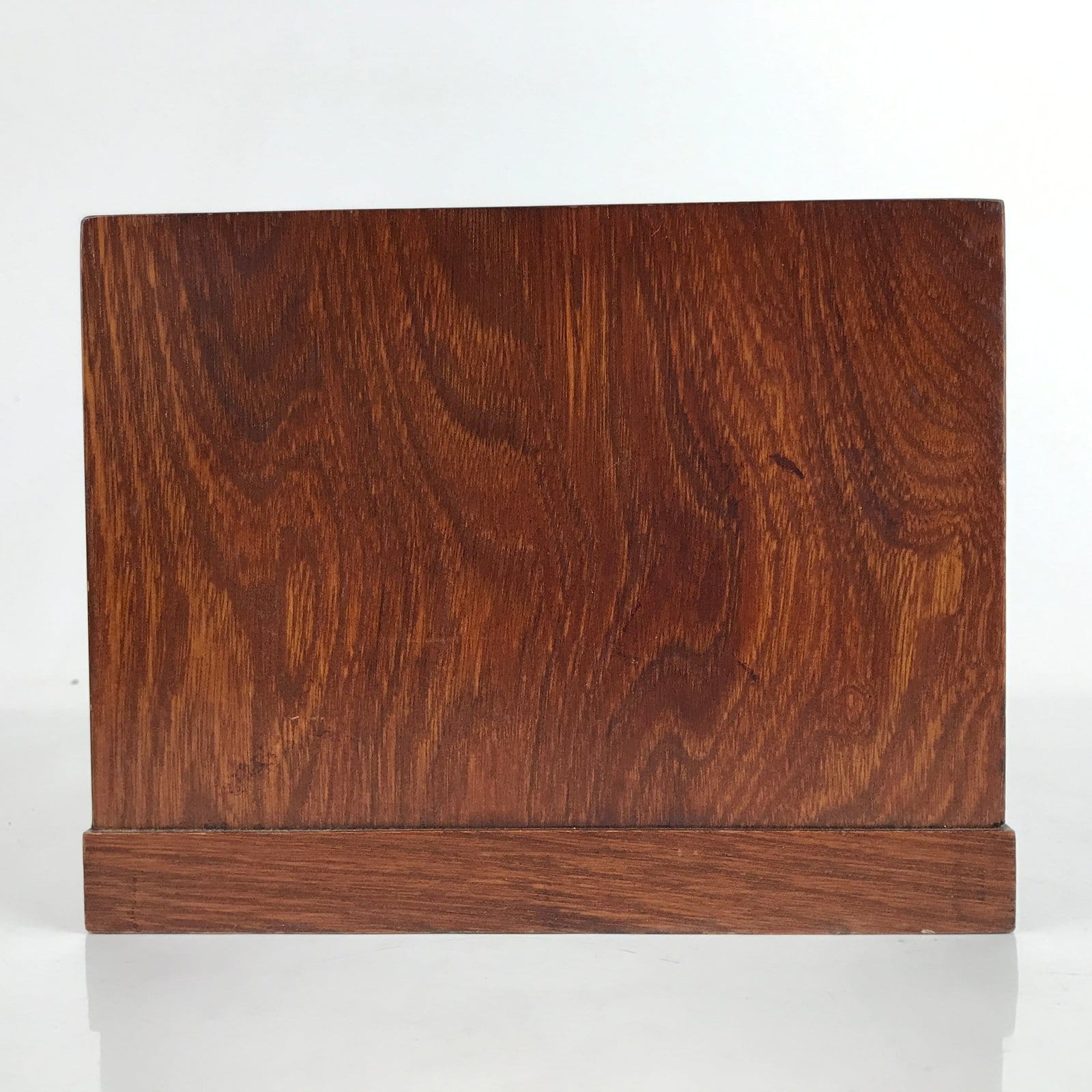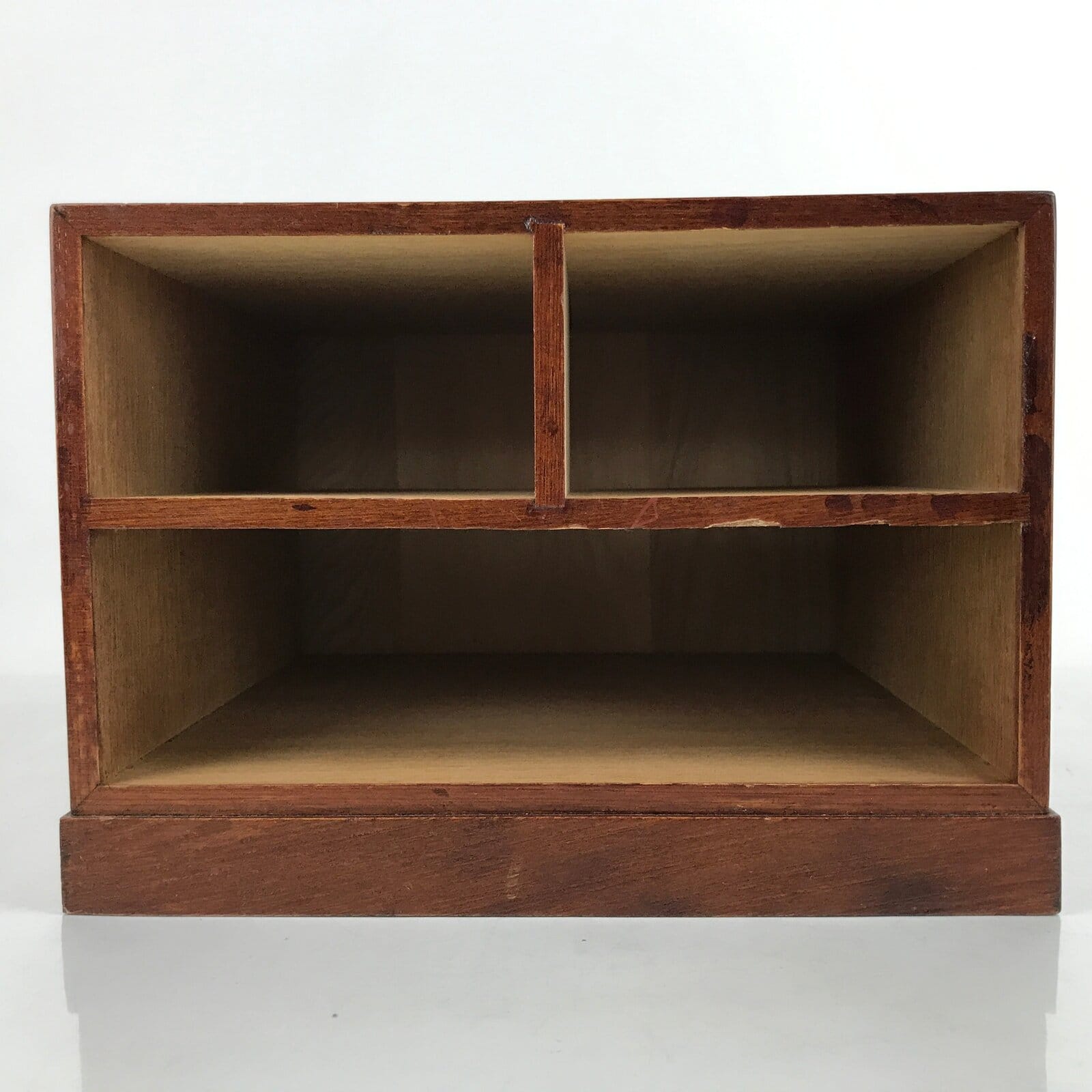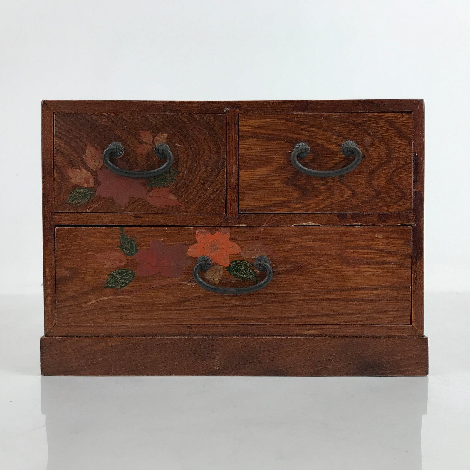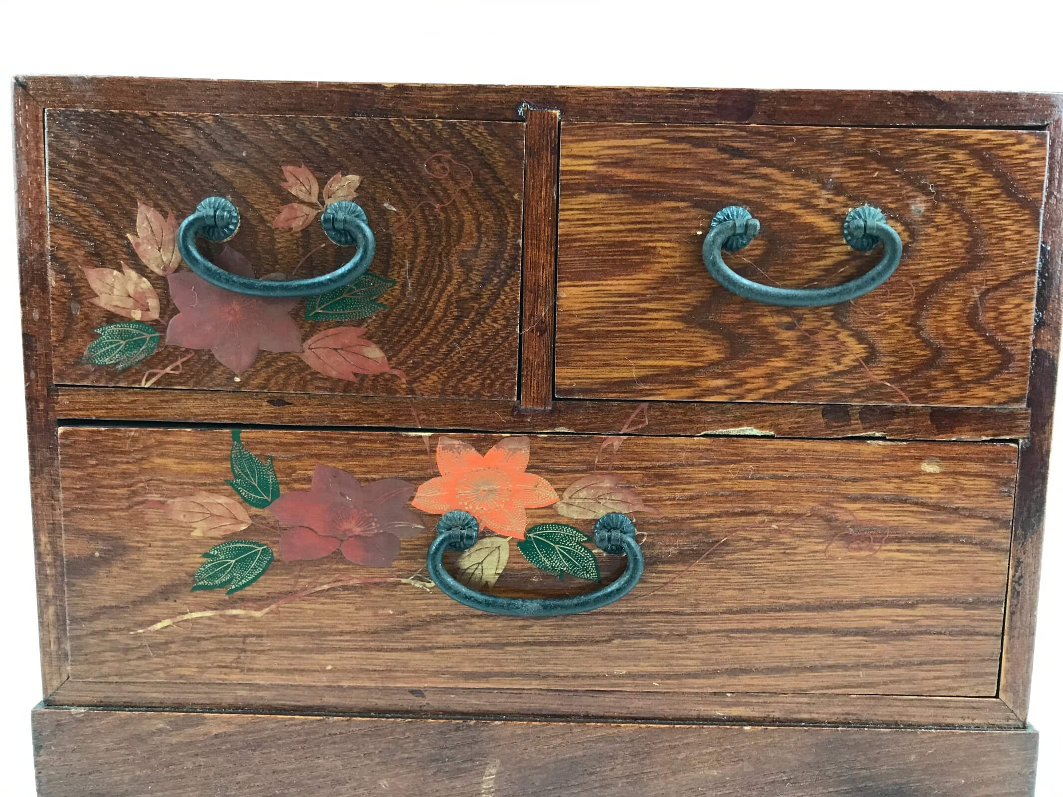 This is a vintage Japanese storage chest, also called tansu. A rich brown color with a clear brushed lacquer coat, this small chest has two half-sized drawers and one full-sized drawer with simple metal handles and a beautiful makie picture of kikyo (bellflower/balloon flower) in red, orange, and gold with green leaves. The insides of the drawers are unlined. This beautiful tansu chest can be used for storing sewing supplies, jewelry, or other trinkets.