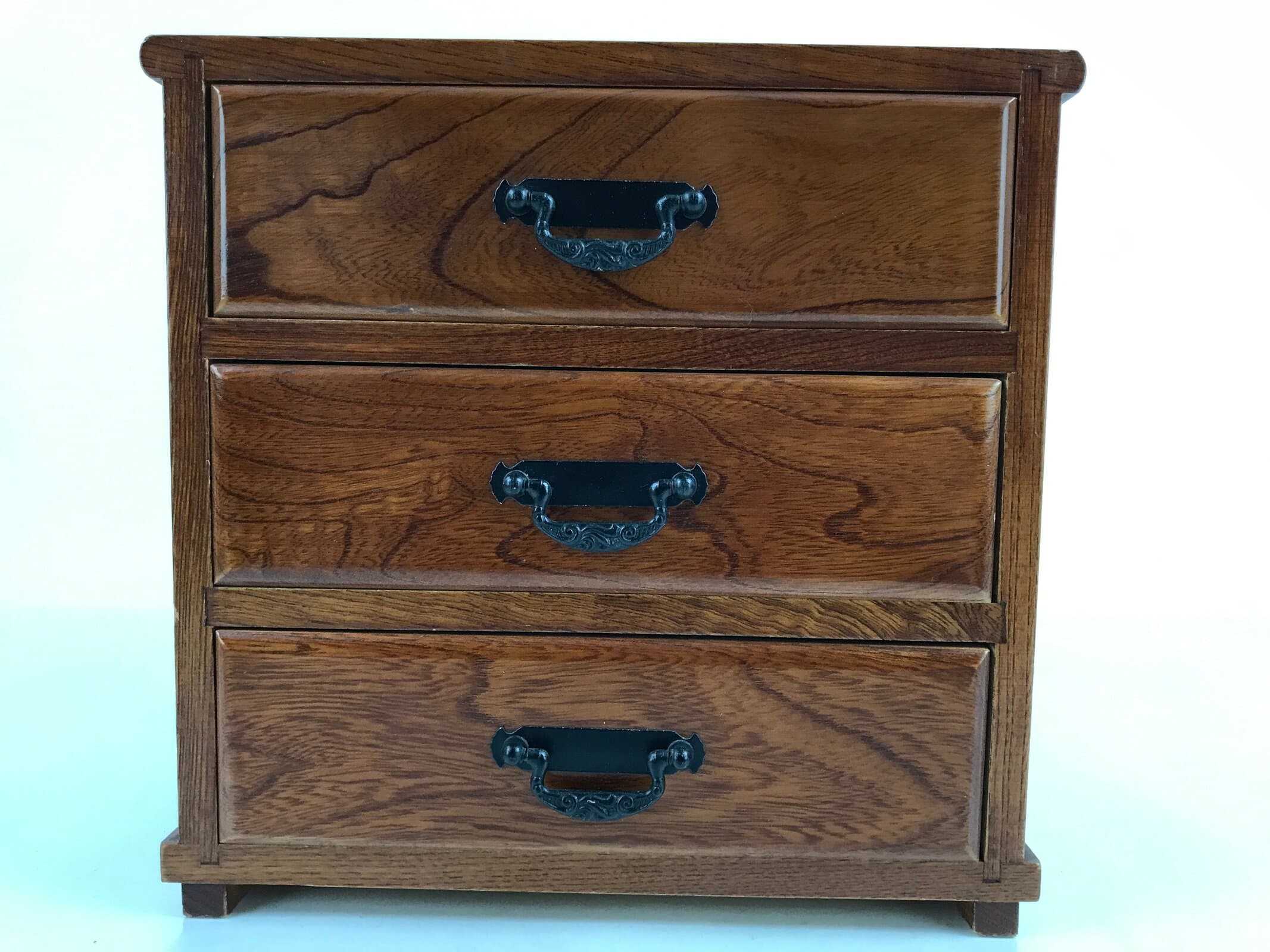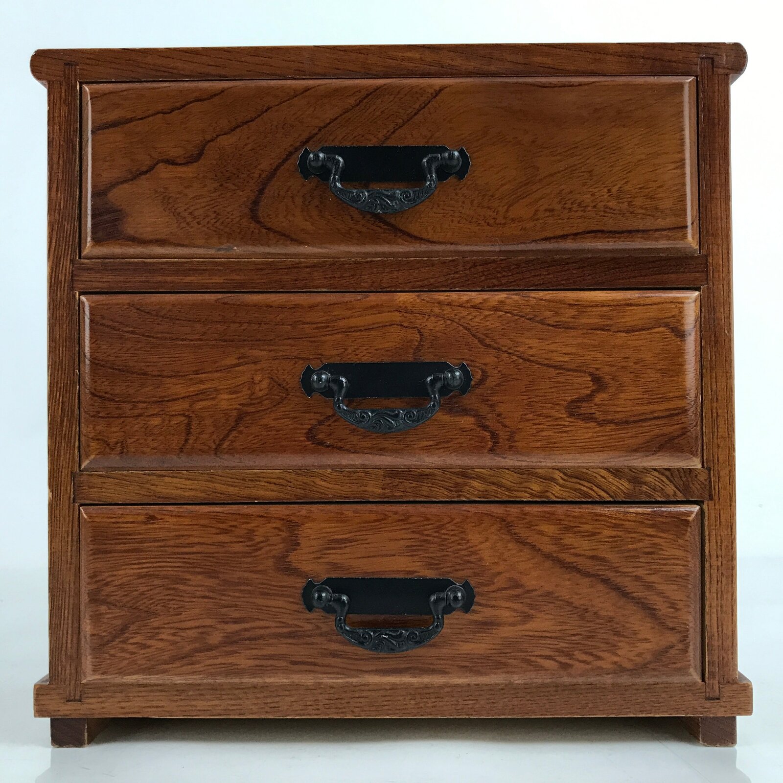 This is a vintage Japanese storage chest, also called tansu. A medium brown color with a clear brushed lacquer finish and an overall simple design, this small chest has three same-sized drawers with decorative metal hardware. This beautiful tansu chest can be used for storing sewing supplies, jewelry, or other trinkets.
