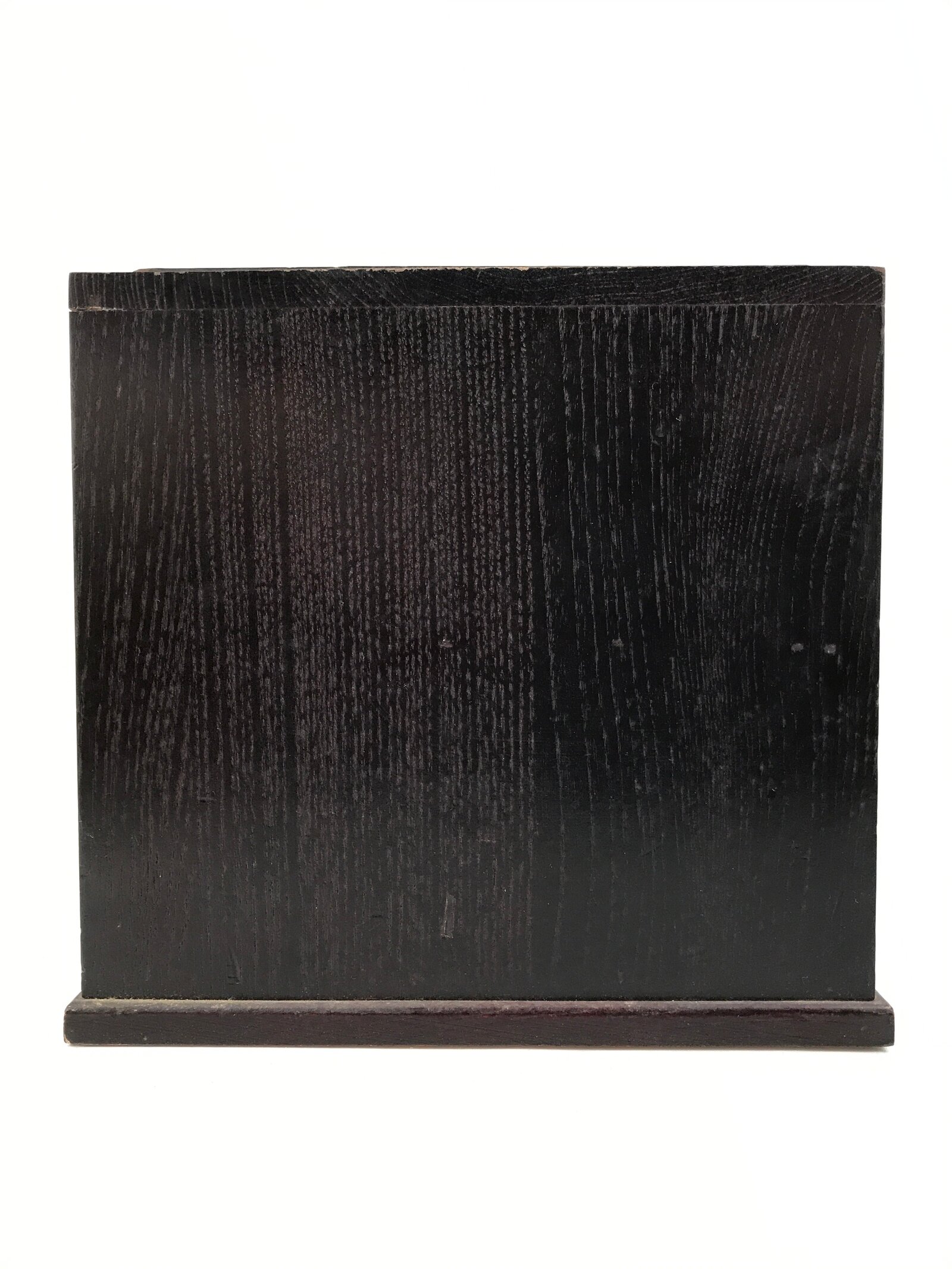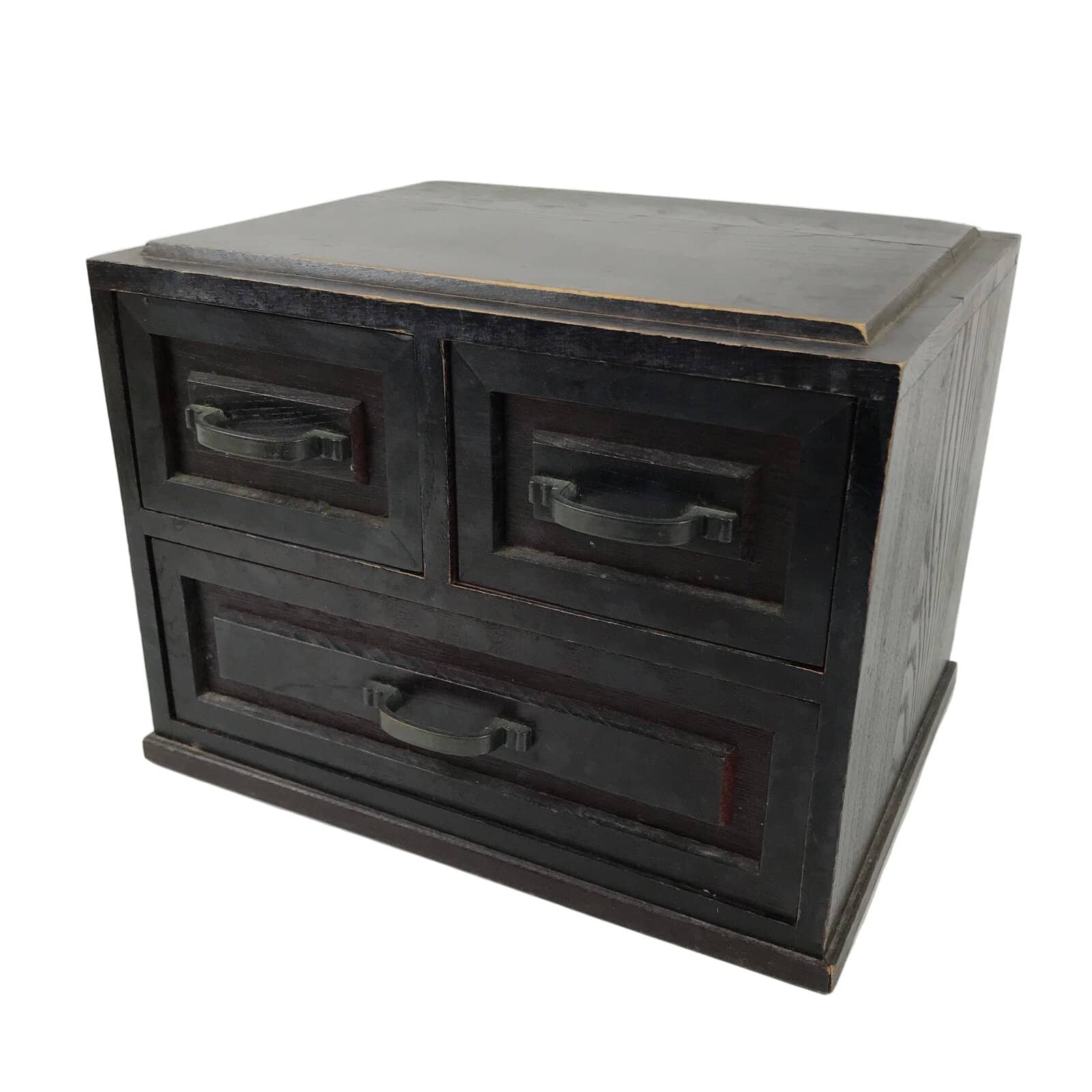 This is a Japanese storage chest, also called tansu. A rich dark brown color, this wooden chest has 3 small drawers with simple metal hardware. It is heavy and overall has a very angular design. This beautiful tansu chest can be used for storing sewing/crafting supplies, jewelry, or other trinkets.