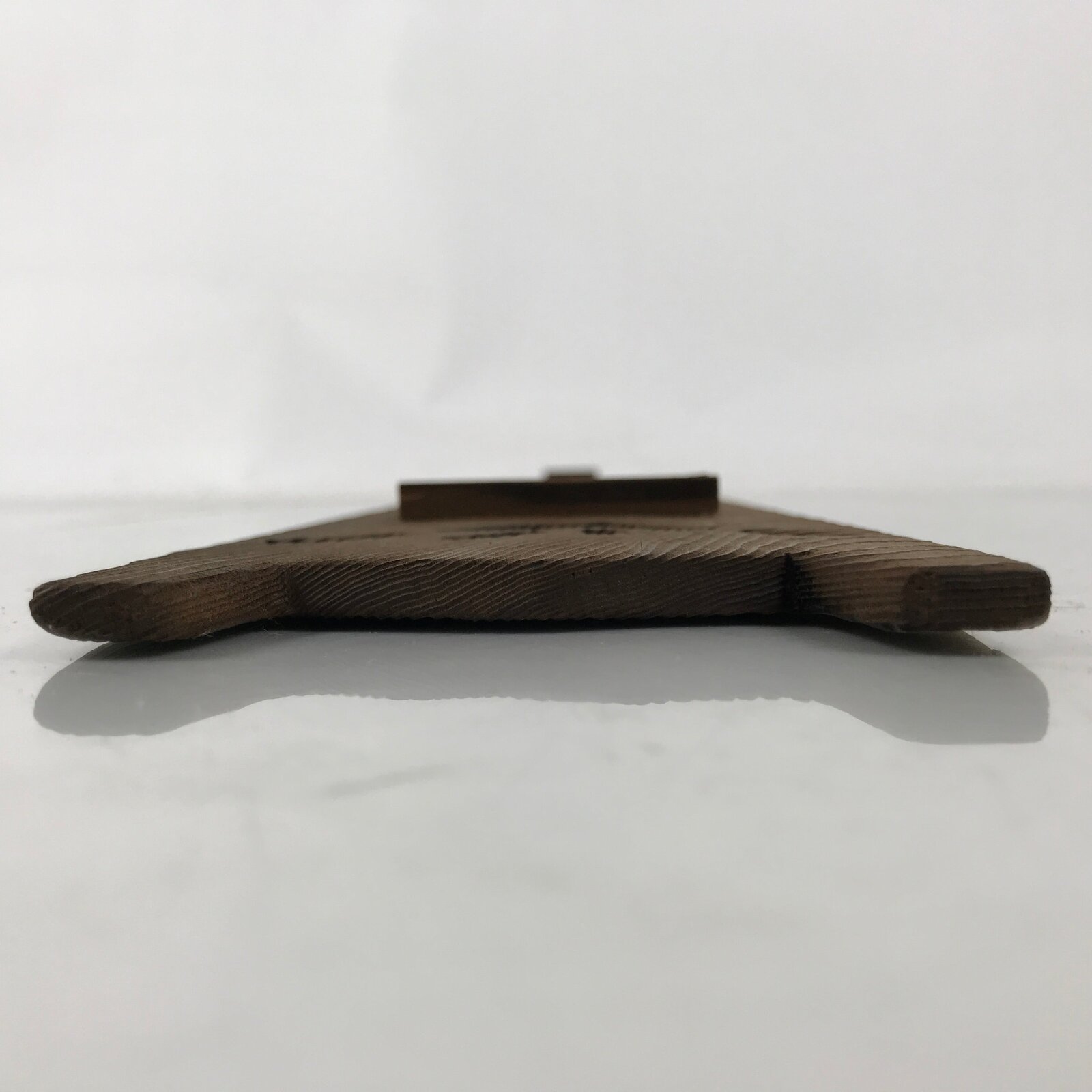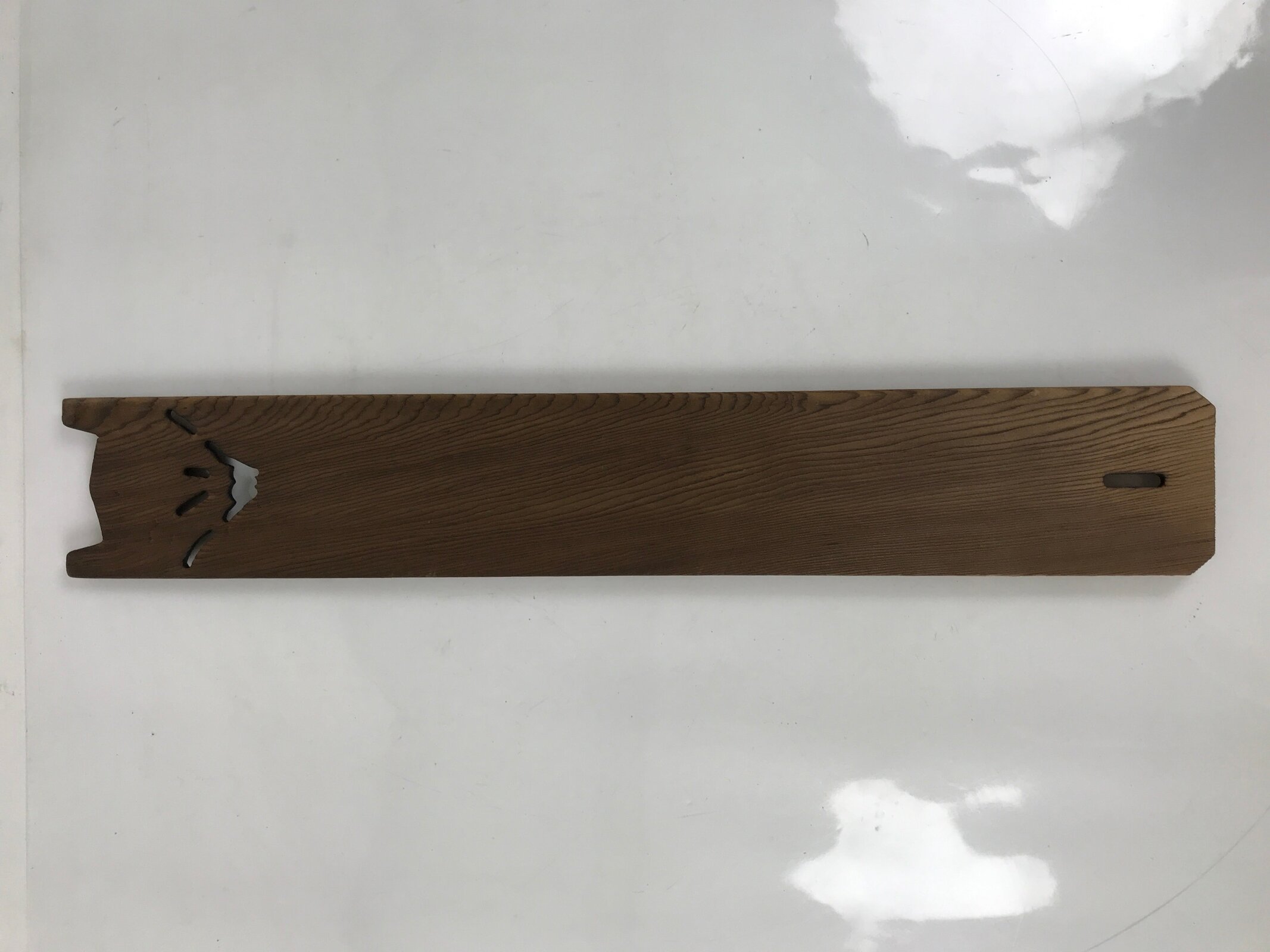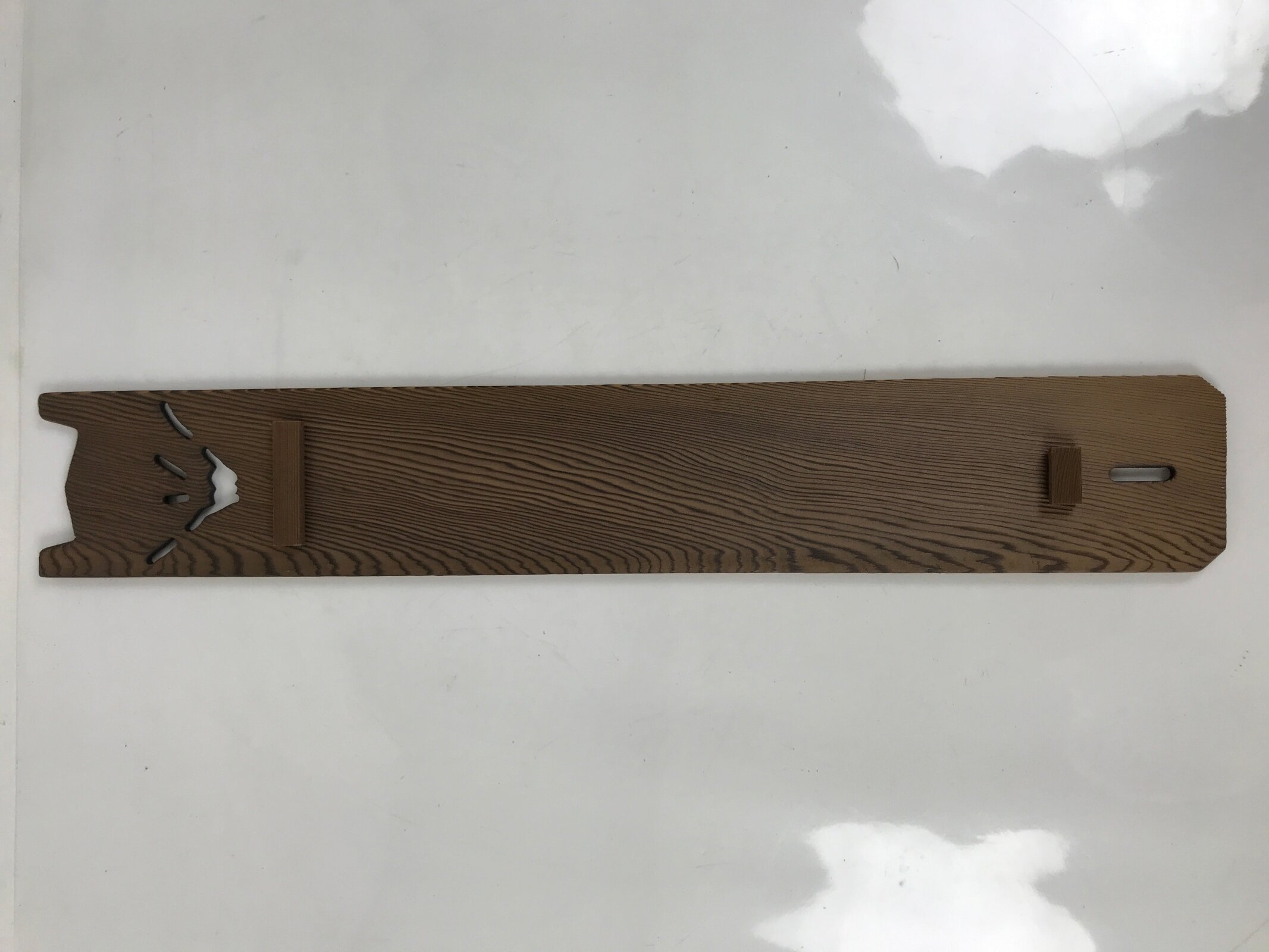 This is a vintage Japanese wooden wall hanging frame, tanzaku-kake. A tanzaku is a long and narrow shikishi used for painting and writing Japanese poems such as haiku or tanka. It has a cut-out Mt. Fuji design at the bottom. The narrow shikishi fits between two brackets.