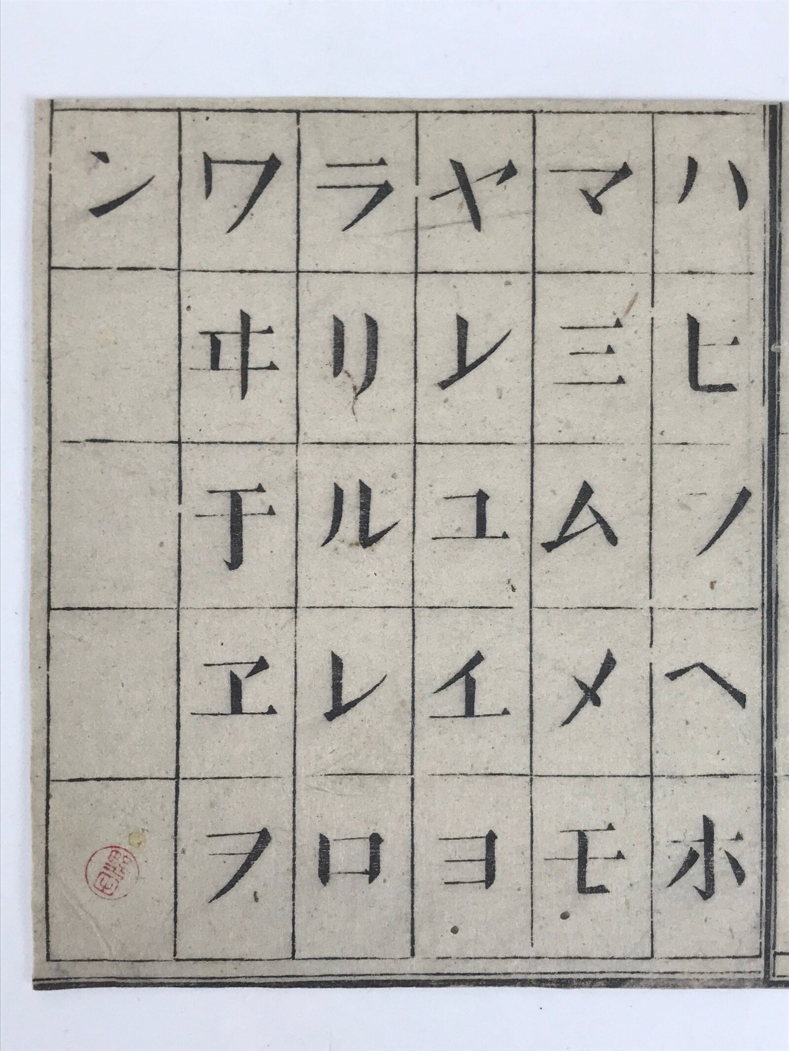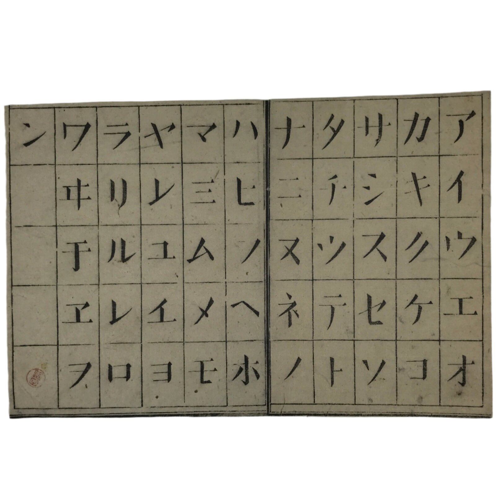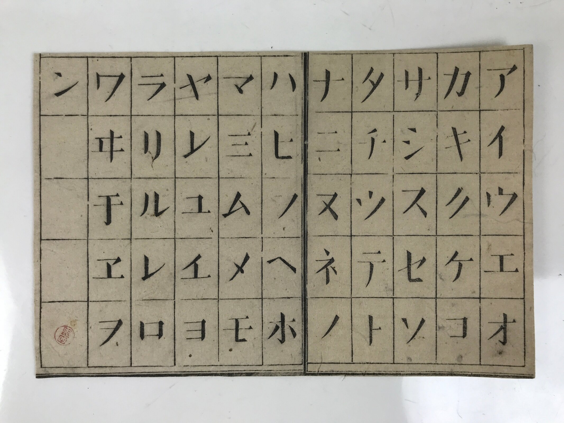 This vintage Japanese card features a woodblock-printed katakana chart featuring 51 characters used during the Meiji period. It has a personal seal printed in red ink, possibly the previous owner’s.