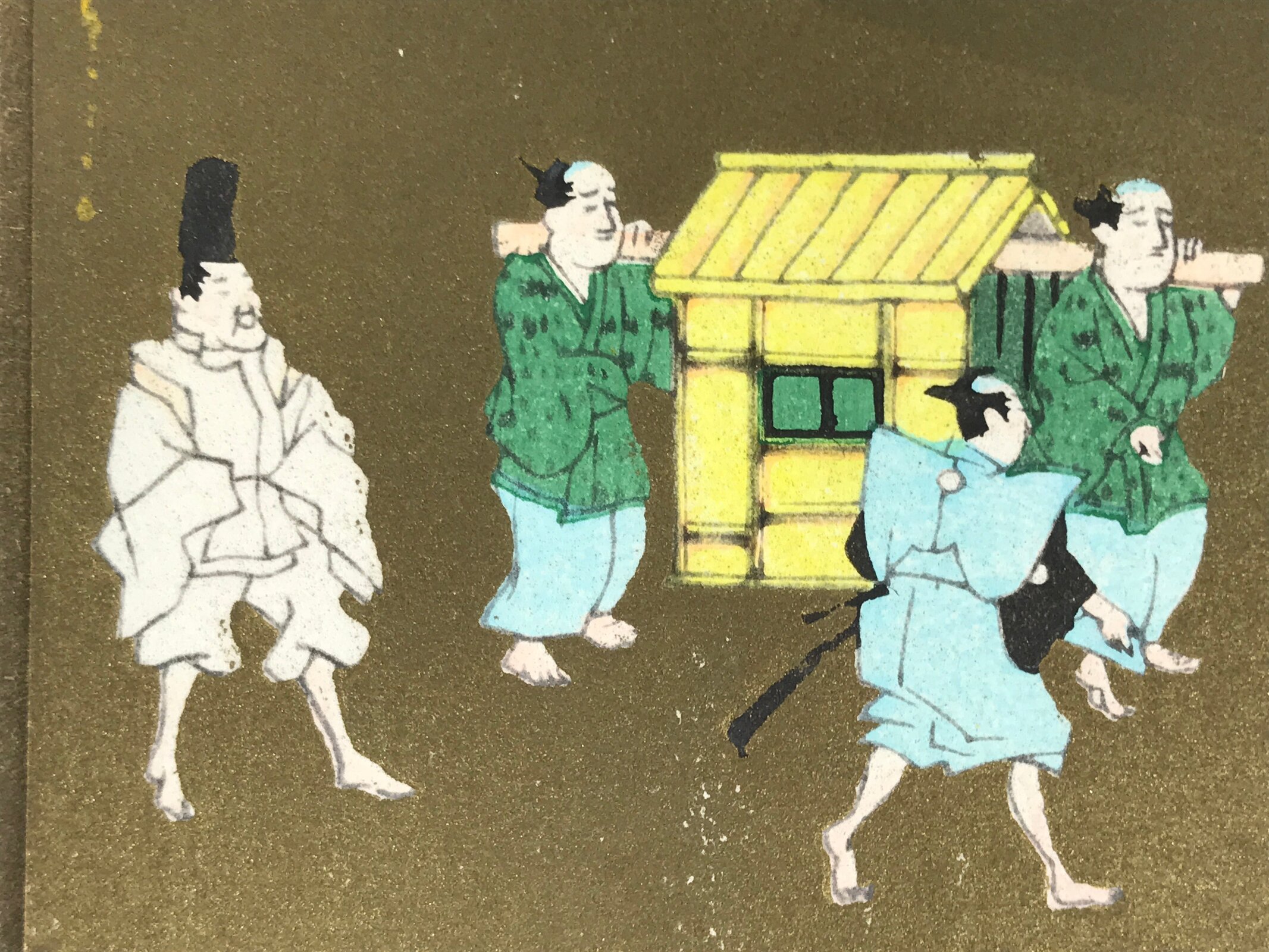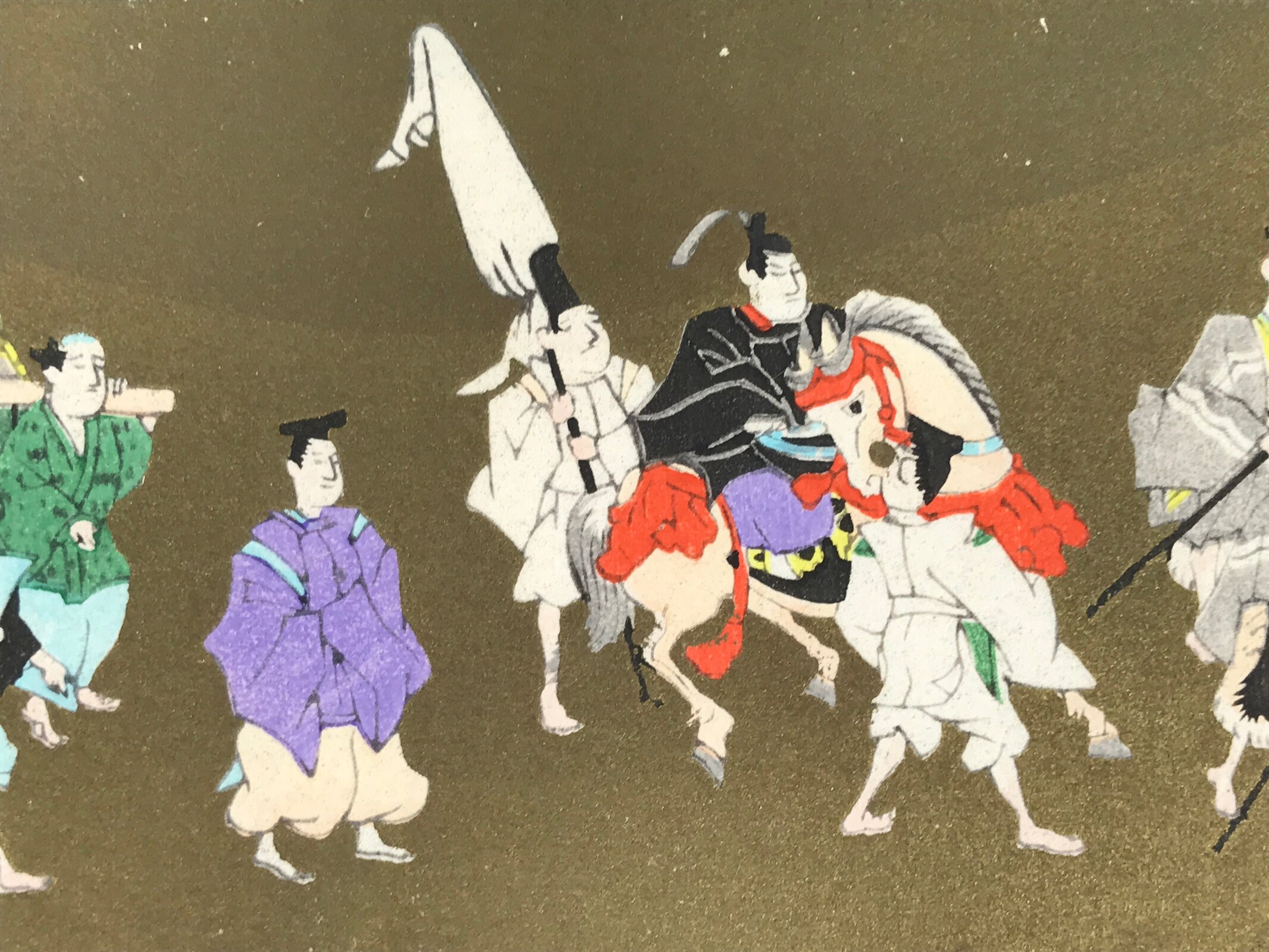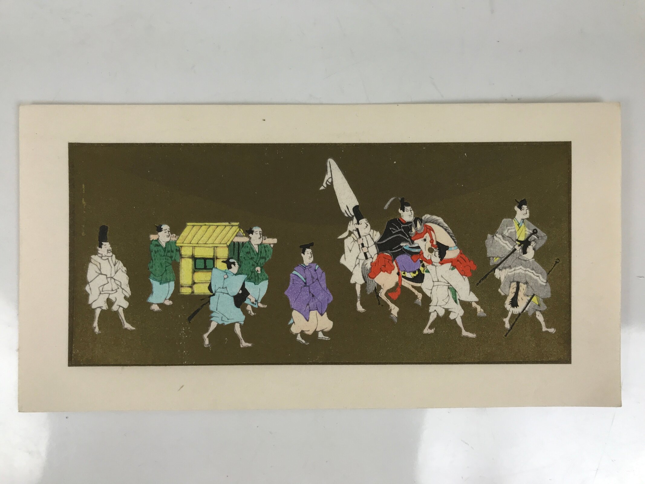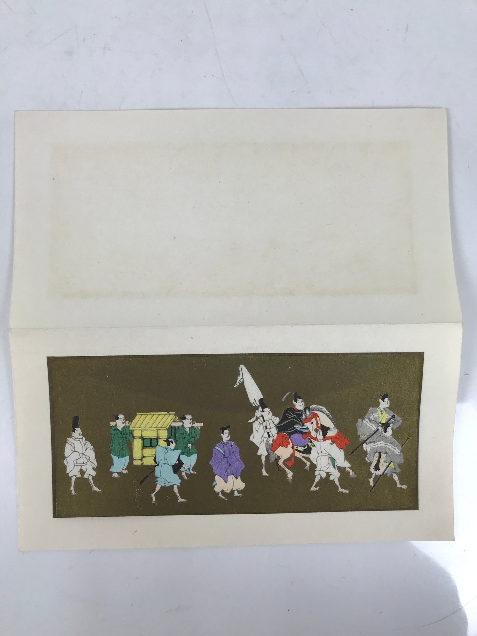 This vintage Japanese writing card features a colorful woodblock-printed artwork representing a procession of a daimyo (feudal lord) and his suite on a gold plain background. The artwork can be removed from the paper card. The inside of the card has white cranes printed on it. The card paper is folded in four.