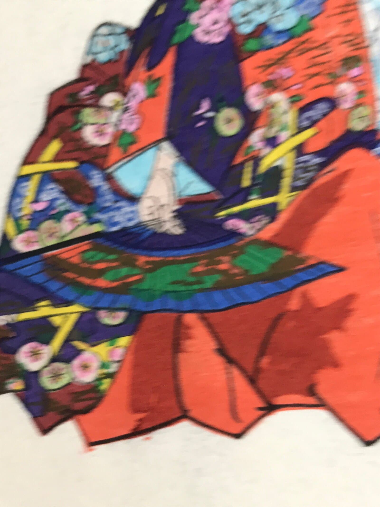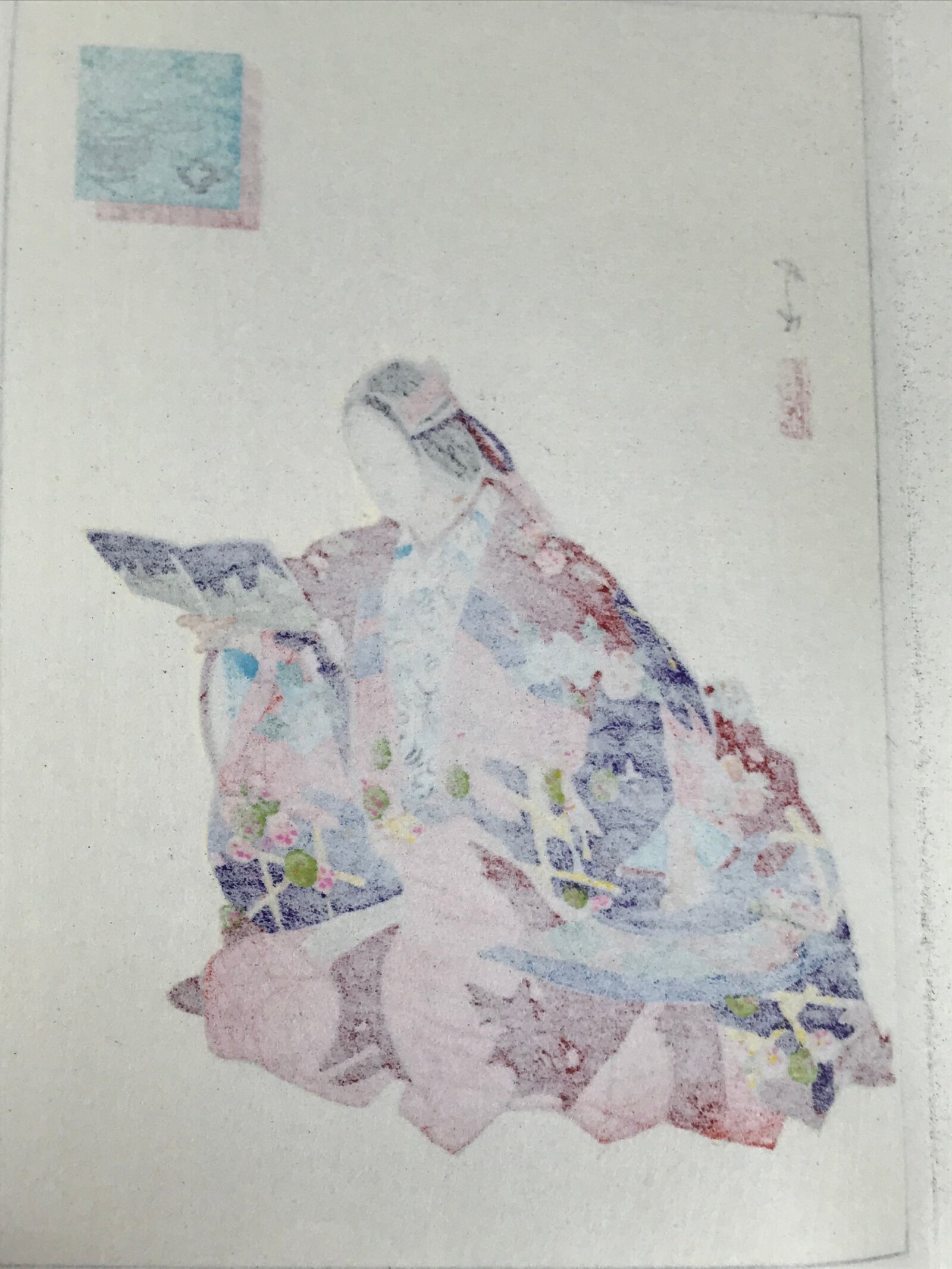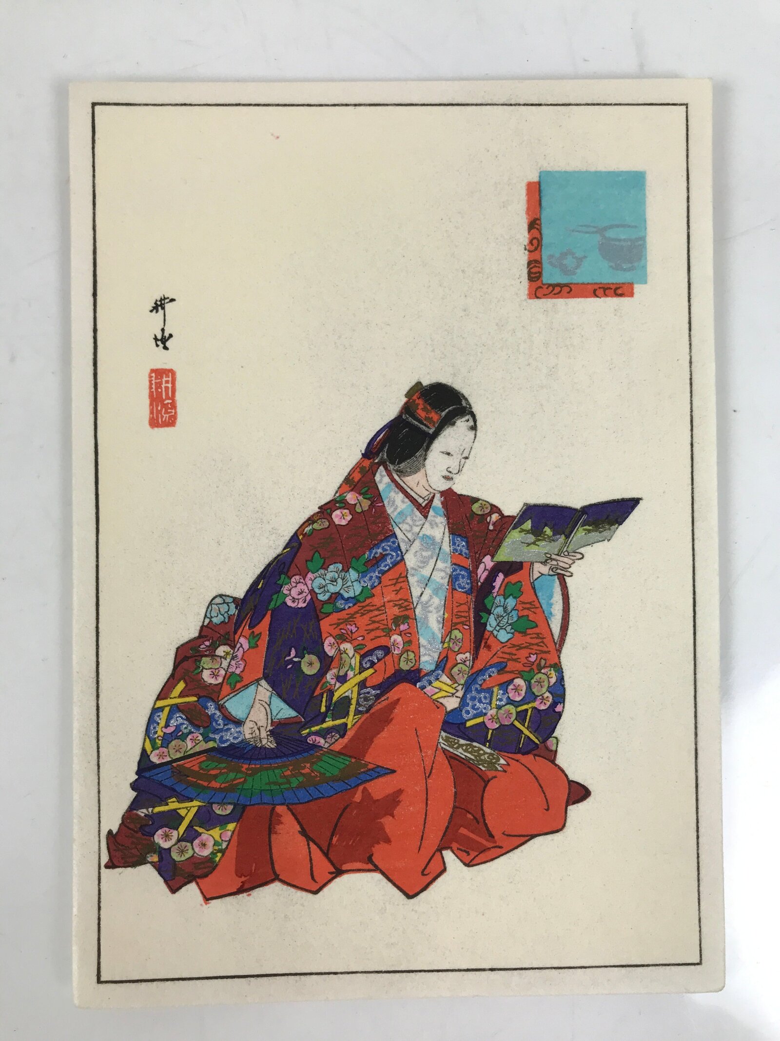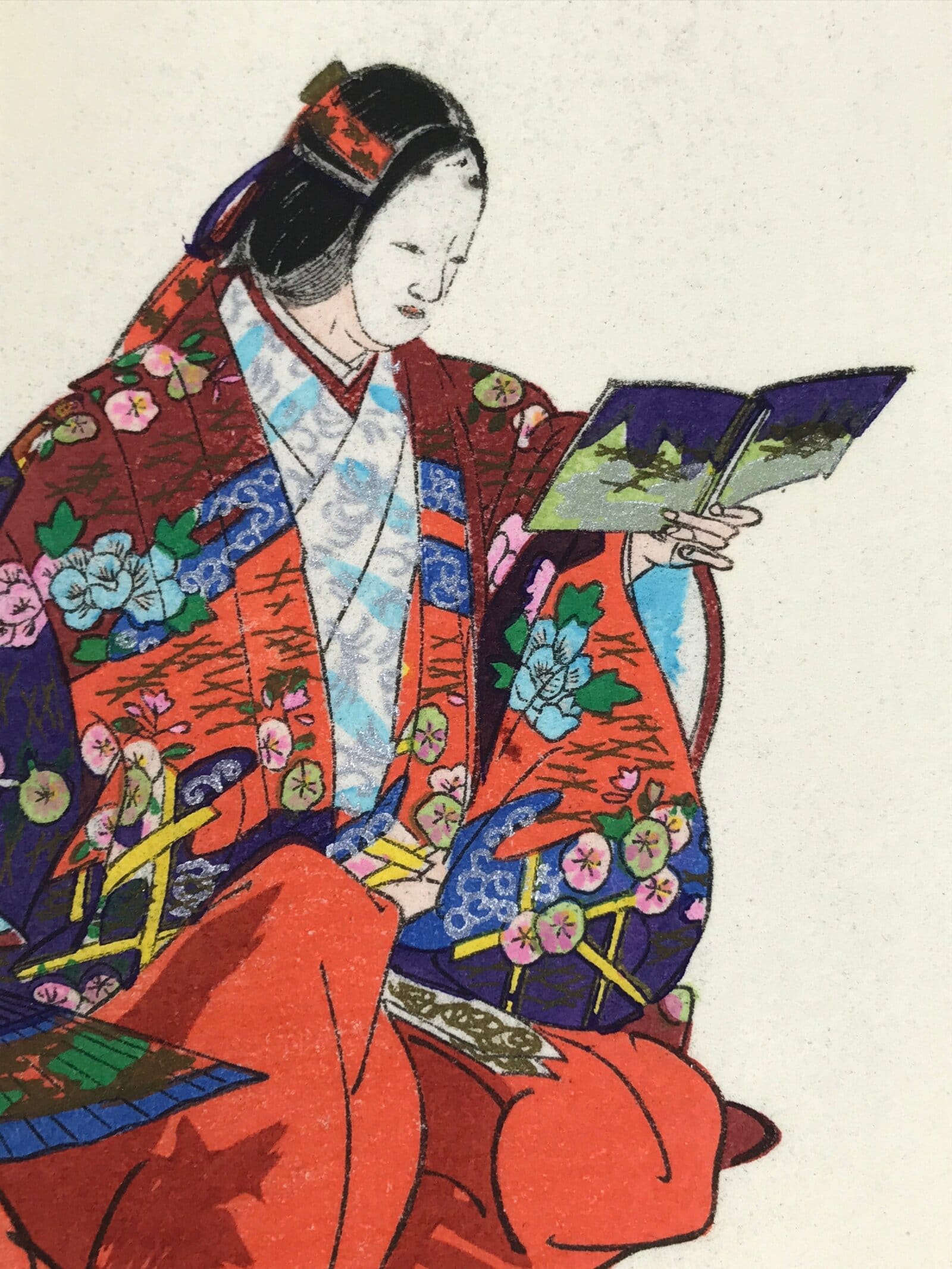 This vintage Japanese writing paper is a colorful woodblock-printed reproduction of an artwork by Kogyo Tsukioka representing a character from the Noh play “Soshi Arai Komachi”. The paper is folded in four.