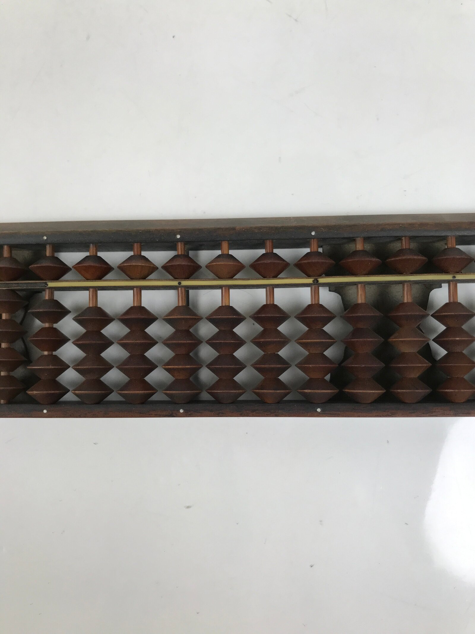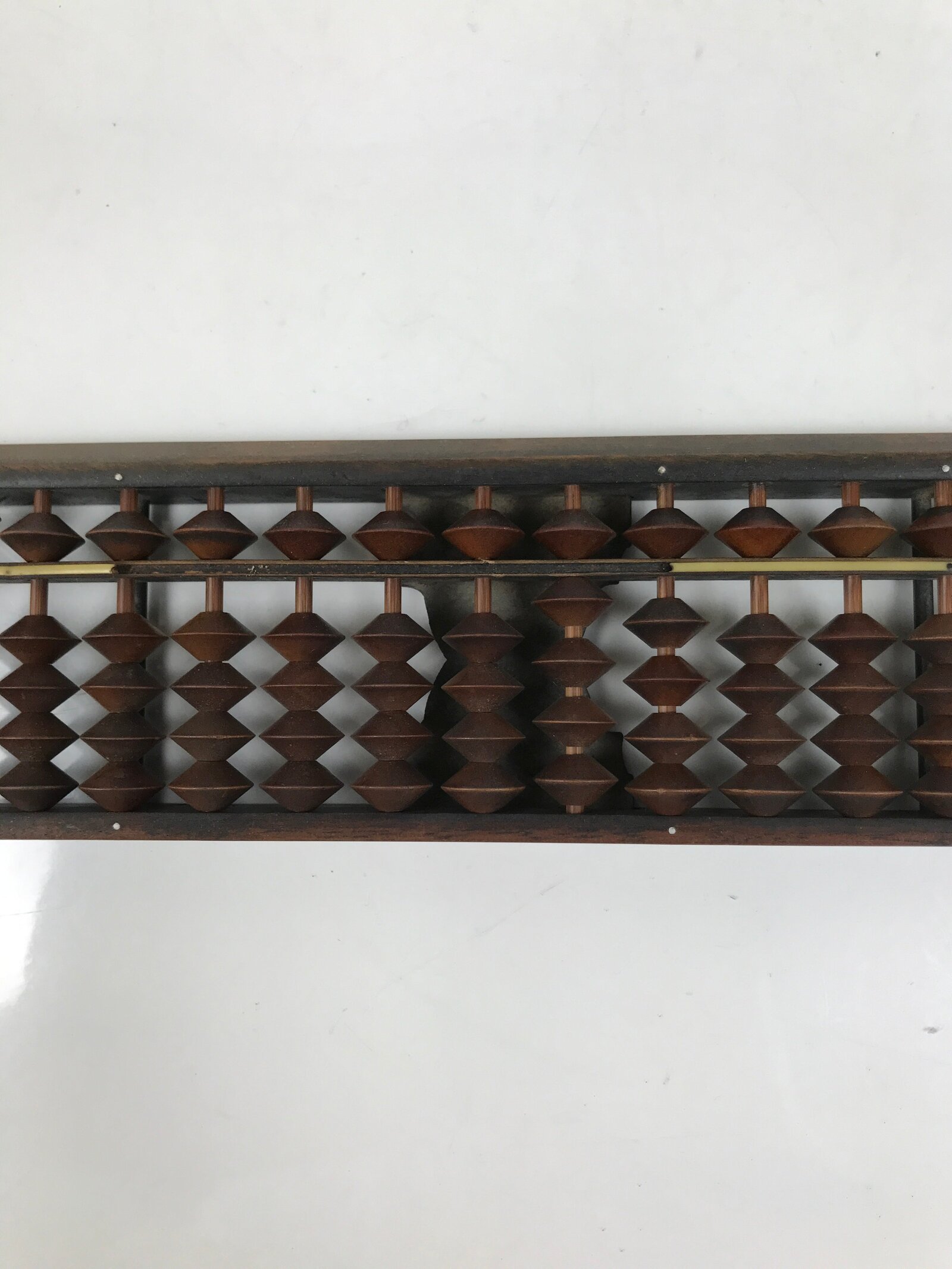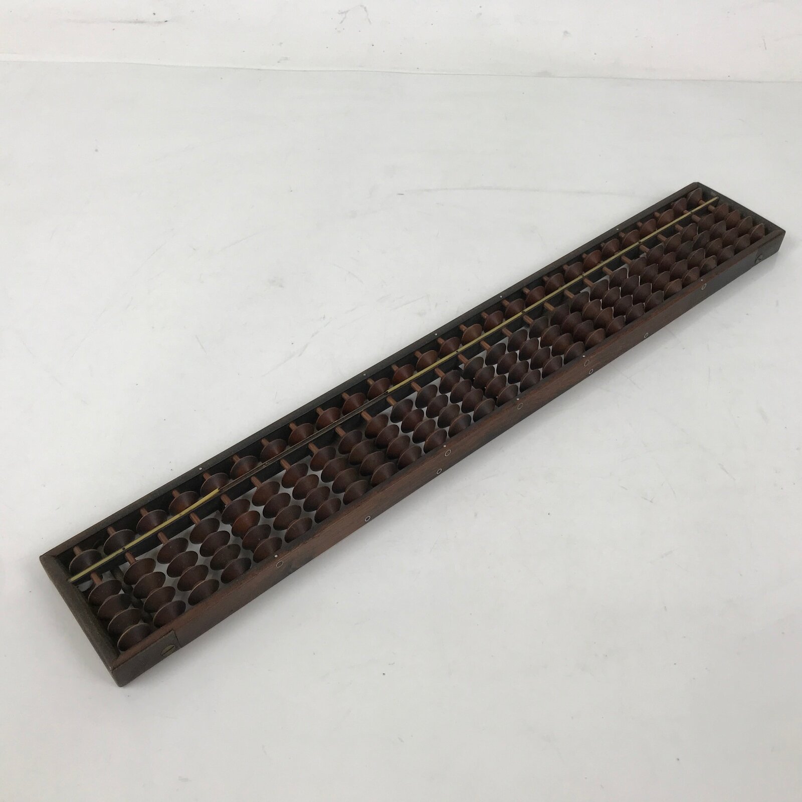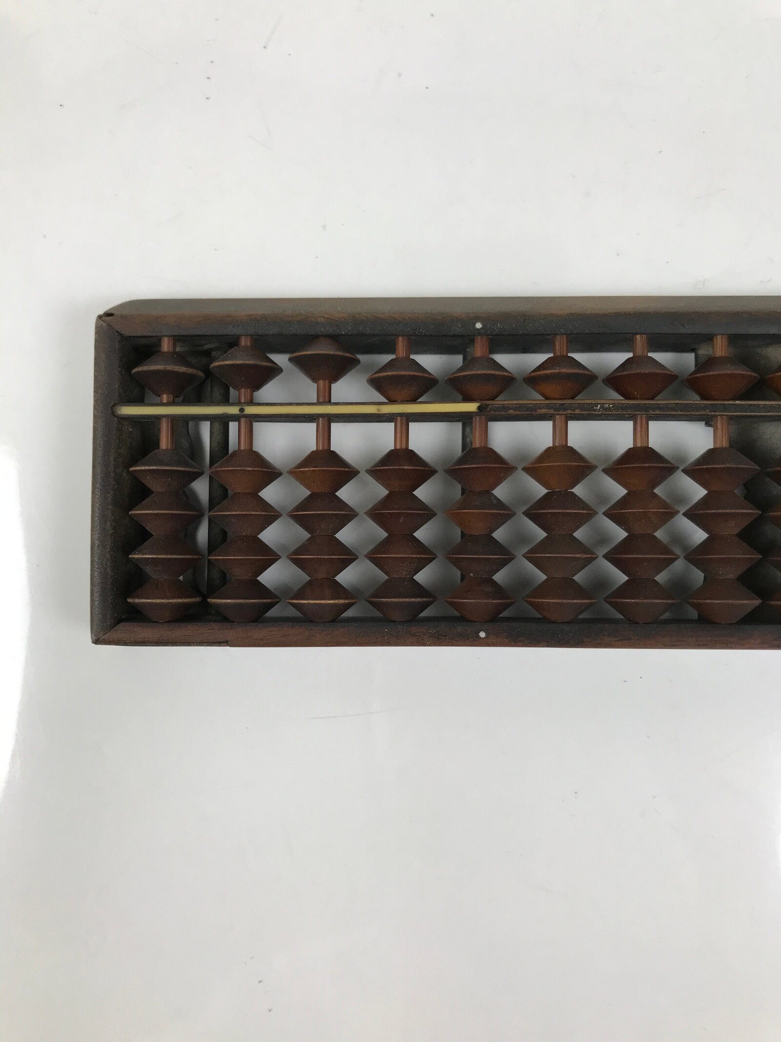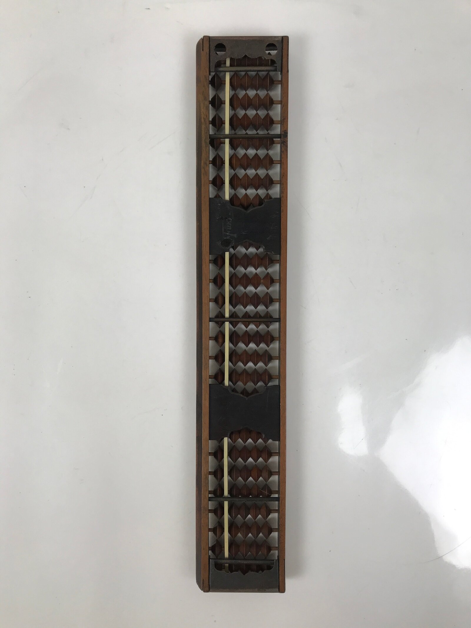 This soroban is mostly made of wood with a dark brown color. The side is made of metal. It is in excellent working order.
