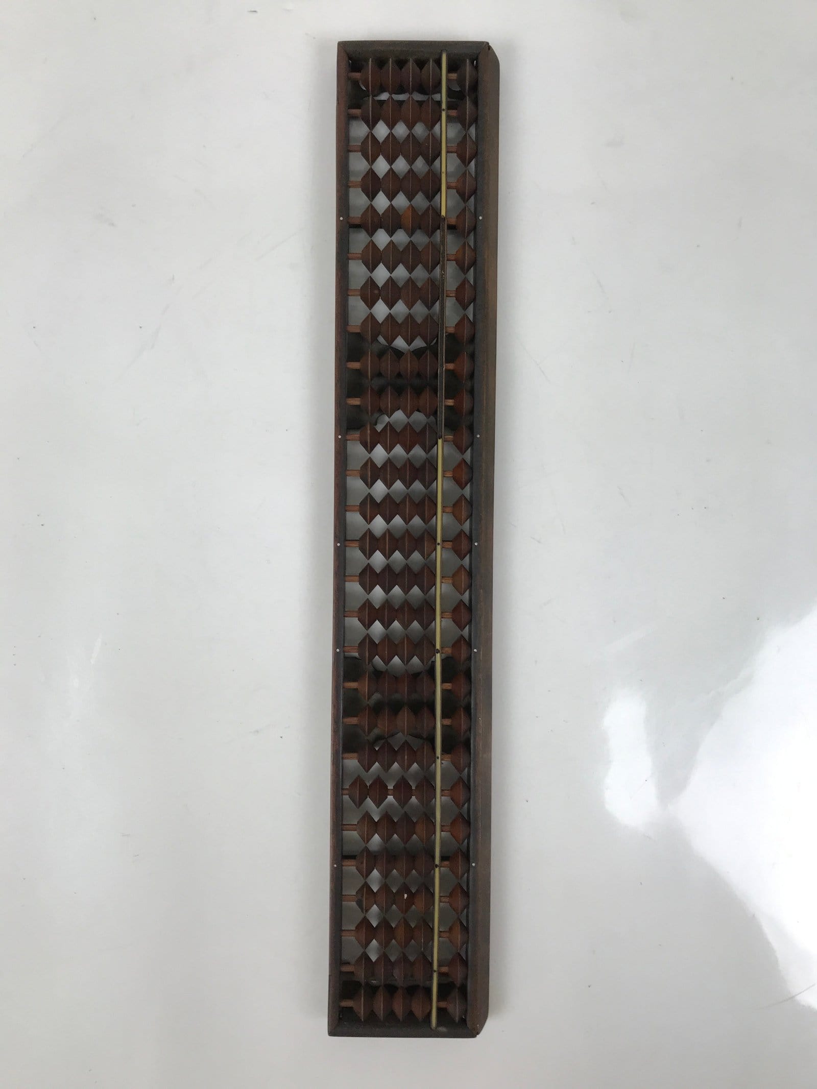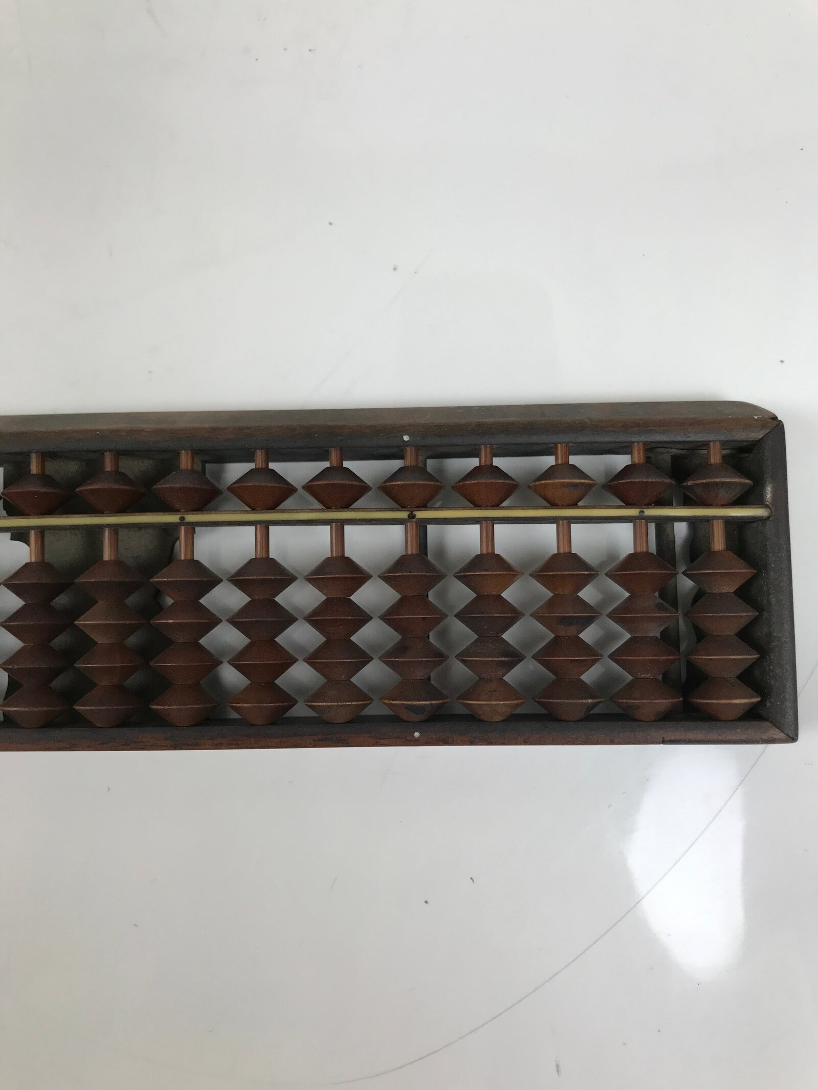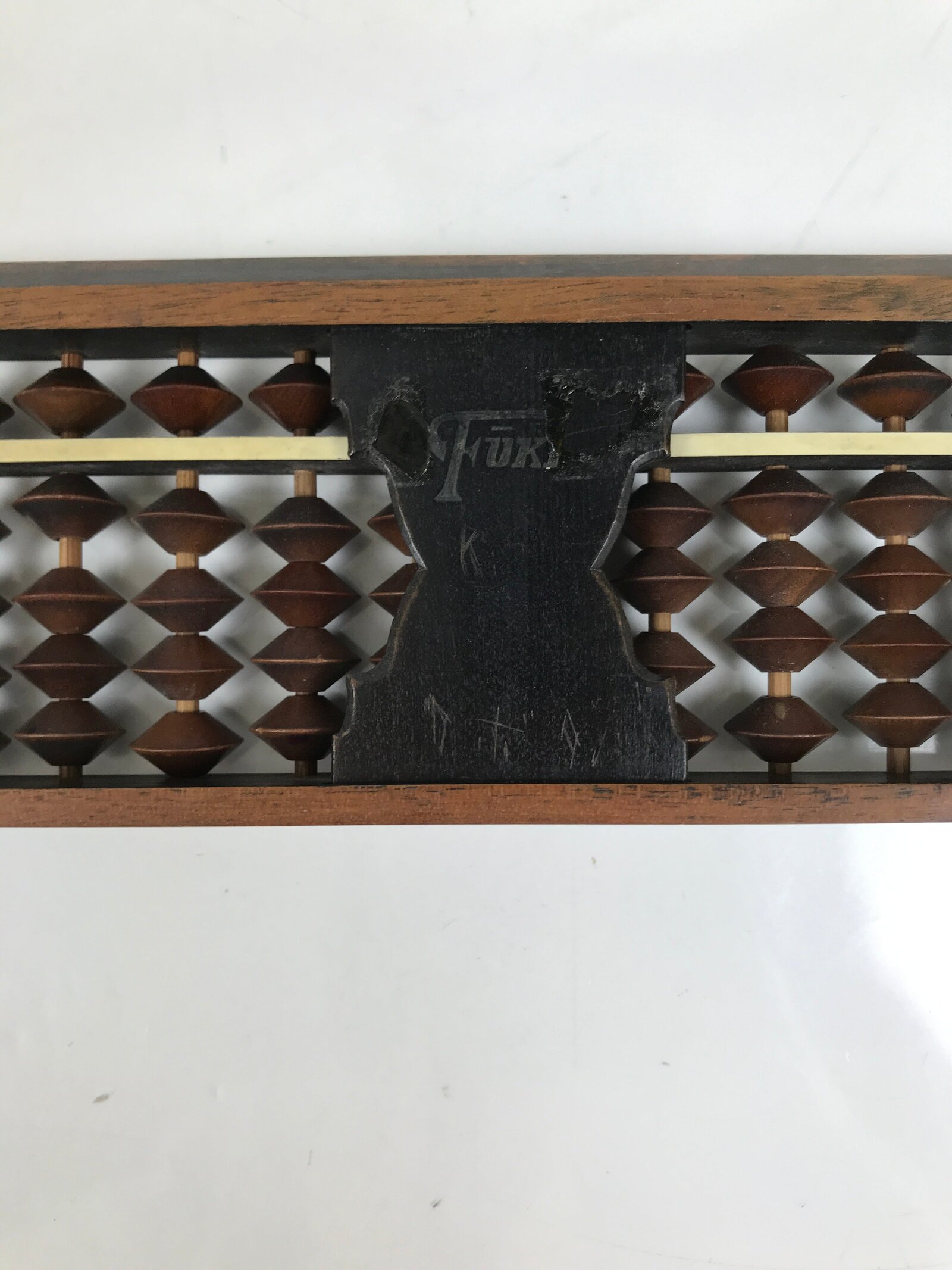 This is a vintage Japanese abacus, or soroban. It is a mathematics calculating tool and is considered the first calculator in Japan. The Japanese abacus is different from the parent Chinese version. It has a top section of single beads and a bottom of stacked beads, usually five. At the very center is one unmarked stack used for decimal places for more complicated calculations. Many primary schools all over Japan still use these as well as for scorekeeping.