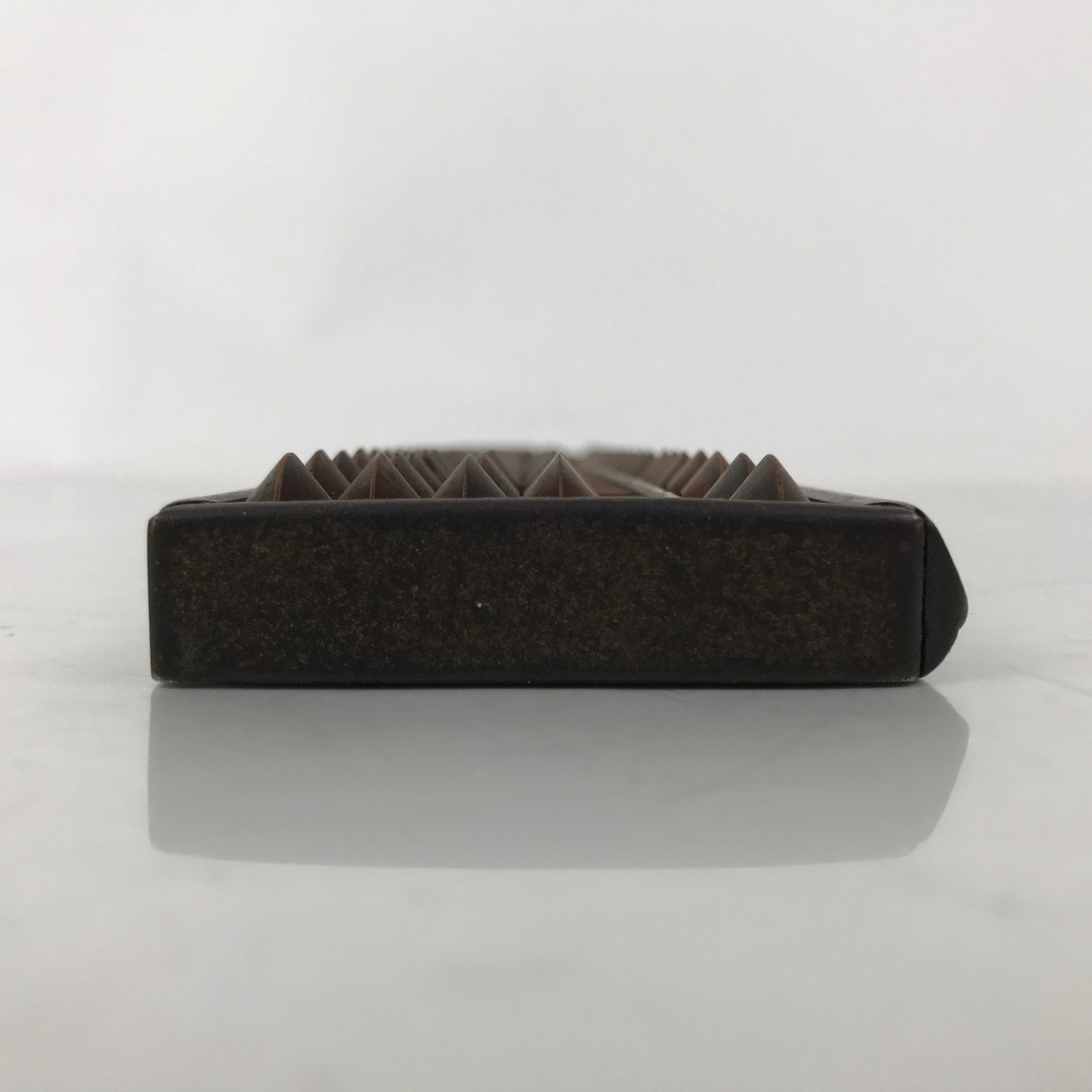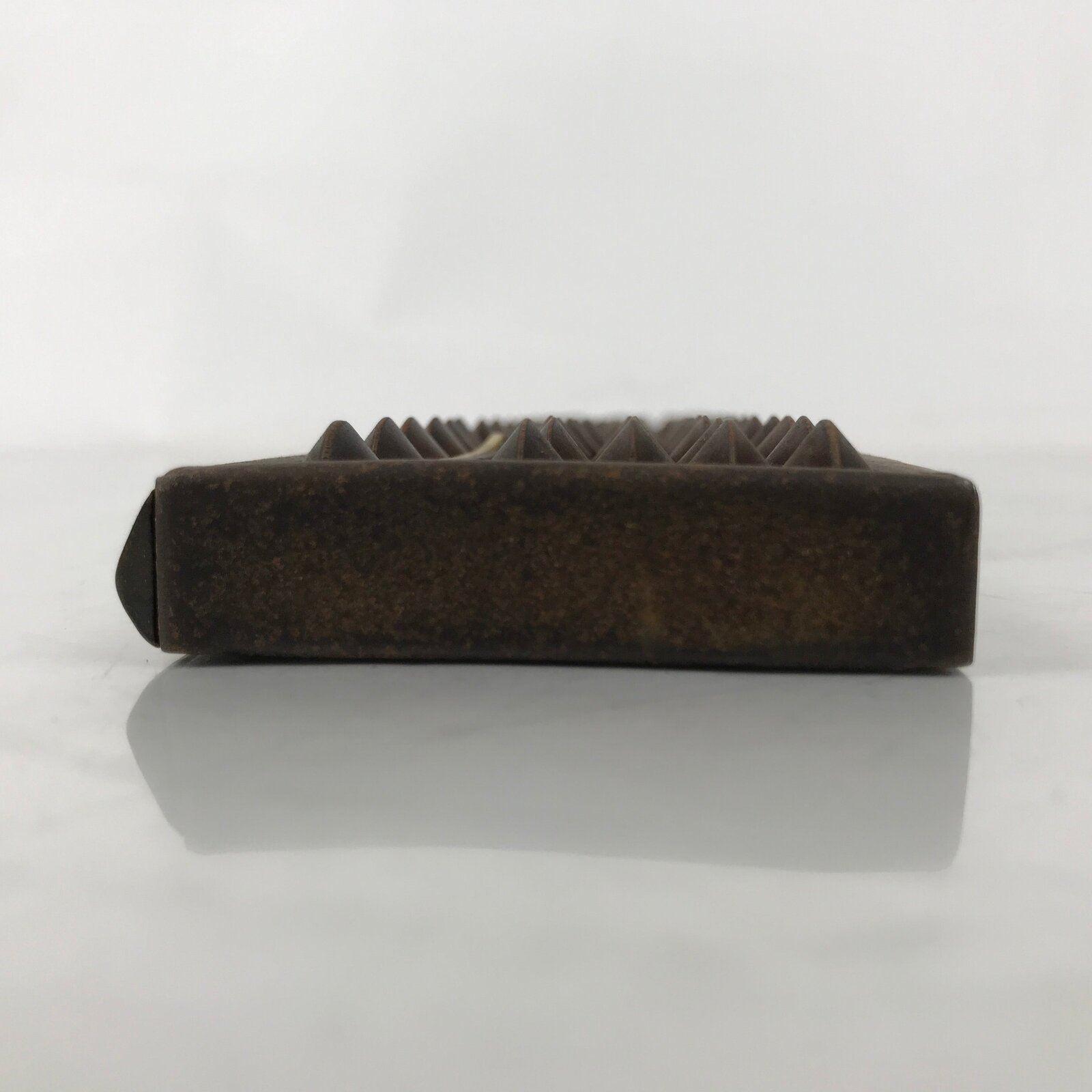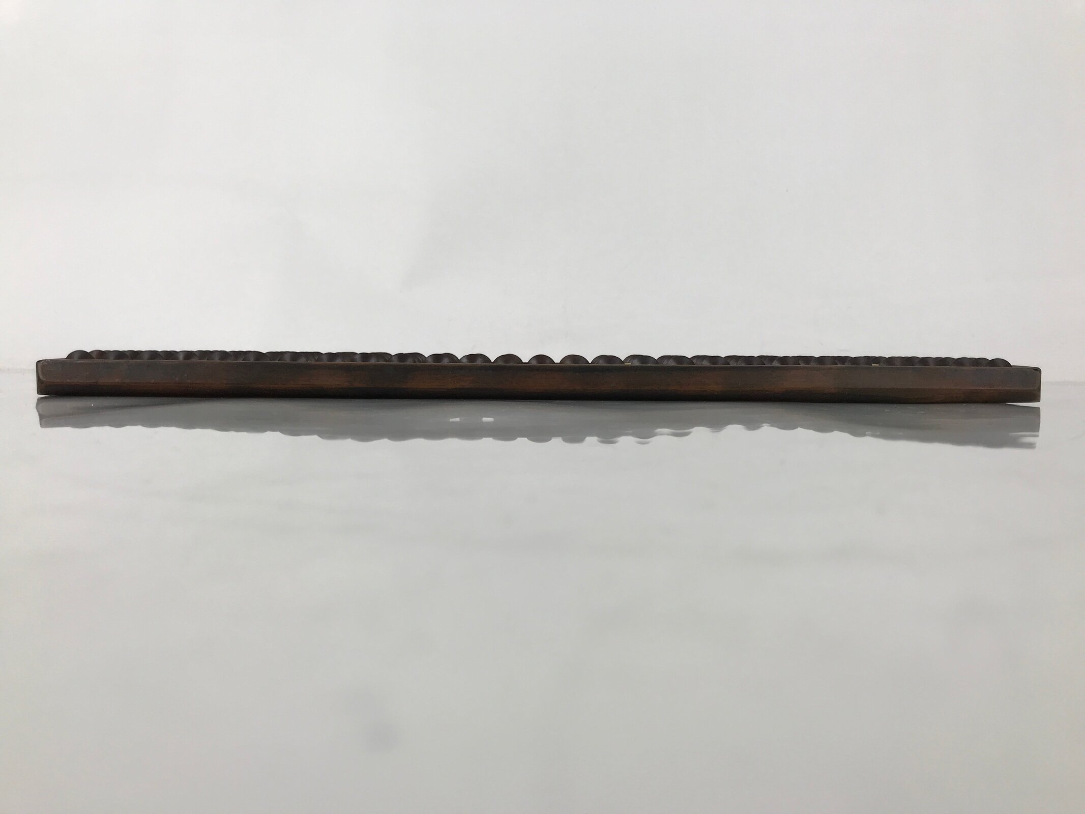 This is a vintage Japanese abacus, or soroban. It is a mathematics calculating tool and is considered the first calculator in Japan. The Japanese abacus is different from the parent Chinese version. It has a top section of single beads and a bottom of stacked beads, usually five. At the very center is one unmarked stack used for decimal places for more complicated calculations. Many primary schools all over Japan still use these as well as for scorekeeping.