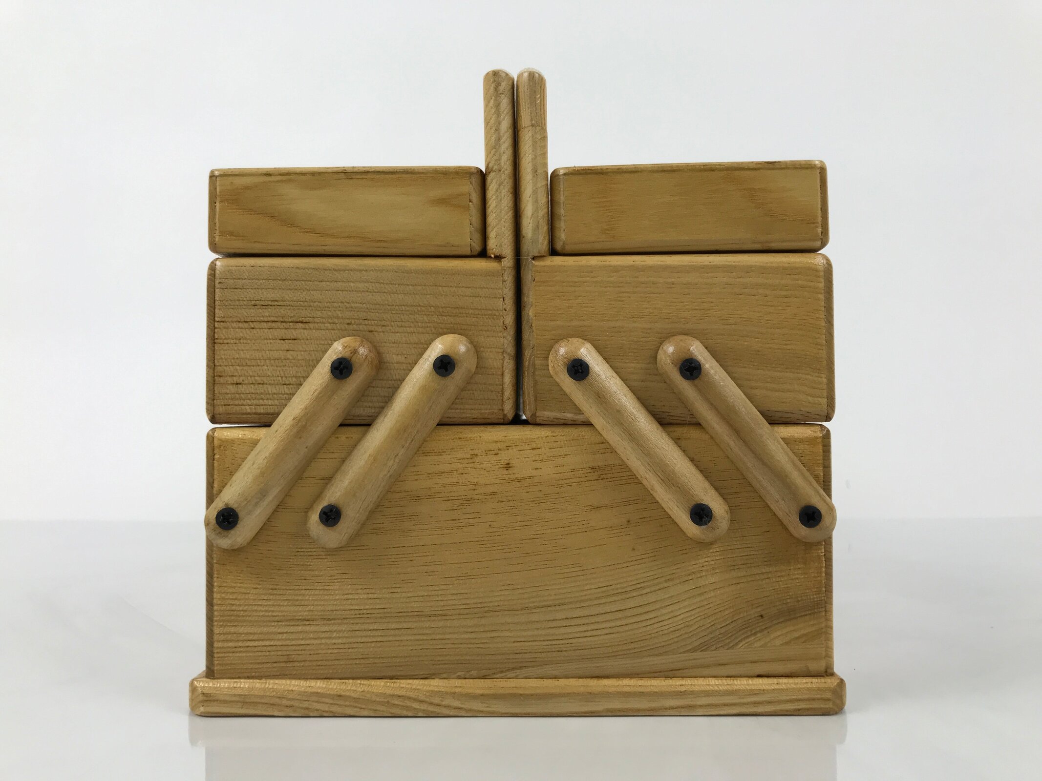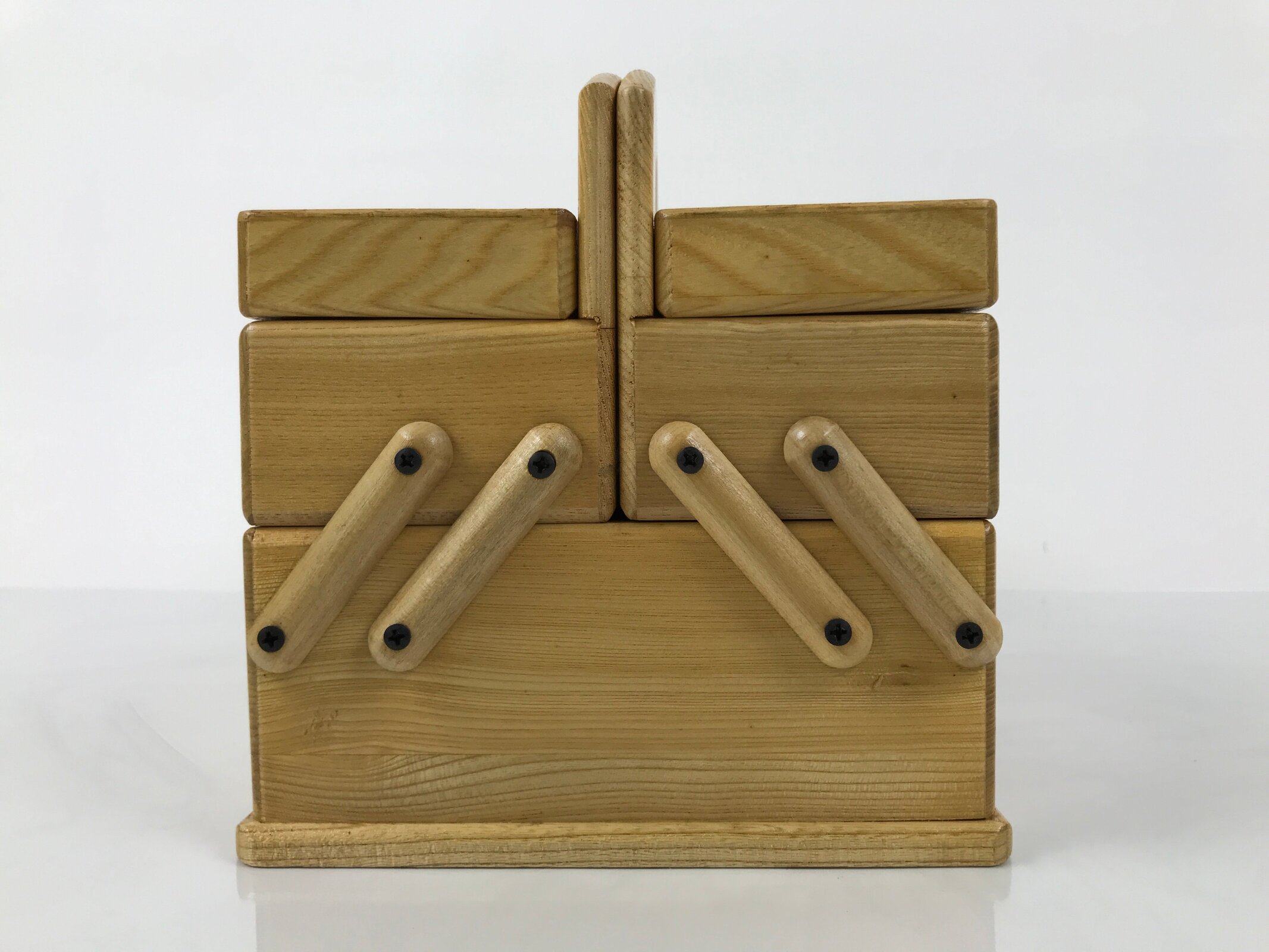 This is a Japanese sewing box, also called haribako. In an accordion style, this sewing chest has two lidded compartments that extend outward and one large compartment on the bottom. The outside is brushed with clear lacquer, and the inside is lined with velvety red fabric. It has three handles; the main one separates into two when the bottom compartment is open, and the others are on the lid for opening the top compartments. This beautiful tansu chest can be used for storing sewing supplies, jewelry, or other trinkets. It is cased in the cardboard box.