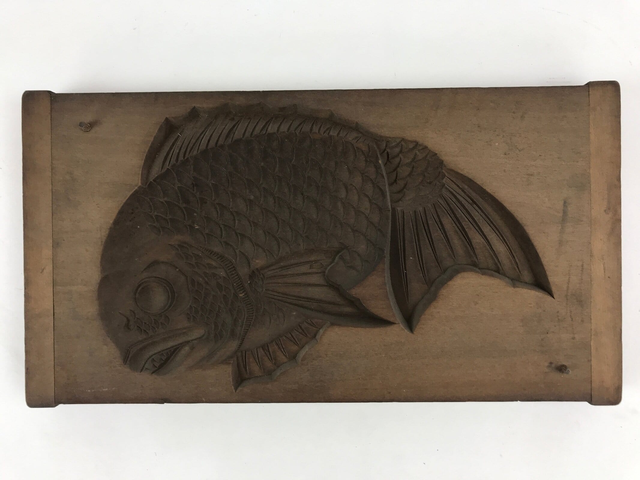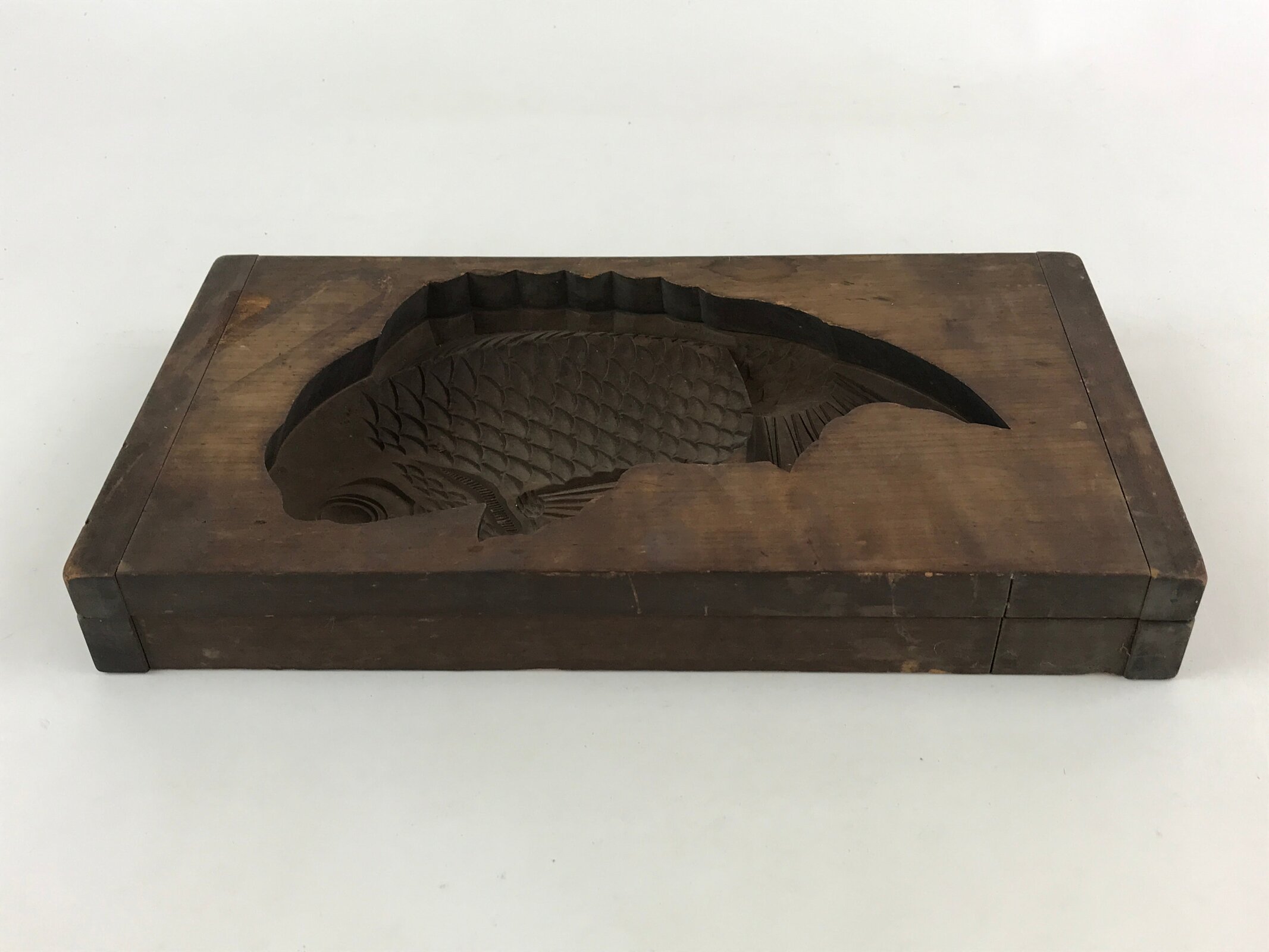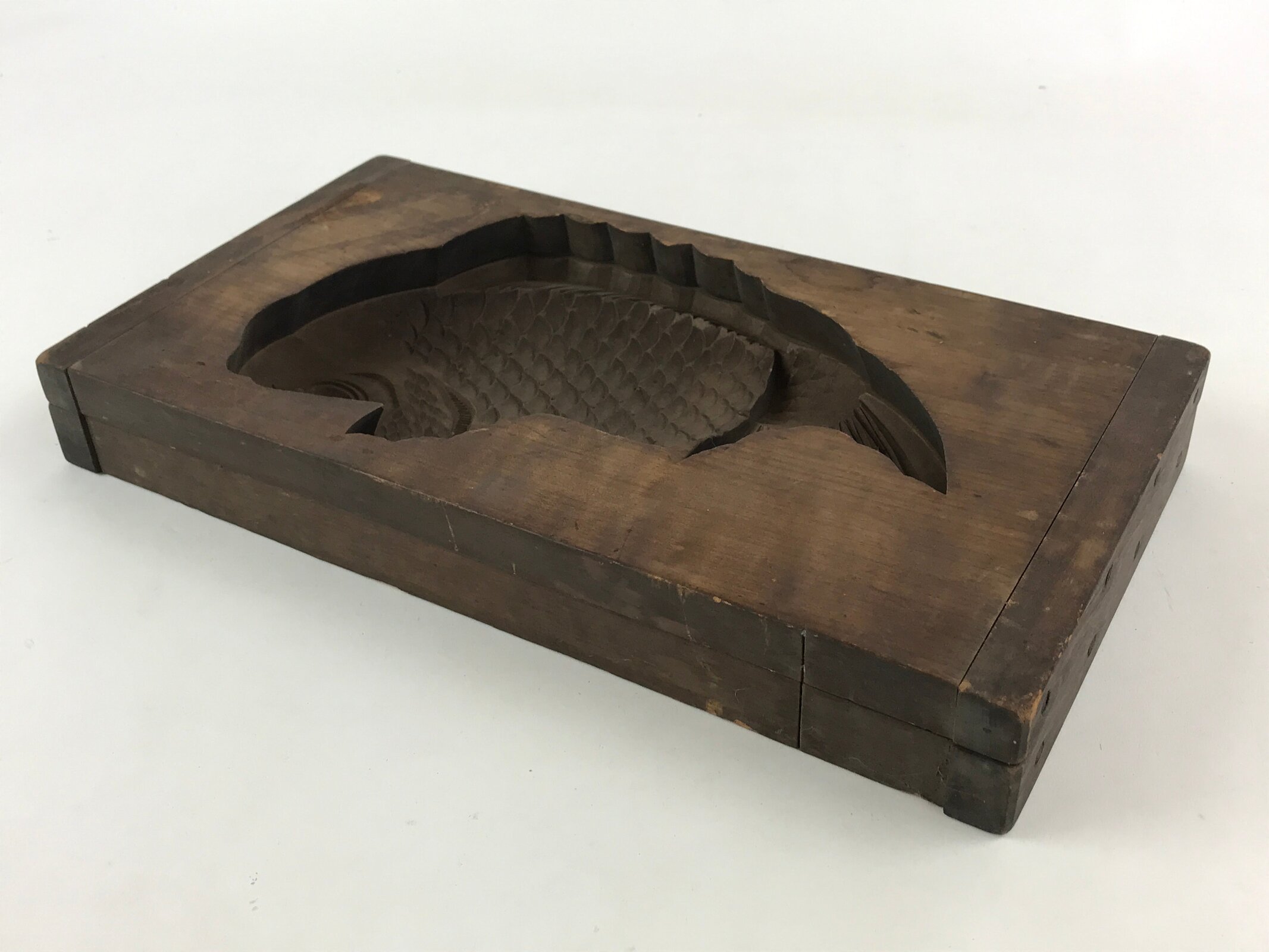 This large two-piece kashigata mold is carved with a sea bream fish (tai) design. It can be used to make sweets or as an eye-catching decorative item.