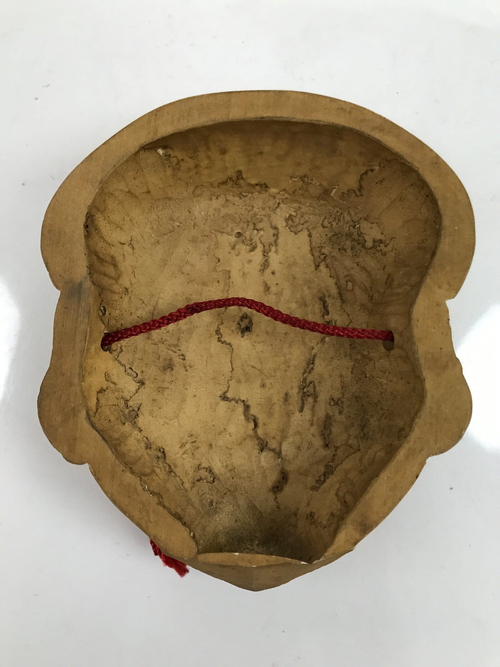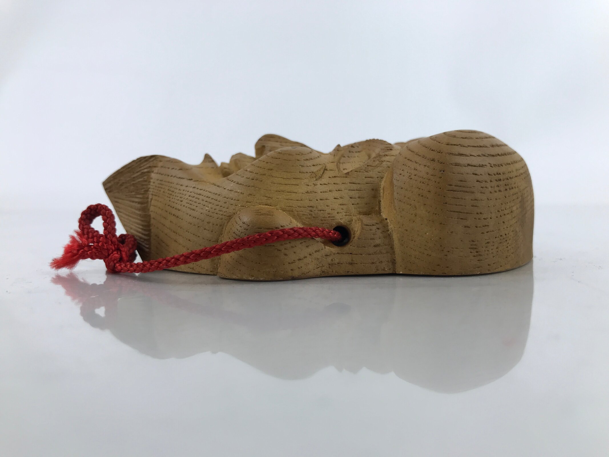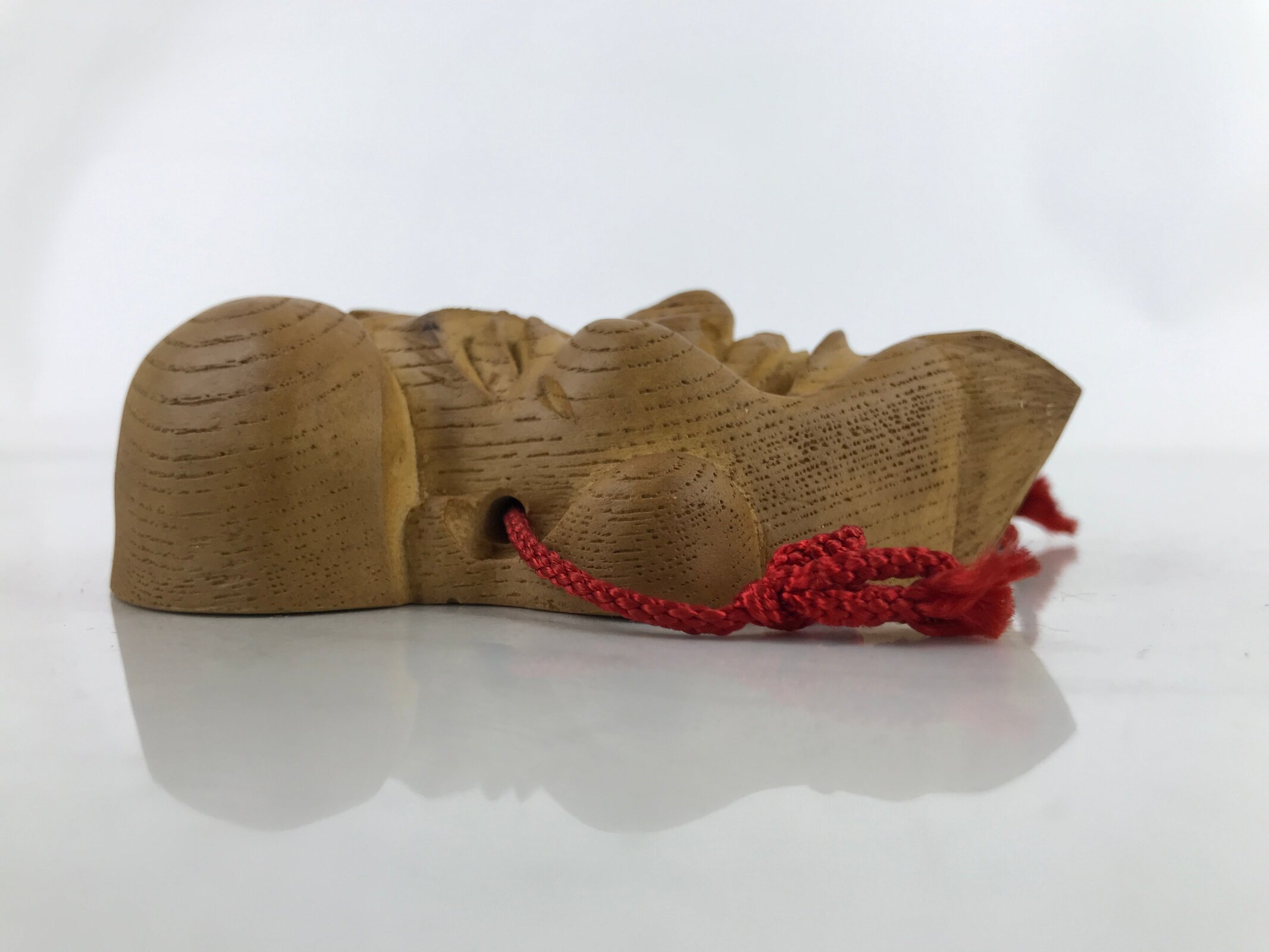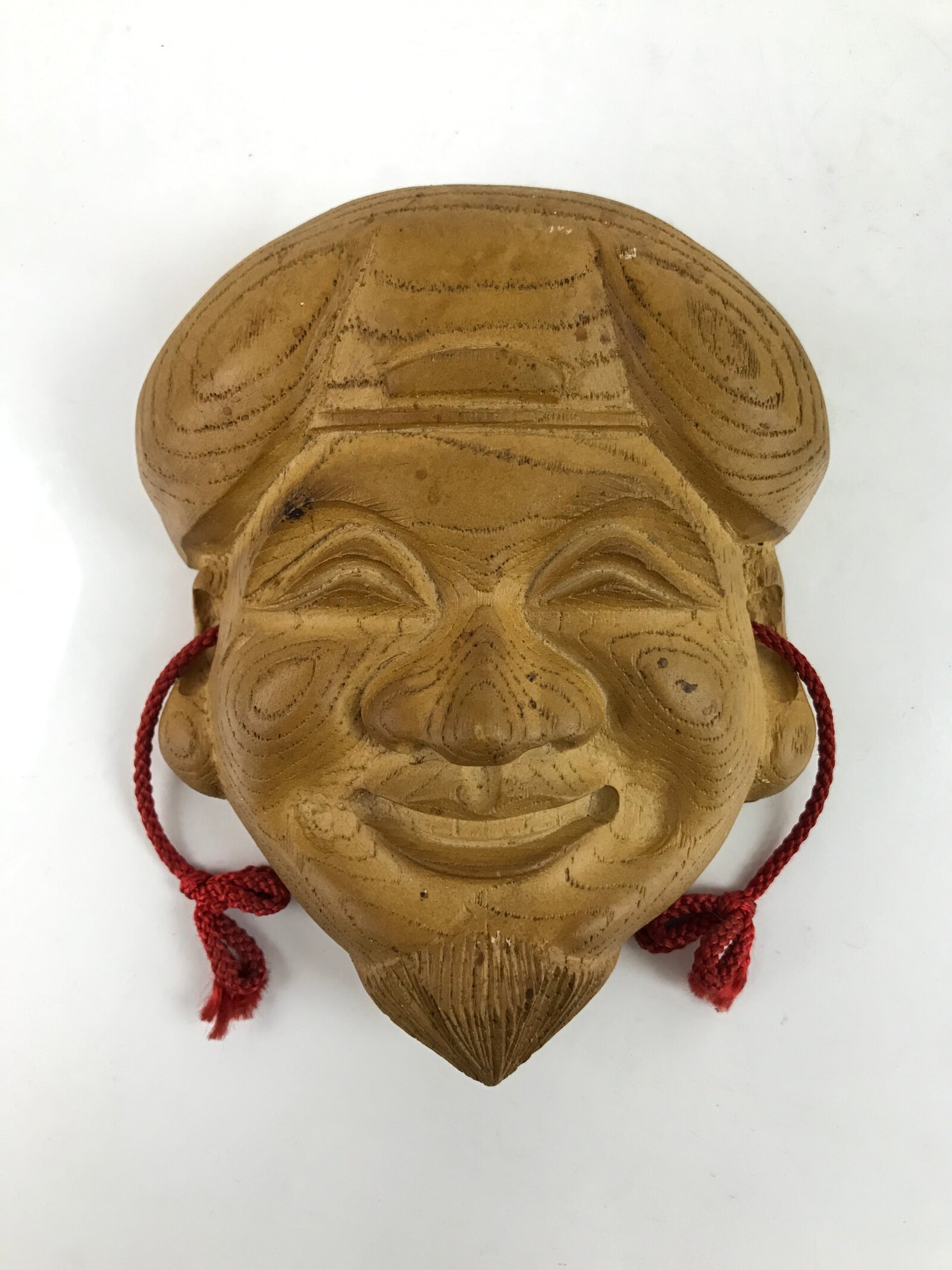 This is a vintage Japanese carved wooden mask (omen) of Ebisu, one of the Seven Lucky Gods. It is a natural wood color. A red string is attached. Ebisu is the god of wealth, fishing, and trade. It is a beloved and common symbol of luck and good fortune in Japan.