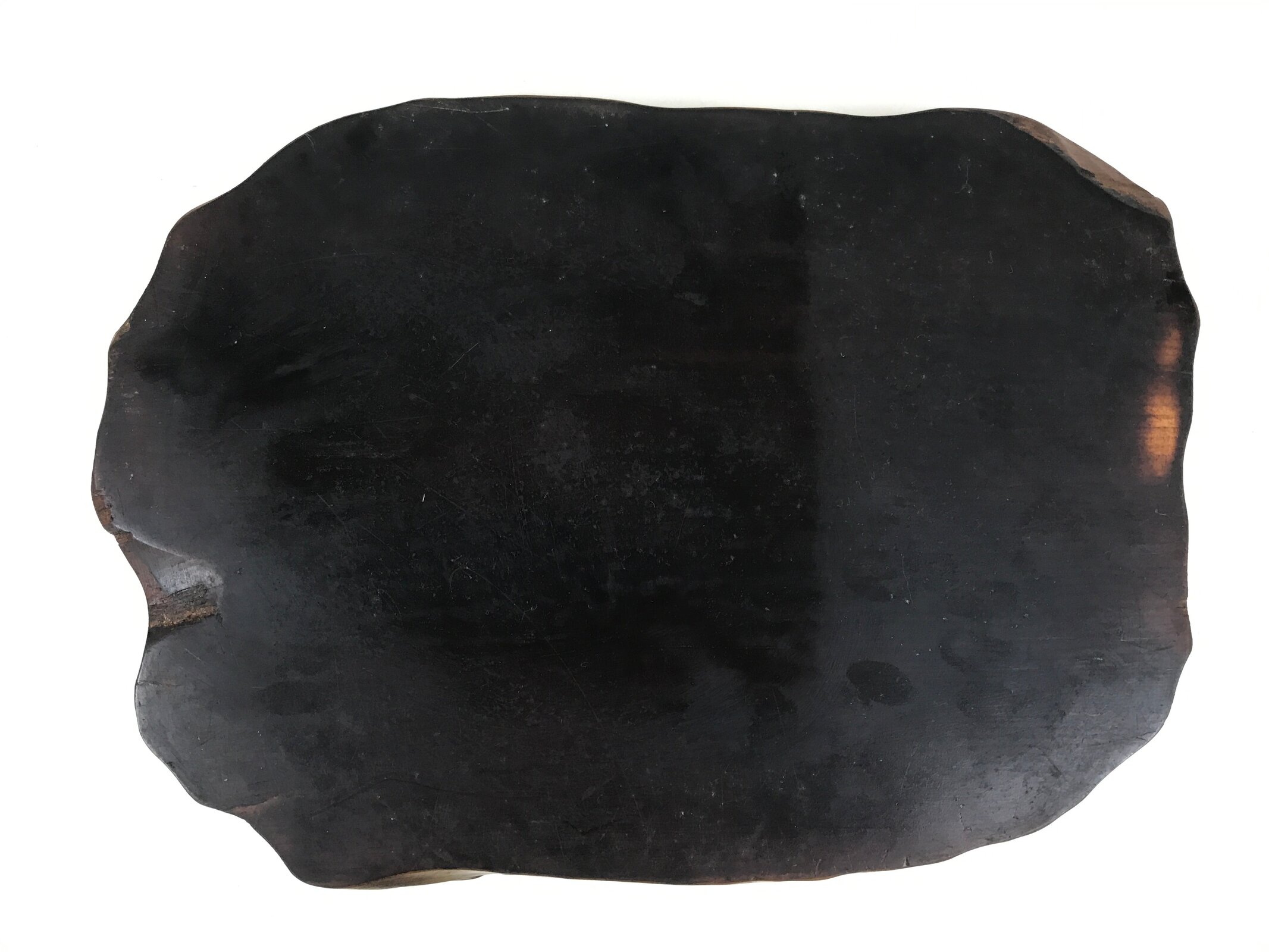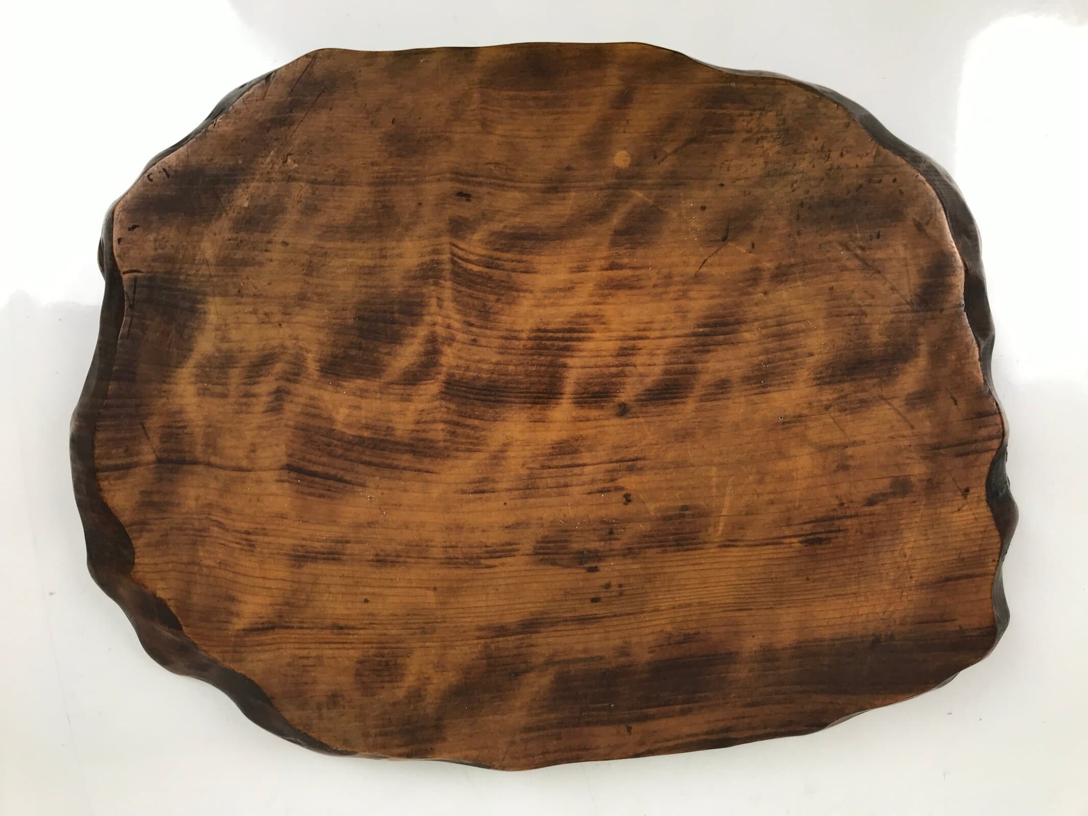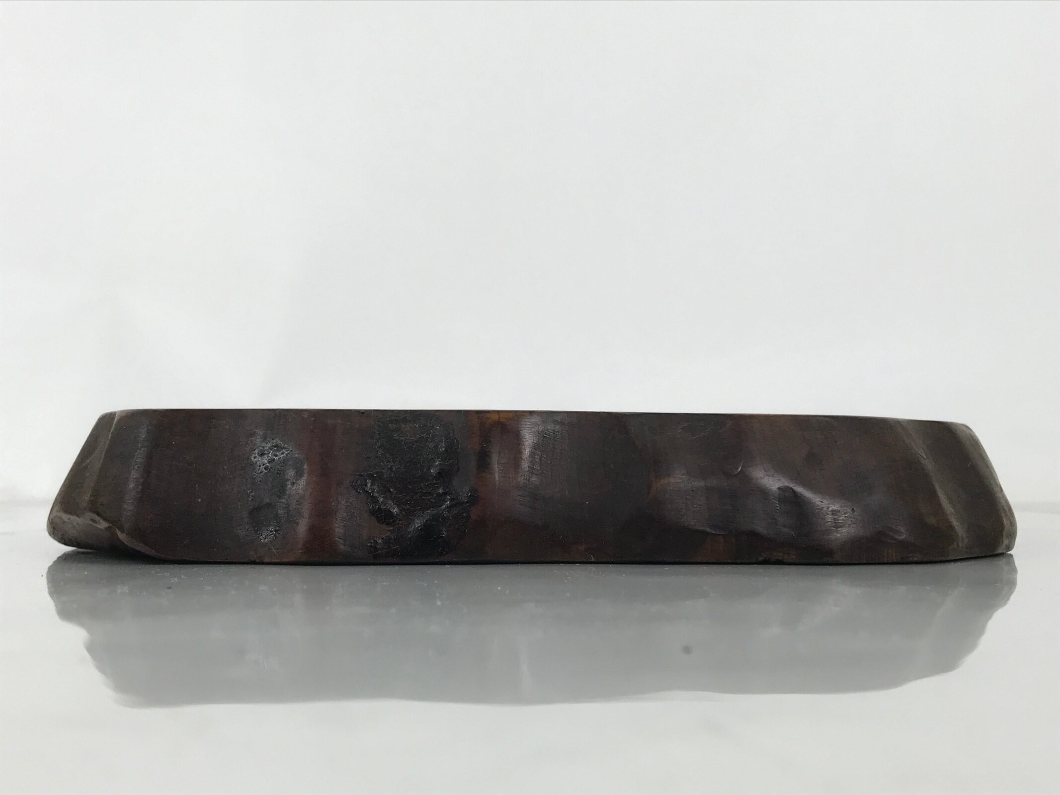 Used for the display of flower vases, ikebana arrangements, bonsai, and more, this classic, uniquely shaped kadai is one-of-a-kind, handcrafted from a piece of solid wood (cross-section of a tree trunk). It is stained a medium brown with a clear brushed lacquer coating. The stand has many different grooves and textures on all sides to create visual interest from any angle.