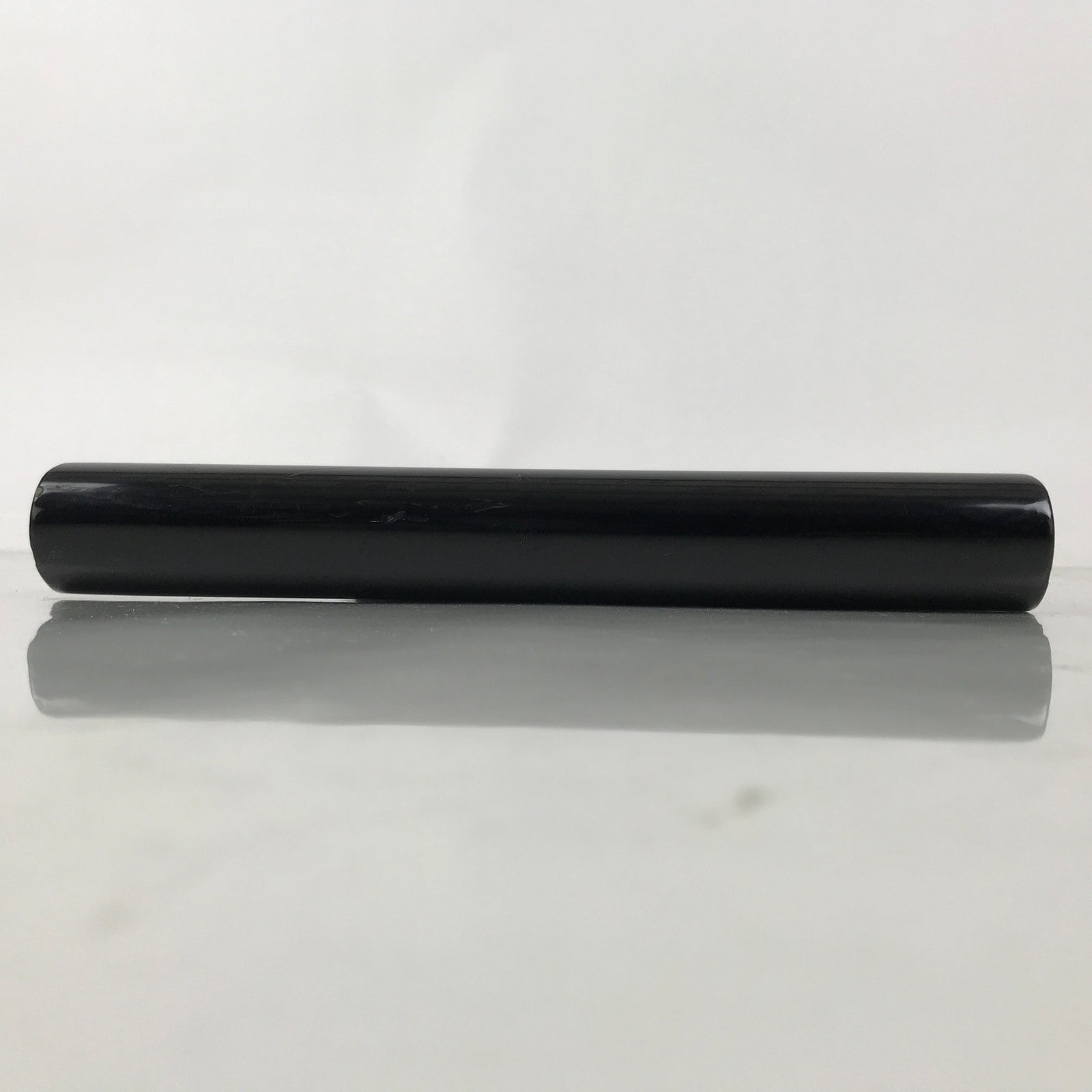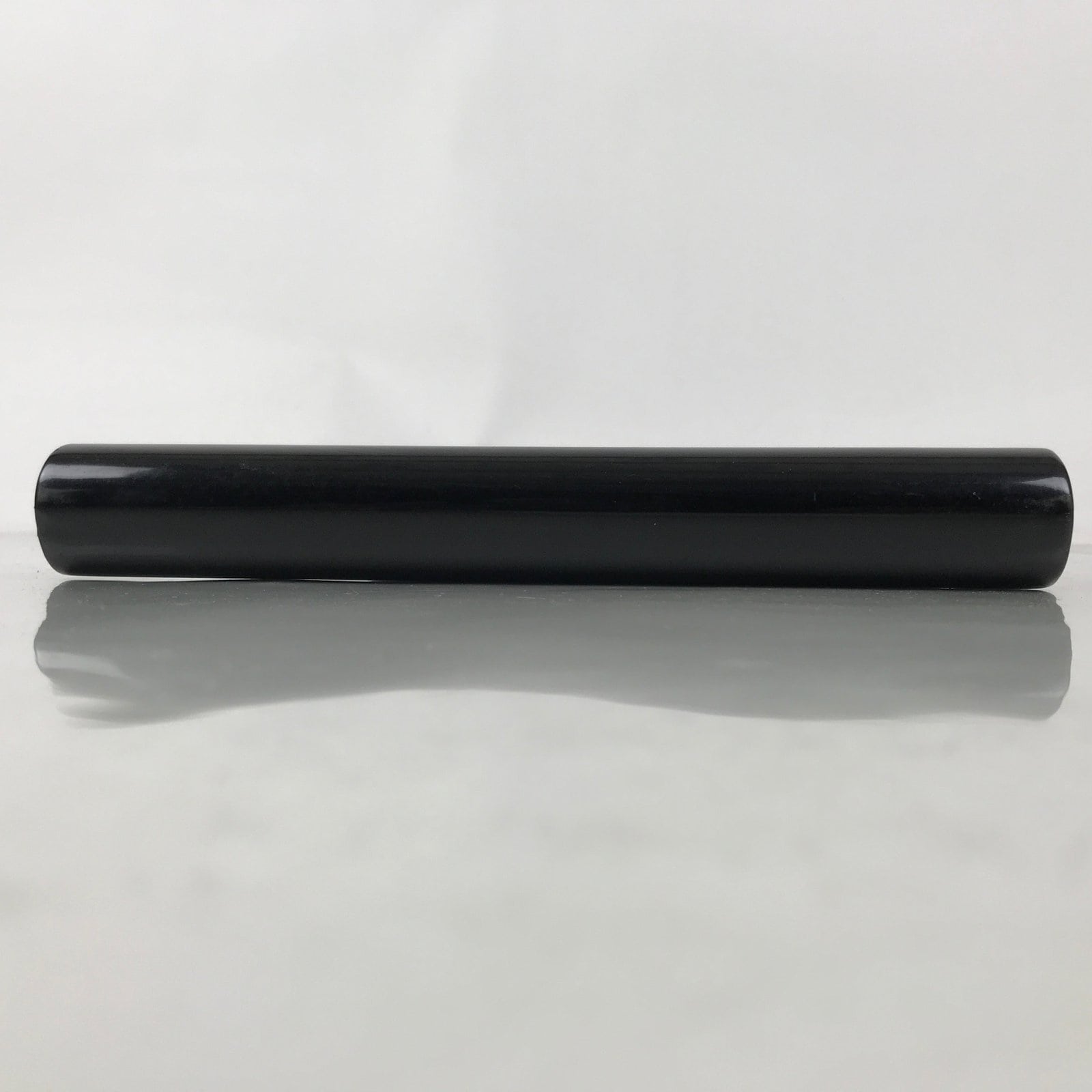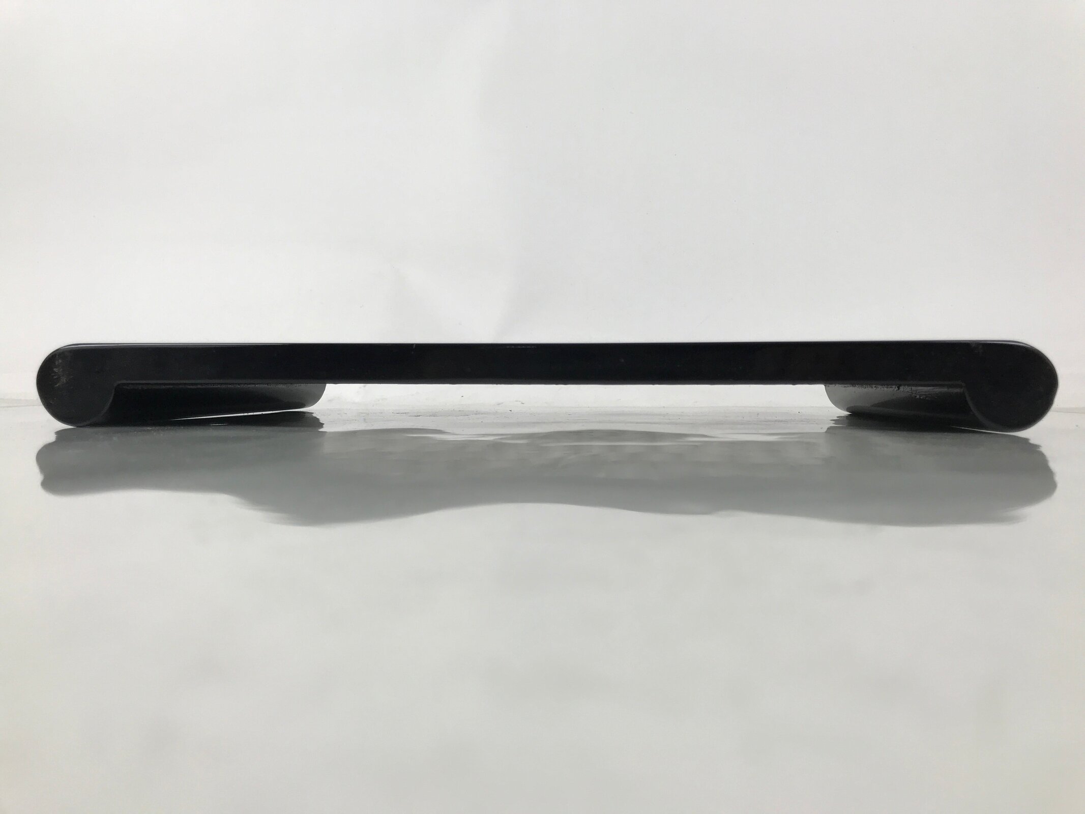 Used for the display of flower vases, ikebana arrangements, bonsai, and more, this rectangular-shaped wooden kadai is lacquered glossy black and has two round legs. The backside features wavy lacquer marks and handwritten Kanji letters. It stands on two round legs for added visual interest and stability.