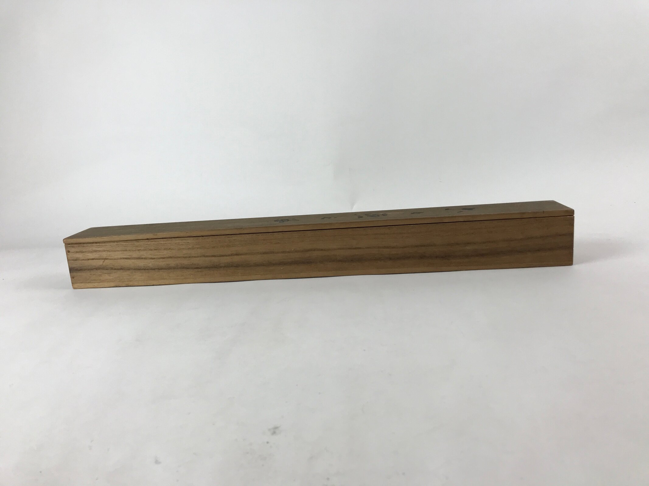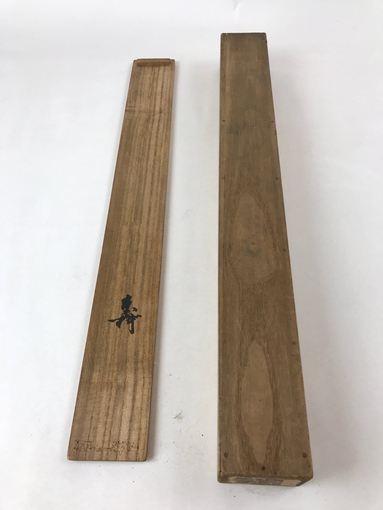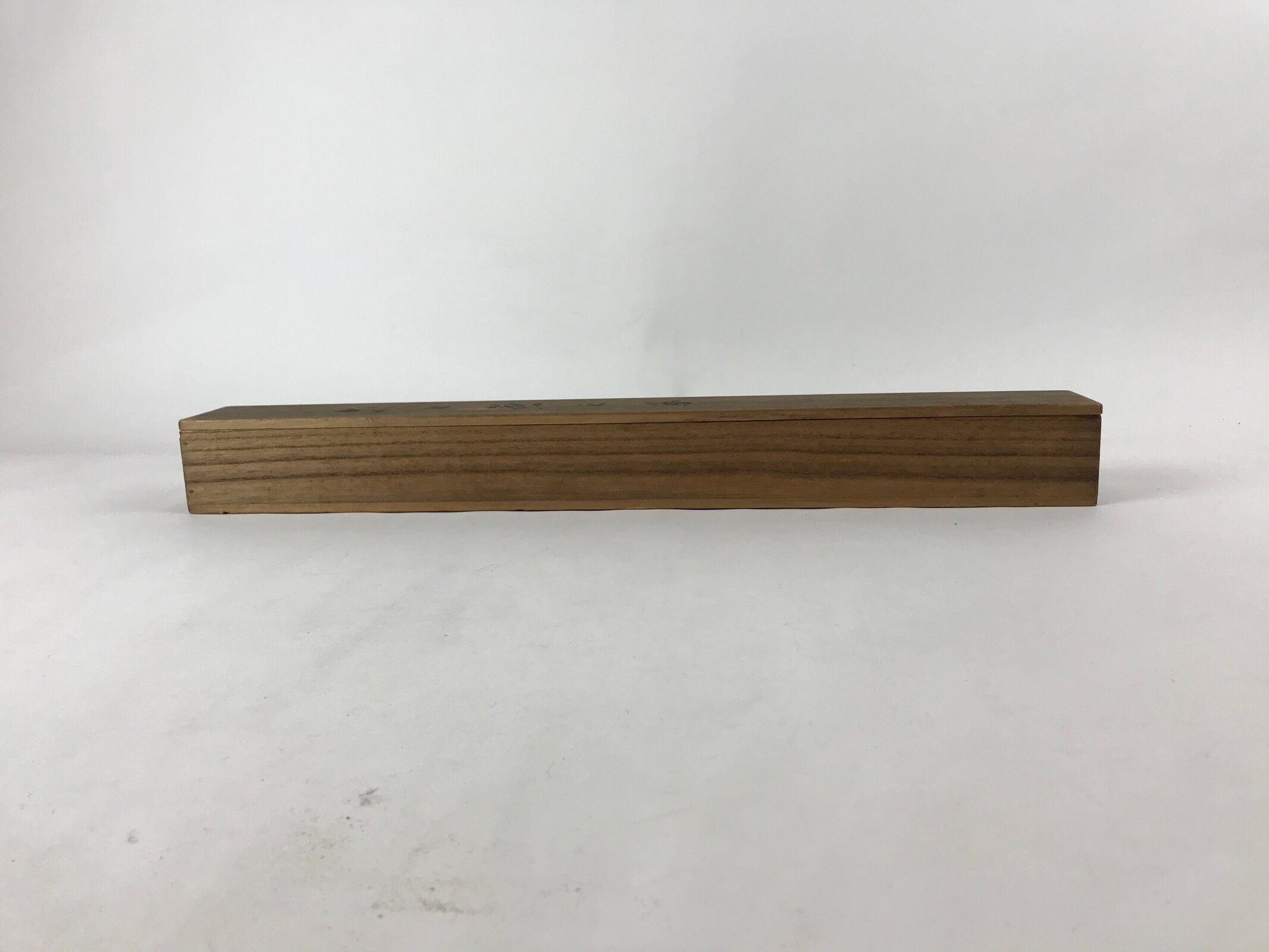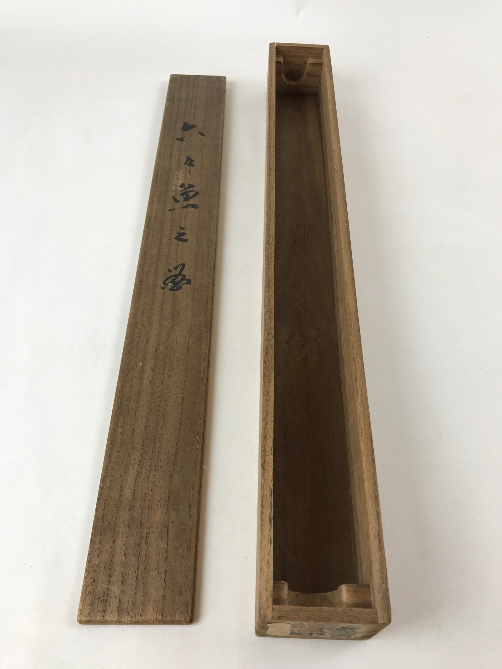 Hand-crafted and in a brown color, this sturdy and slender wooden box is made to store a hanging scroll, or kakejiku. The lid is step-top and fits flush on the top. There are some inscriptions on the outside and inside of the lid and a sticker on the front side.