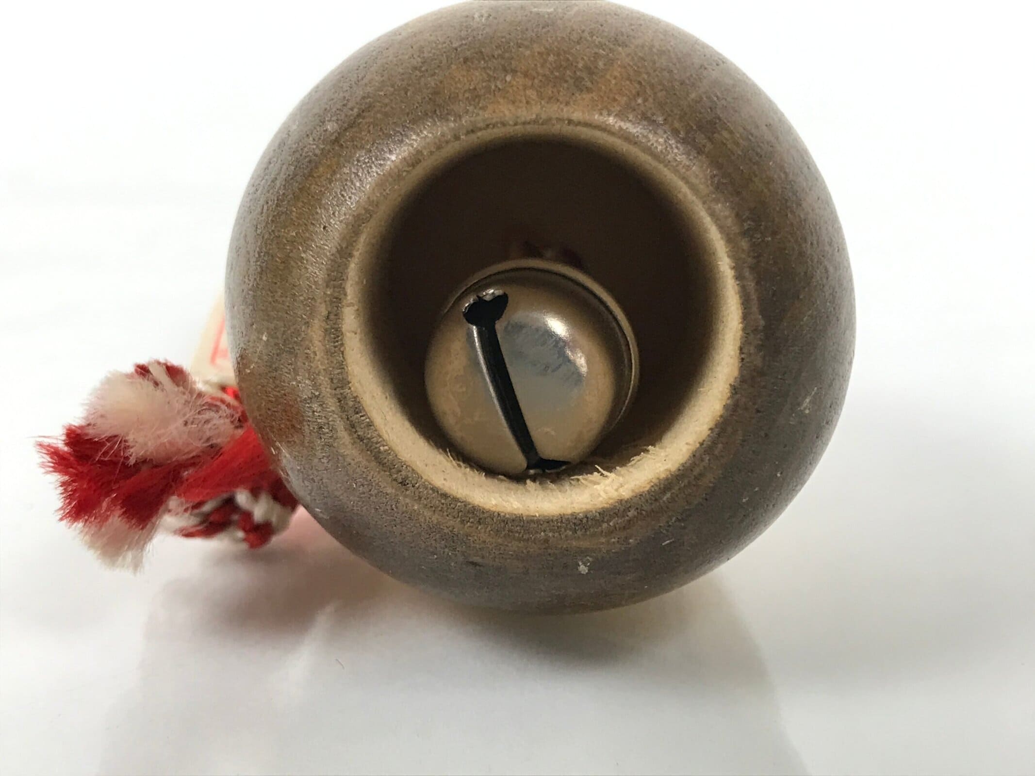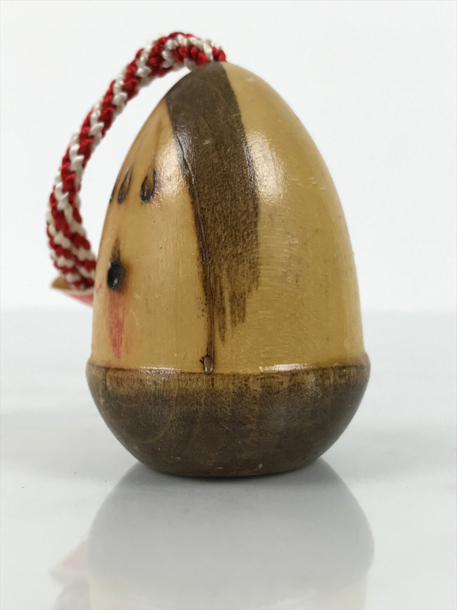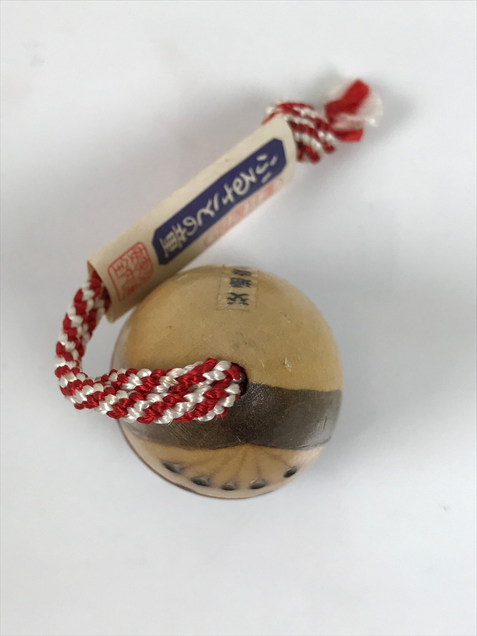 This is a vintage Japanese wooden doll. This smiling doll or charm features a bamboo shoot and has a hollow inside to hold a bell. The bangs and eyes are incised and painted. The charm hangs from a red-and-white braided cord with a paper tag. There is a transparent sticker with an inscription.