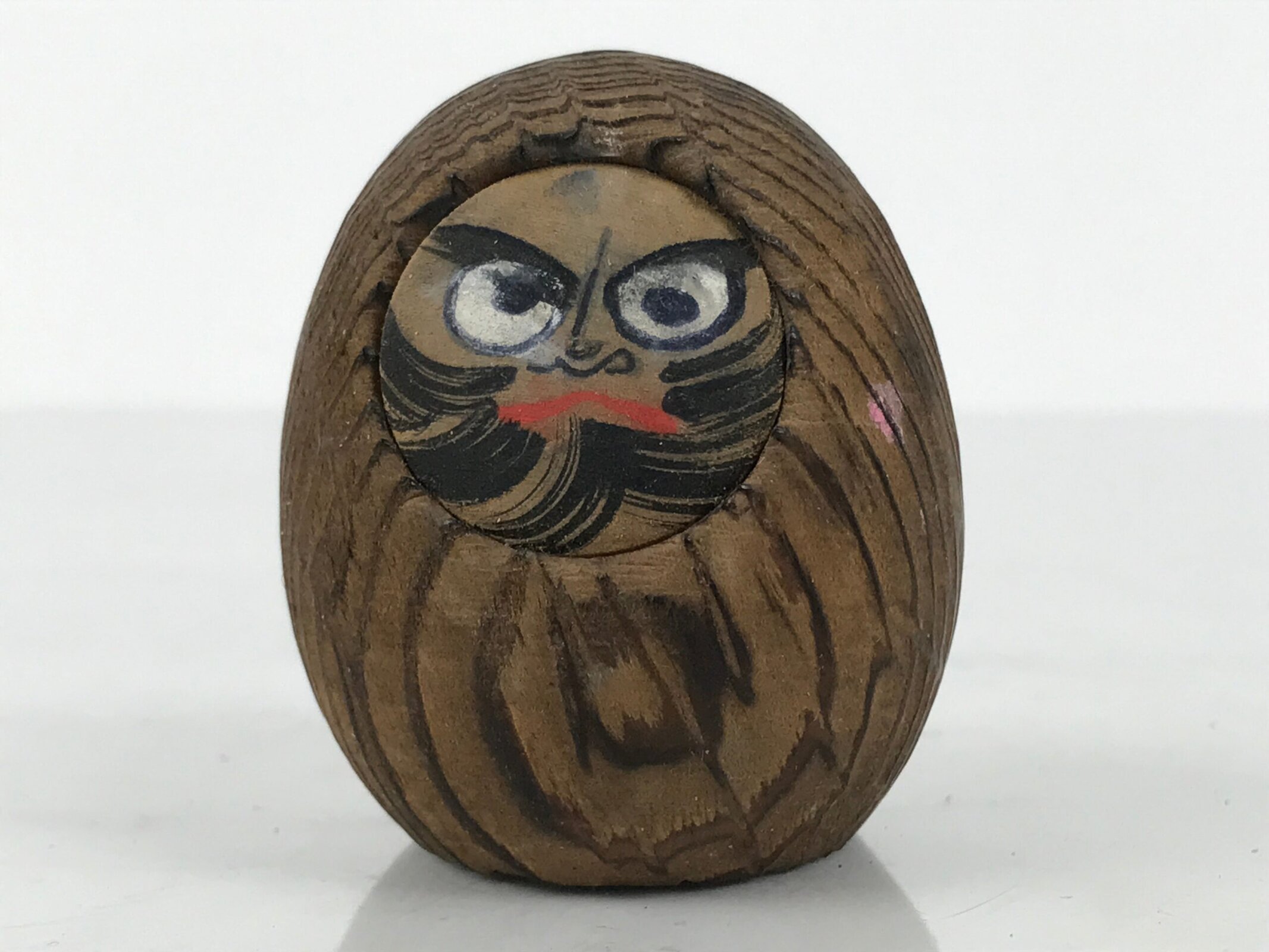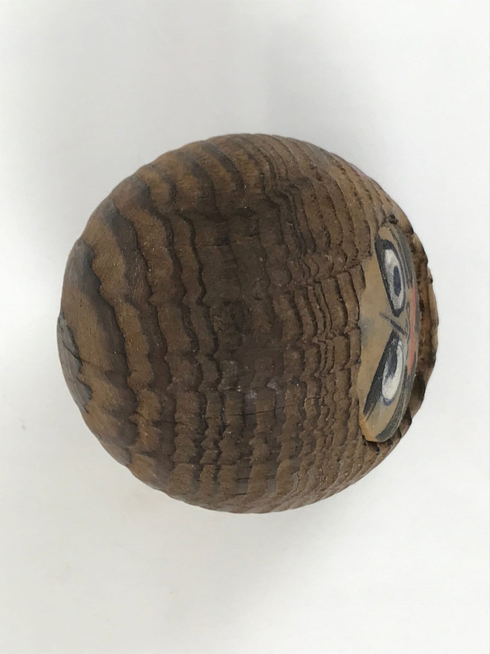 This is a vintage Japanese wooden Daruma figurine. It is cut out from a piece of wood, with slightly rounded sides and top, and a flat bottom. The face is painted on the recessed area. The wooden grain shows vertical lines on the side, concentric circles on the front and back, and stripe lines on the top.