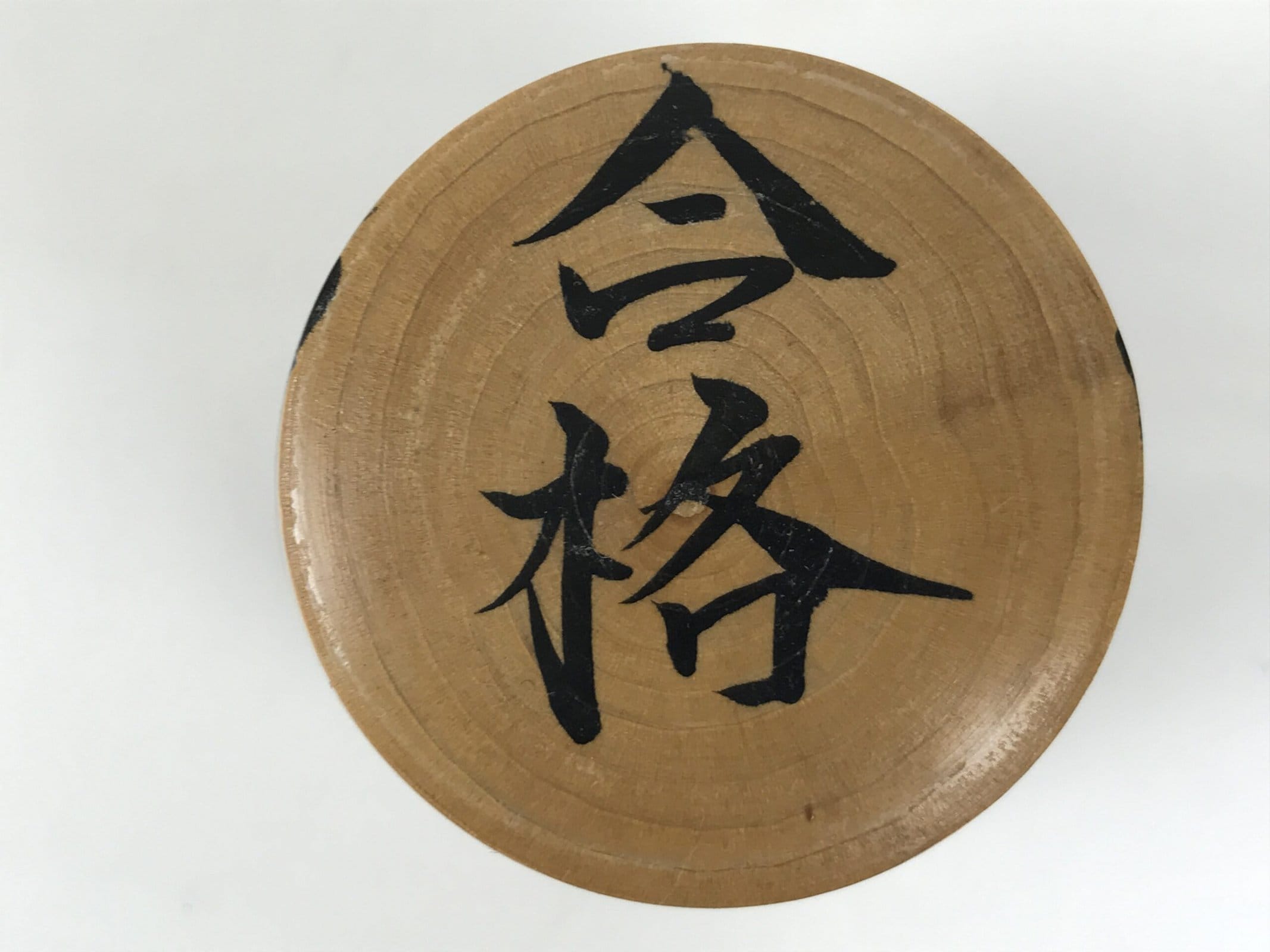 This is a vintage Japanese wooden Daruma figurine. It is cut out from a piece of wood, with slightly rounded sides and top, and a flat bottom. It features a black-painted Daruma face and Kanji characters on the top and bottom.