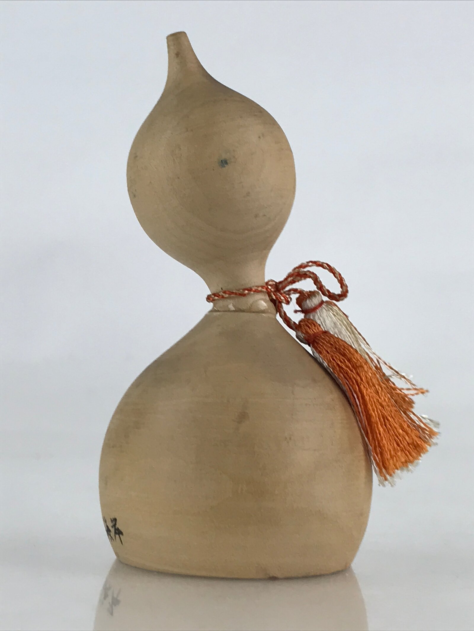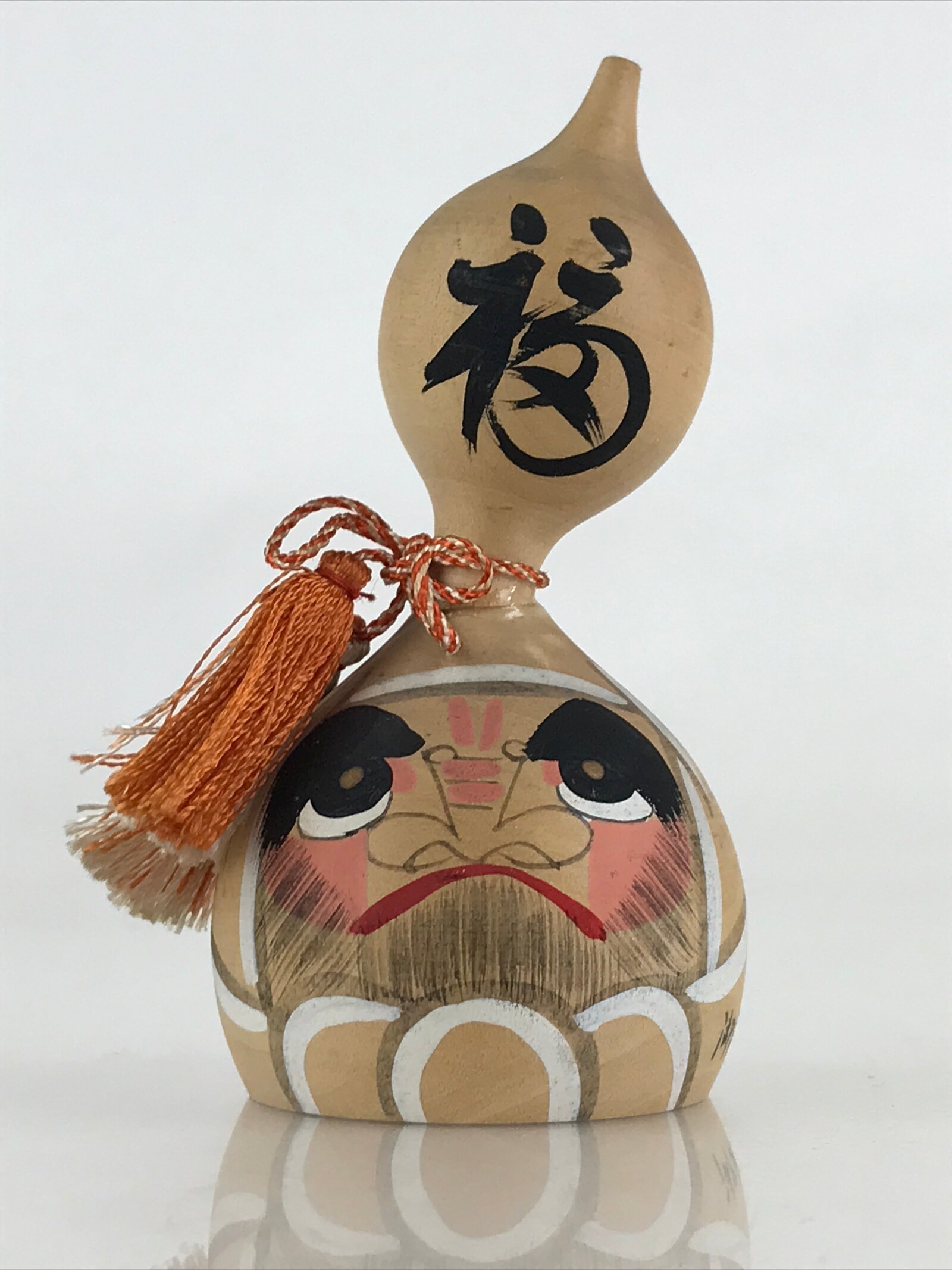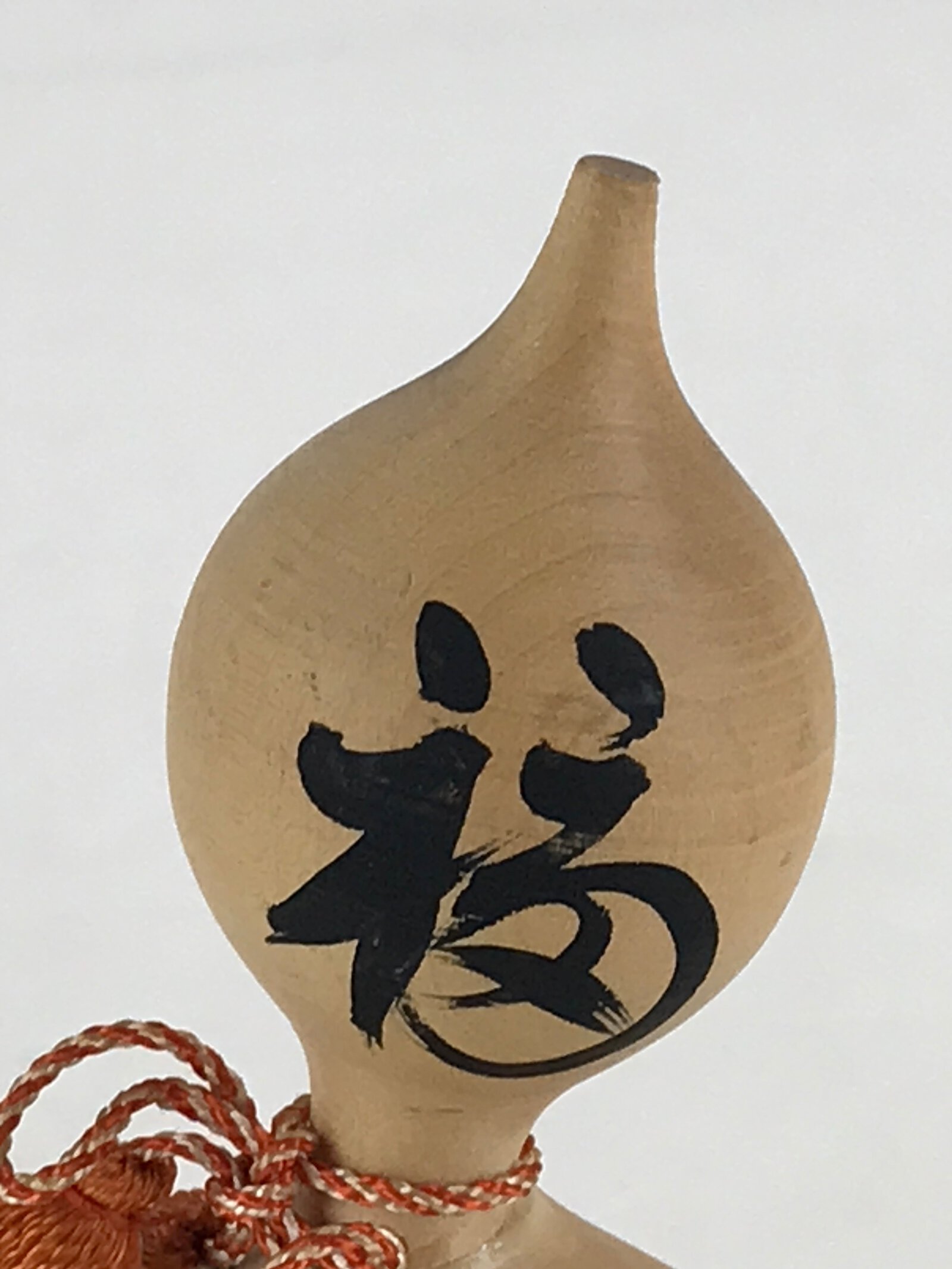 This is a vintage Japanese traditional craft wooden kokeshi doll, figurine. The daruma in the shape of a gourd has the kanji written meaning “Good fortune”. Kokeshi are simple wooden Japanese dolls with no arms or legs that have been crafted for more than 150 years (the late Edo period) as a toy and amulets for children.