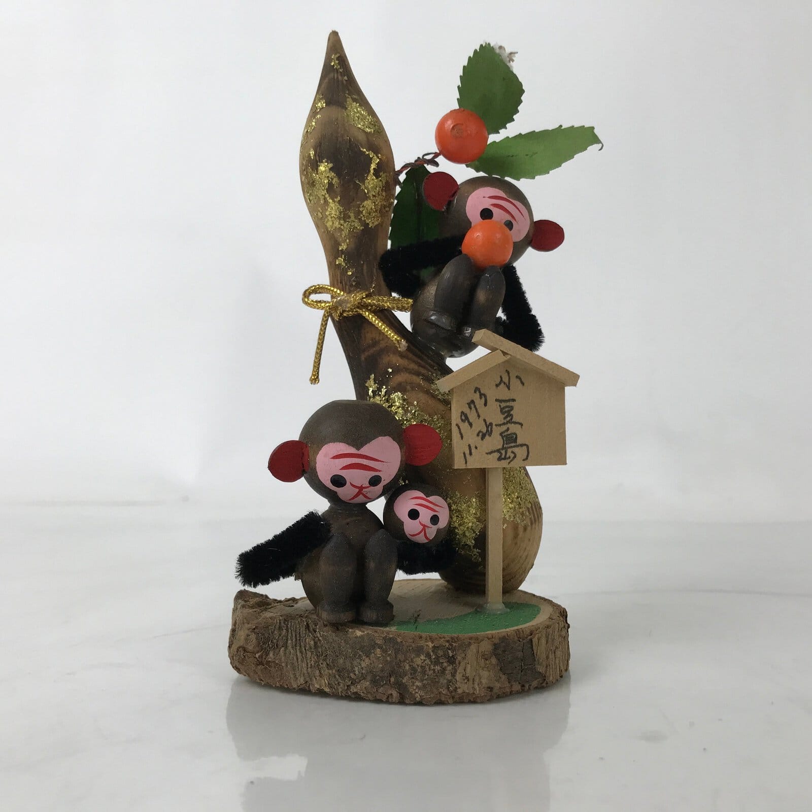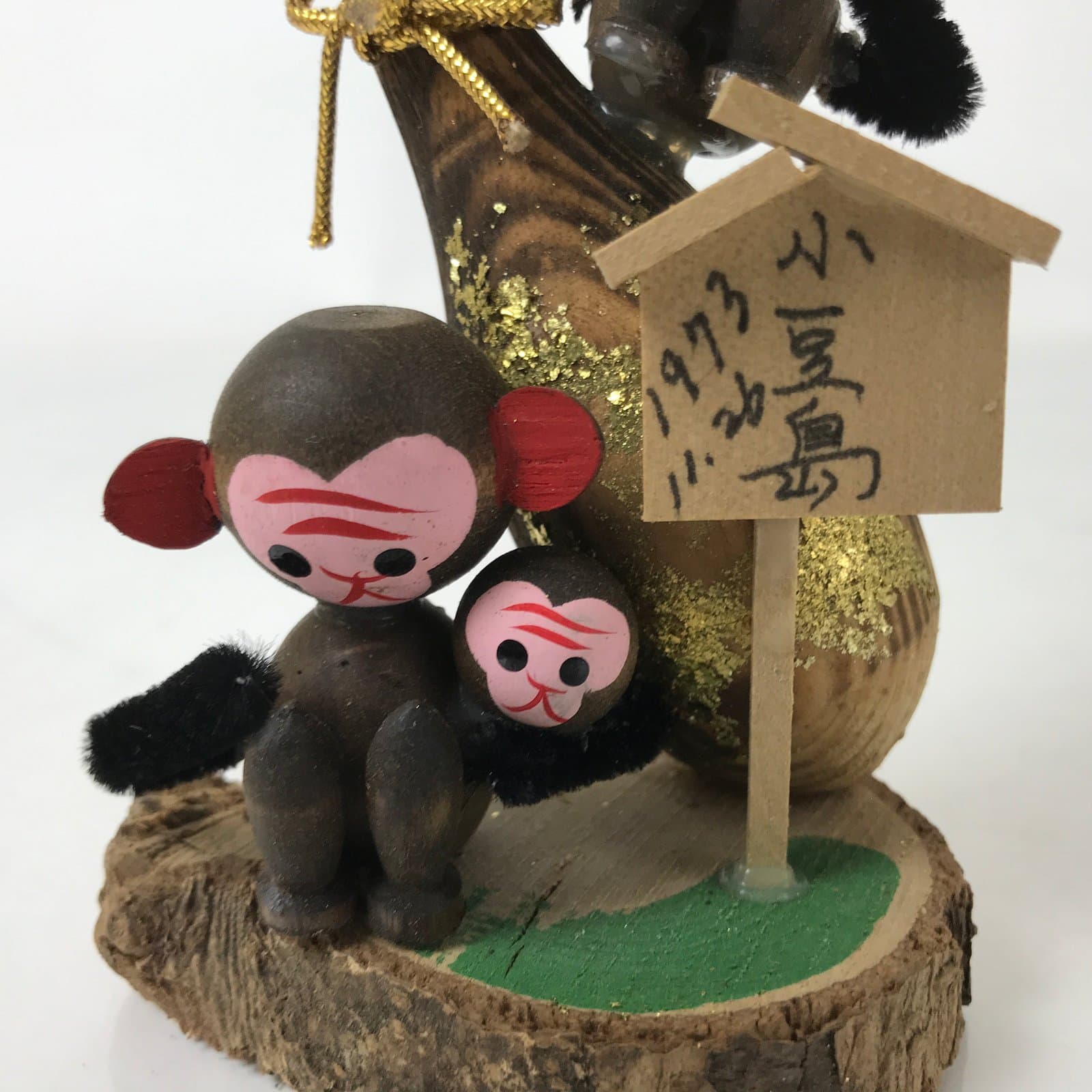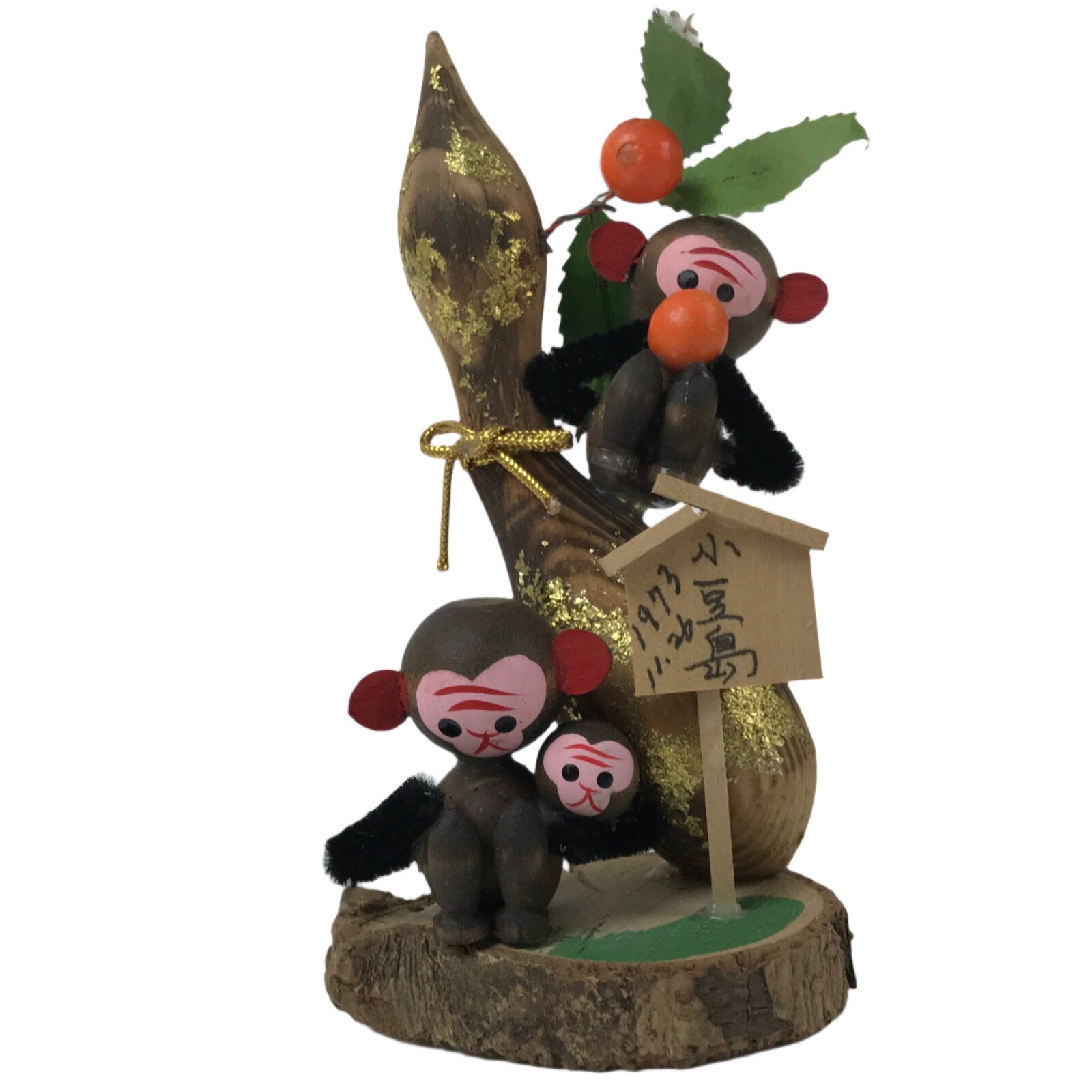 This vintage Japanese wooden kokeshi doll figurine features three monkeys on and around a gourd. One of them is holding an orange in its hands. It is a souvenir from Shodoshima island in the Seto Inland Sea of Japan, which has a monkey zoo. The wooden sign on the stand says Shodoshima and the visit date is Nov.26th, 1973.