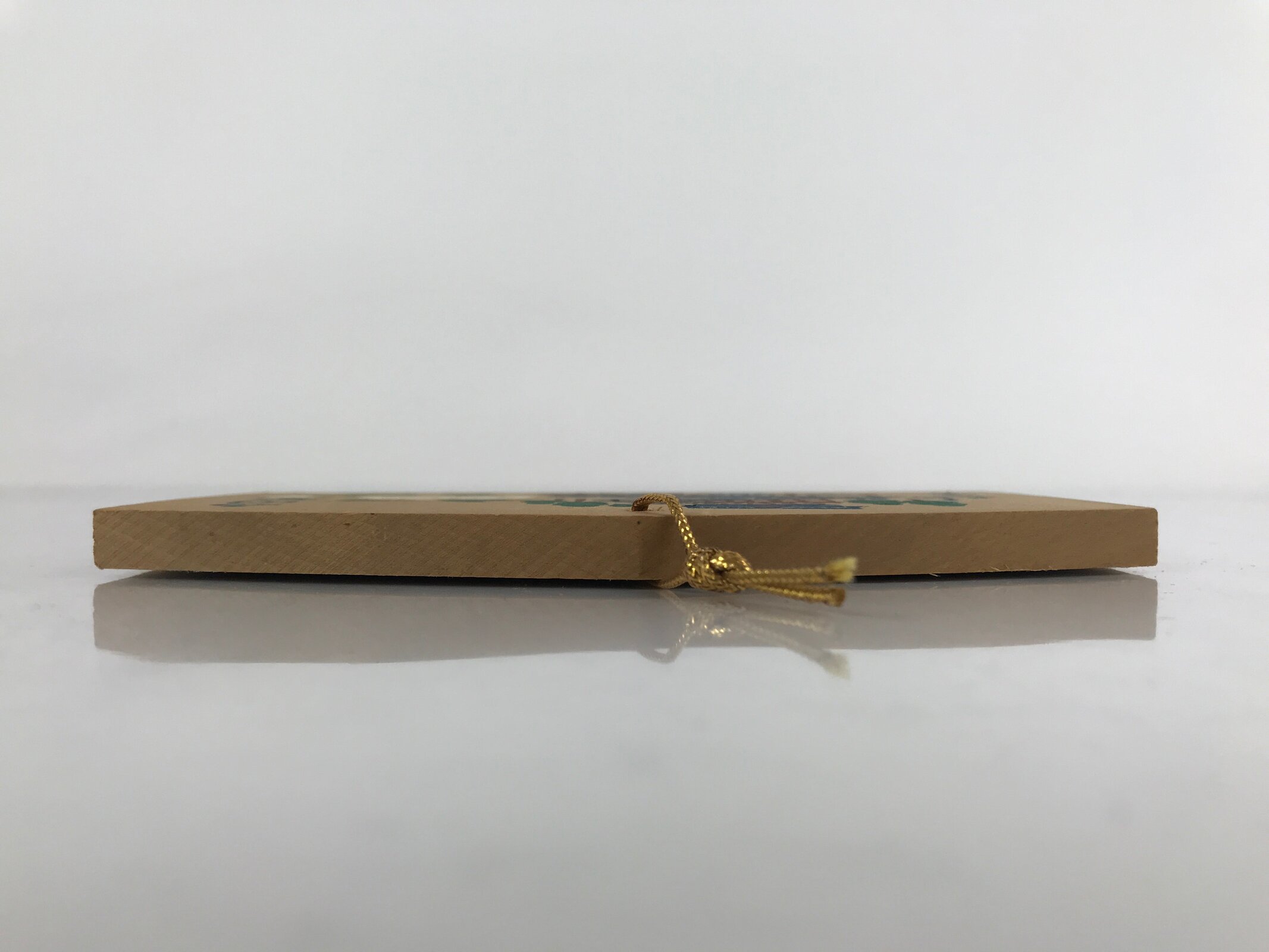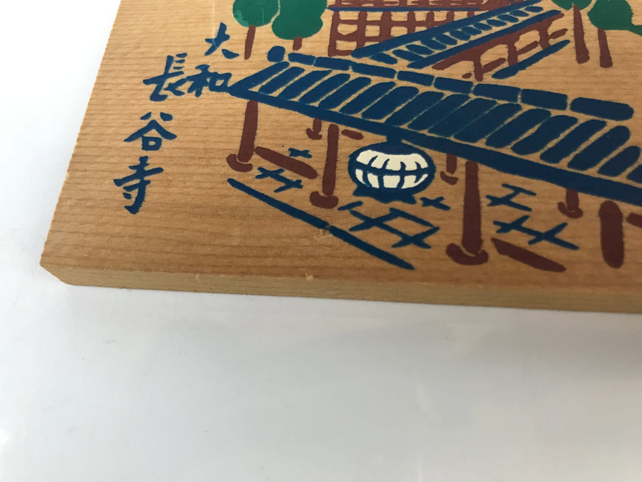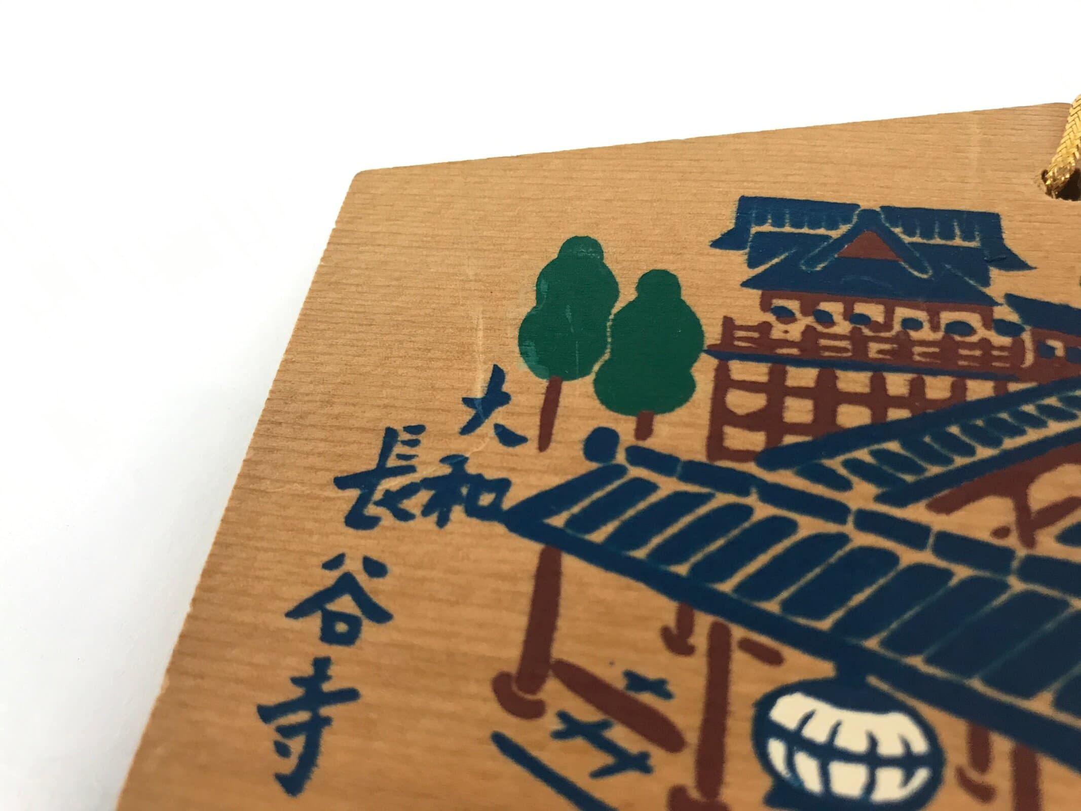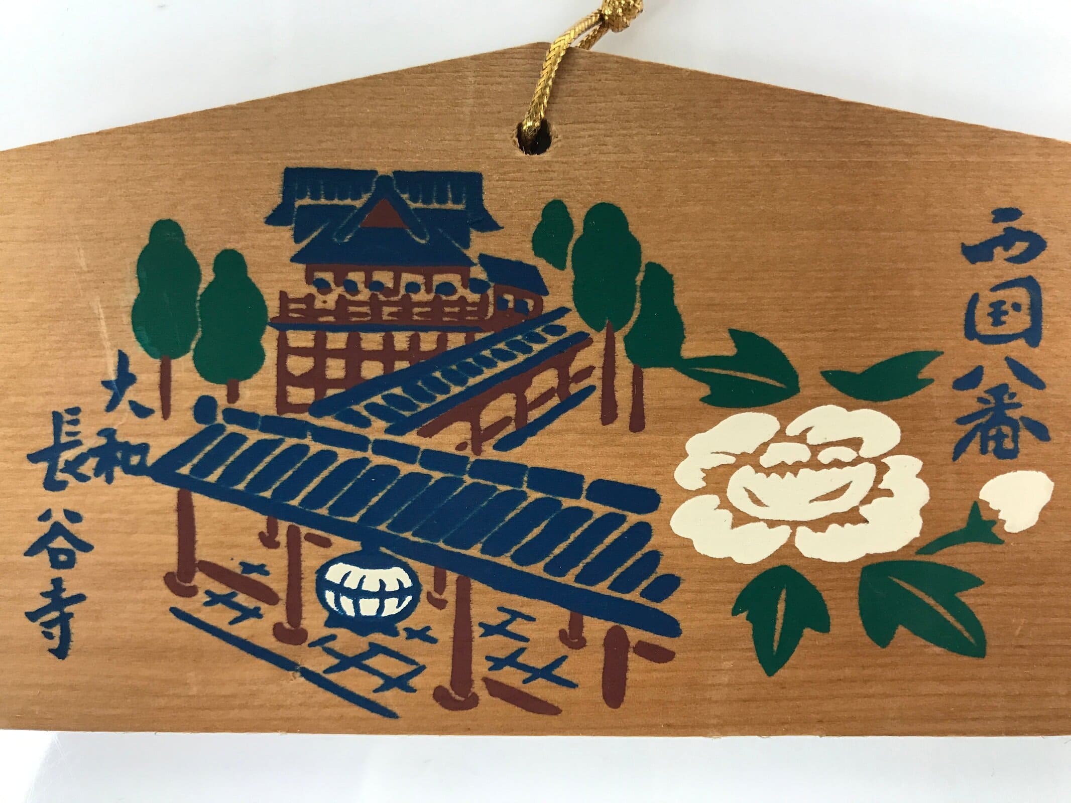 This vintage Japanese ema plaque has an illustration of the Hasedera temple, number eight of the Saikoku pilgrimage. It also has some inscriptions in blue. It has a golden braided cord.