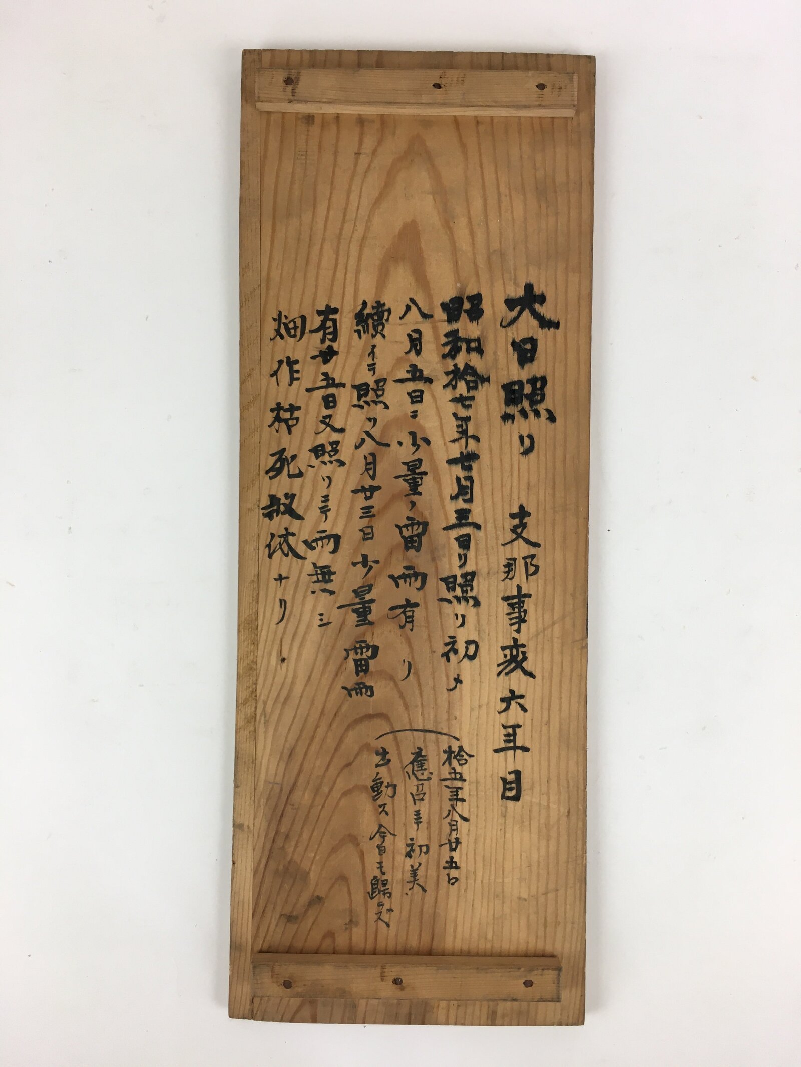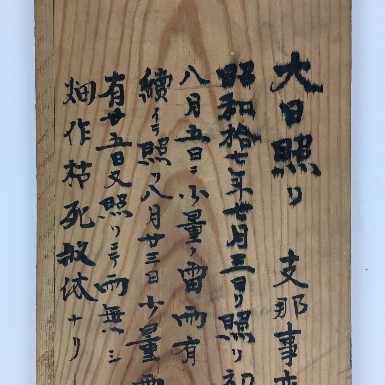 - Kanji on inside of lid: [Personal list of events in no given order] 6th year from Chinese incident, 1942 Drought, Crops died (dated July 3rd), A man named Hatsumi went to war and didn’t return (August 15th, 1940)