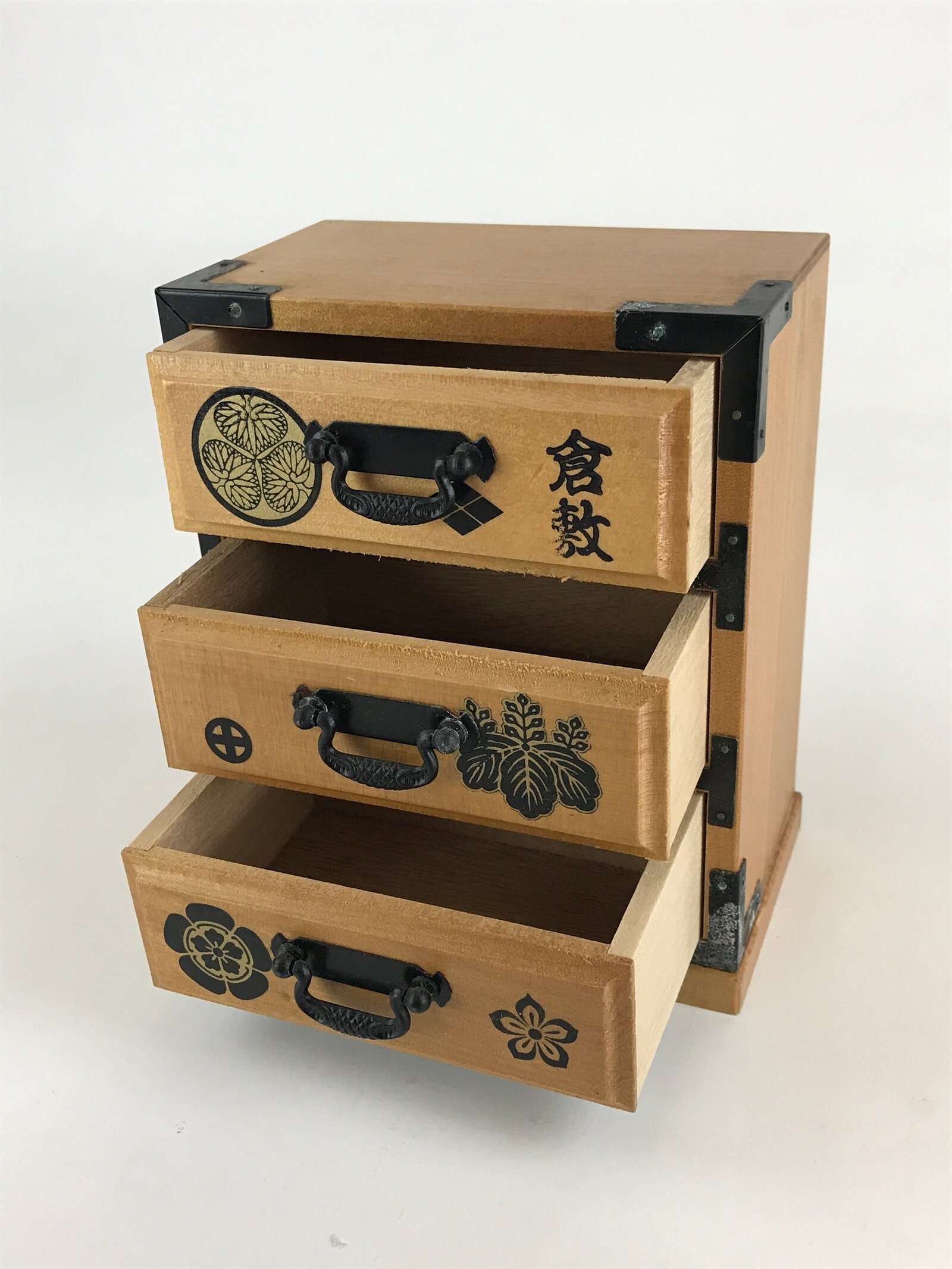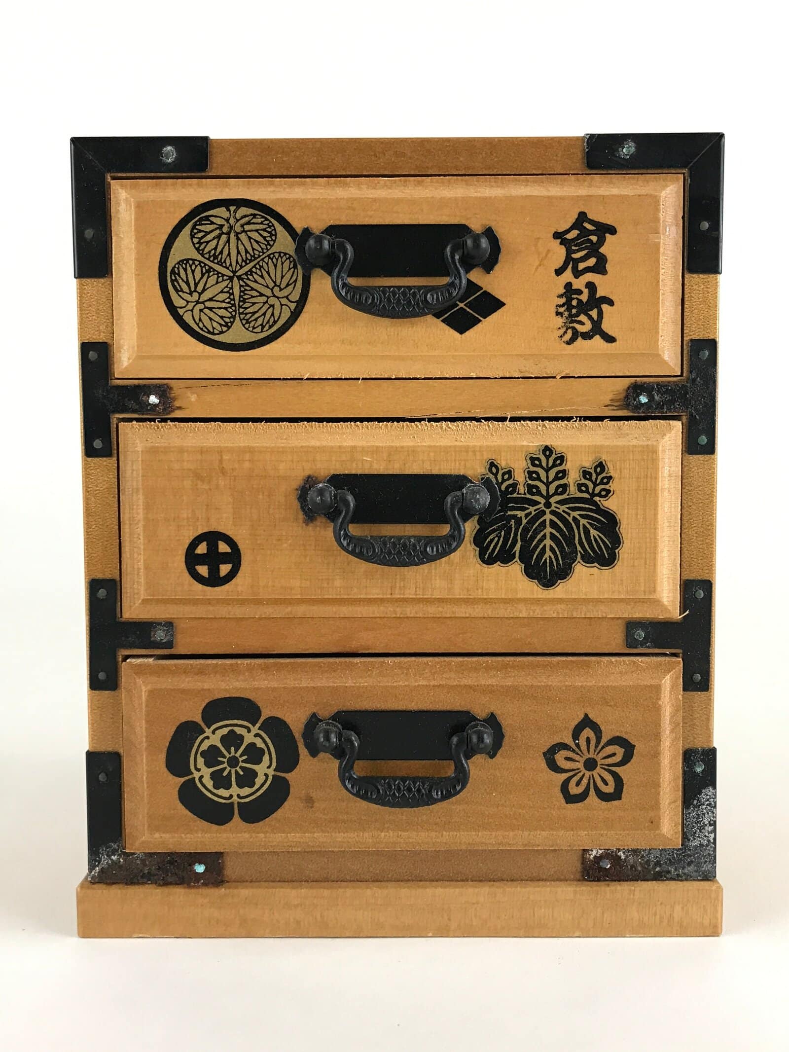 This is a Japanese sewing box, also called Haribako. This chest (Tansu) has 3 drawers. This can also be used for storing jewelry or other trinkets. The picture on the chest of drawers is a typical Japanese family crest. There is a word written in kanji, it says Kurashiki.