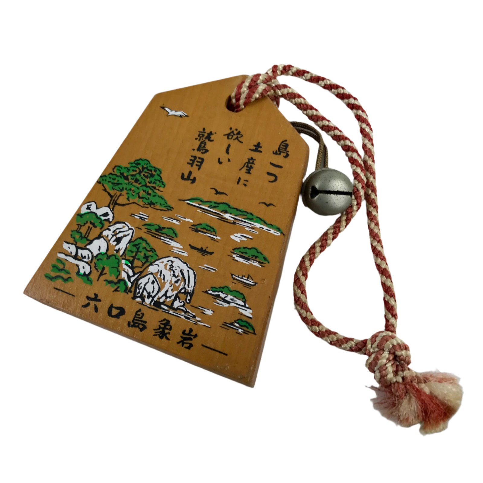 This vintage Japanese wooden souvenir plaque features a Haiku poem about Washuzan, a mountain in the Setonaikai National Park in Okayama. The illustration is of Mukuchijima or Mukuchi island, which is famous for the elephant-shaped Zoiwa rock. It has calligraphy on the back. This plaque has a red and white braided cord and a small bell.