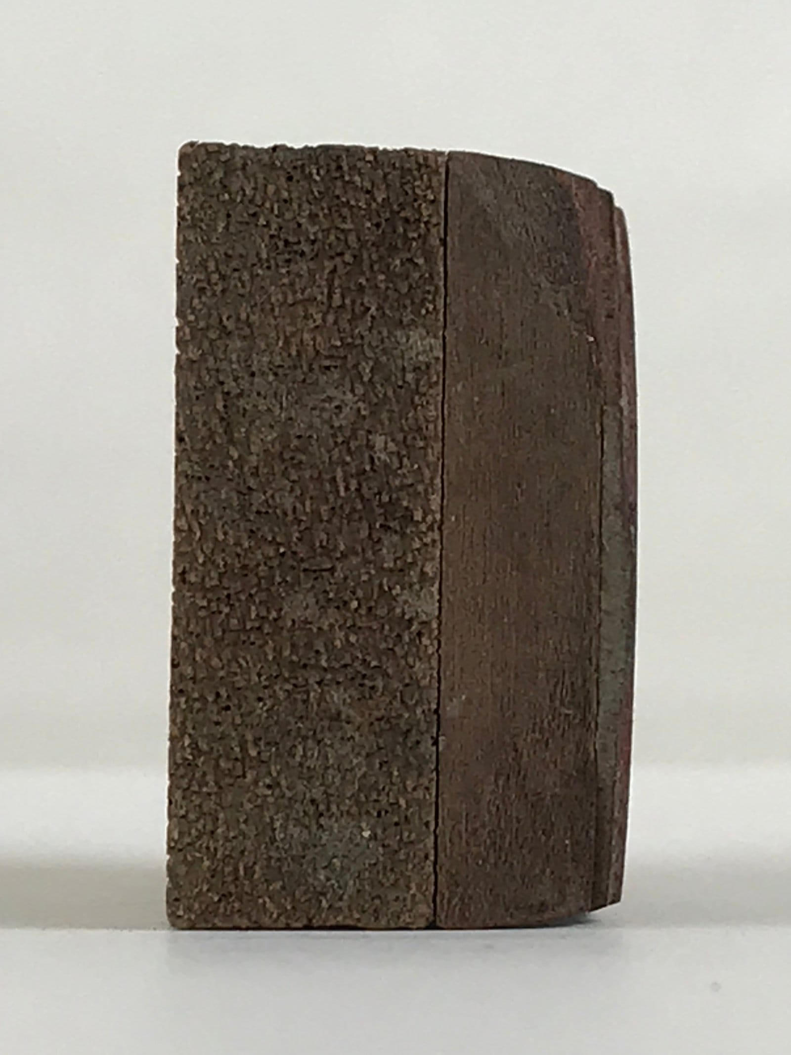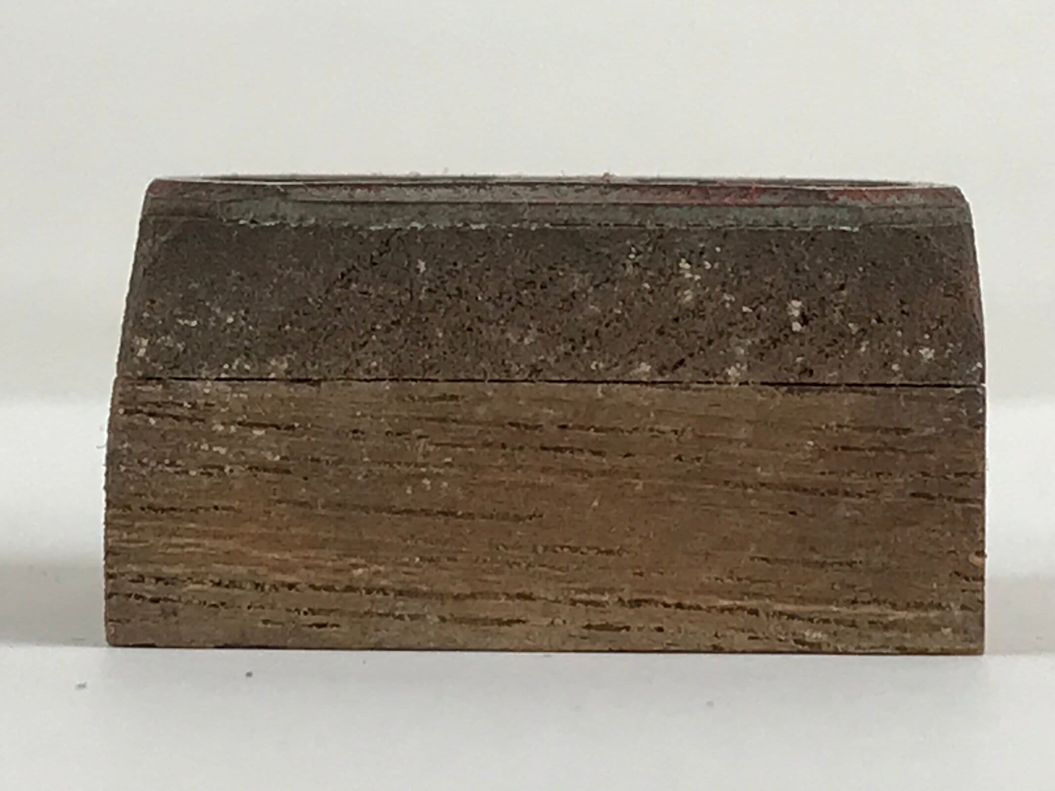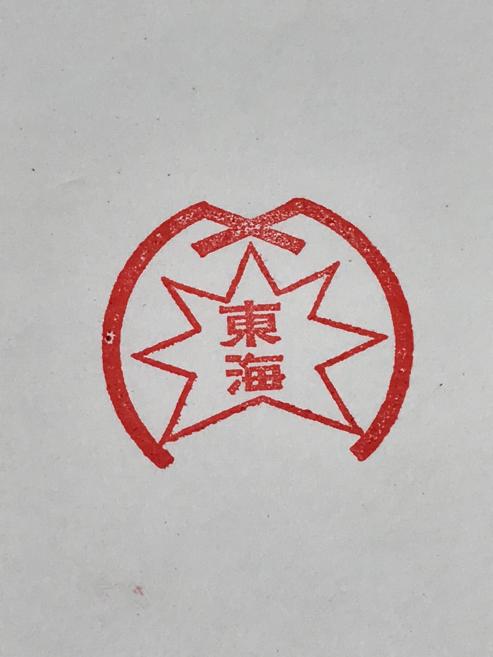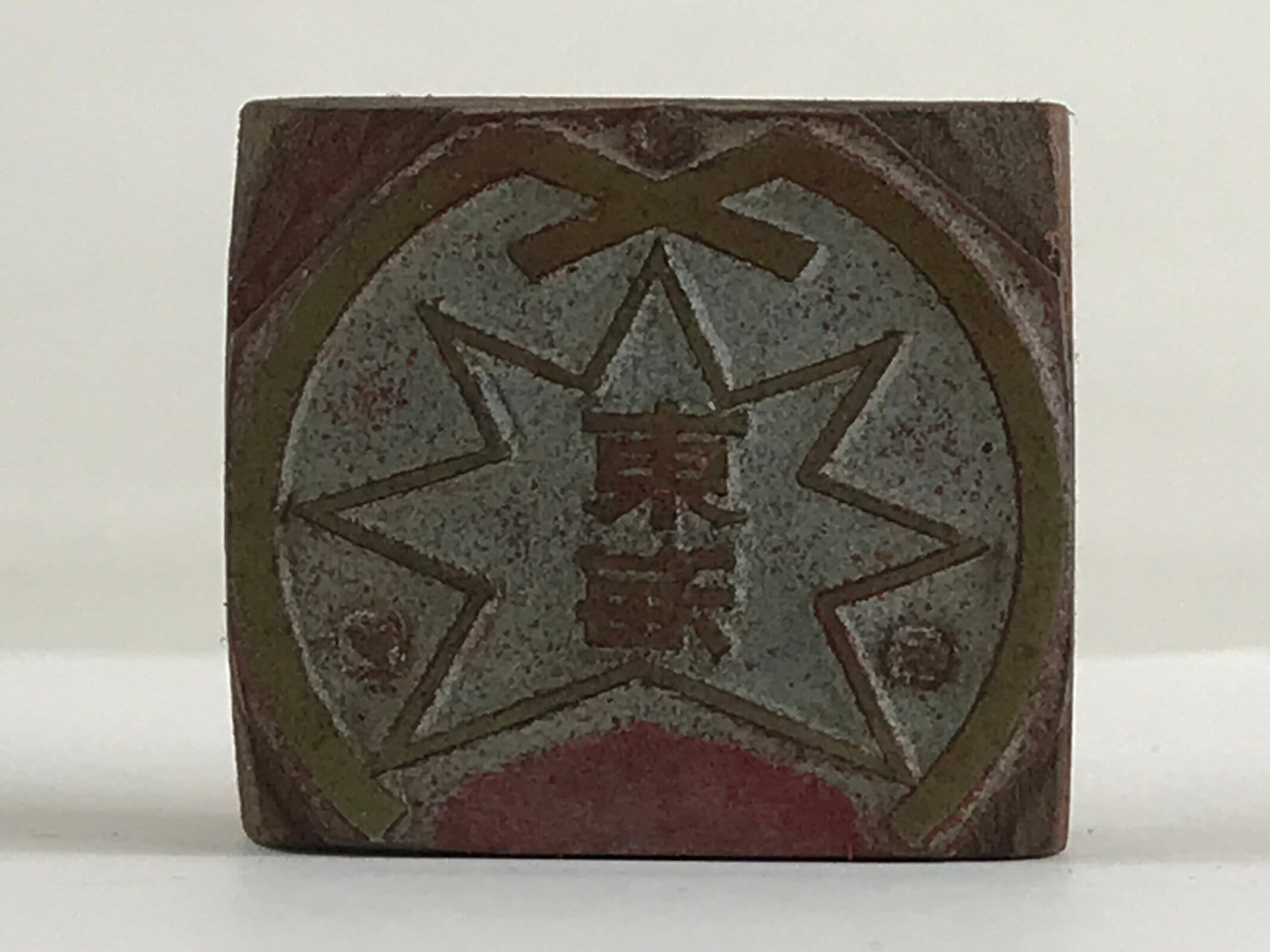 This is a vintage Japanese wooden seal. A metal plate with Kanji for Tokai written on it is stuck to the wood. Around the kanji is a star-like design. The Tōkai region is a subregion of the Chūbu region and Kansai region in Japan that runs along the Pacific Ocean.