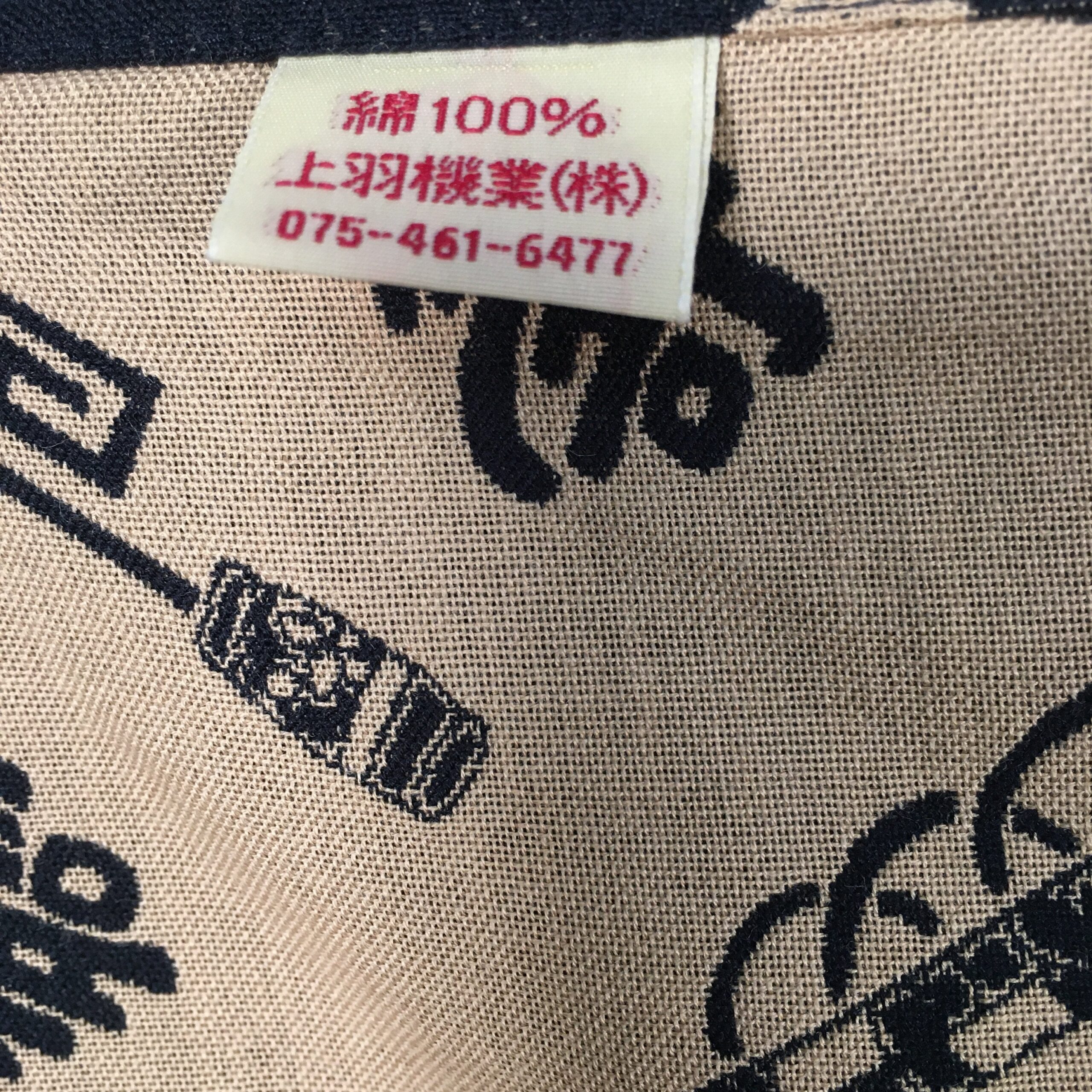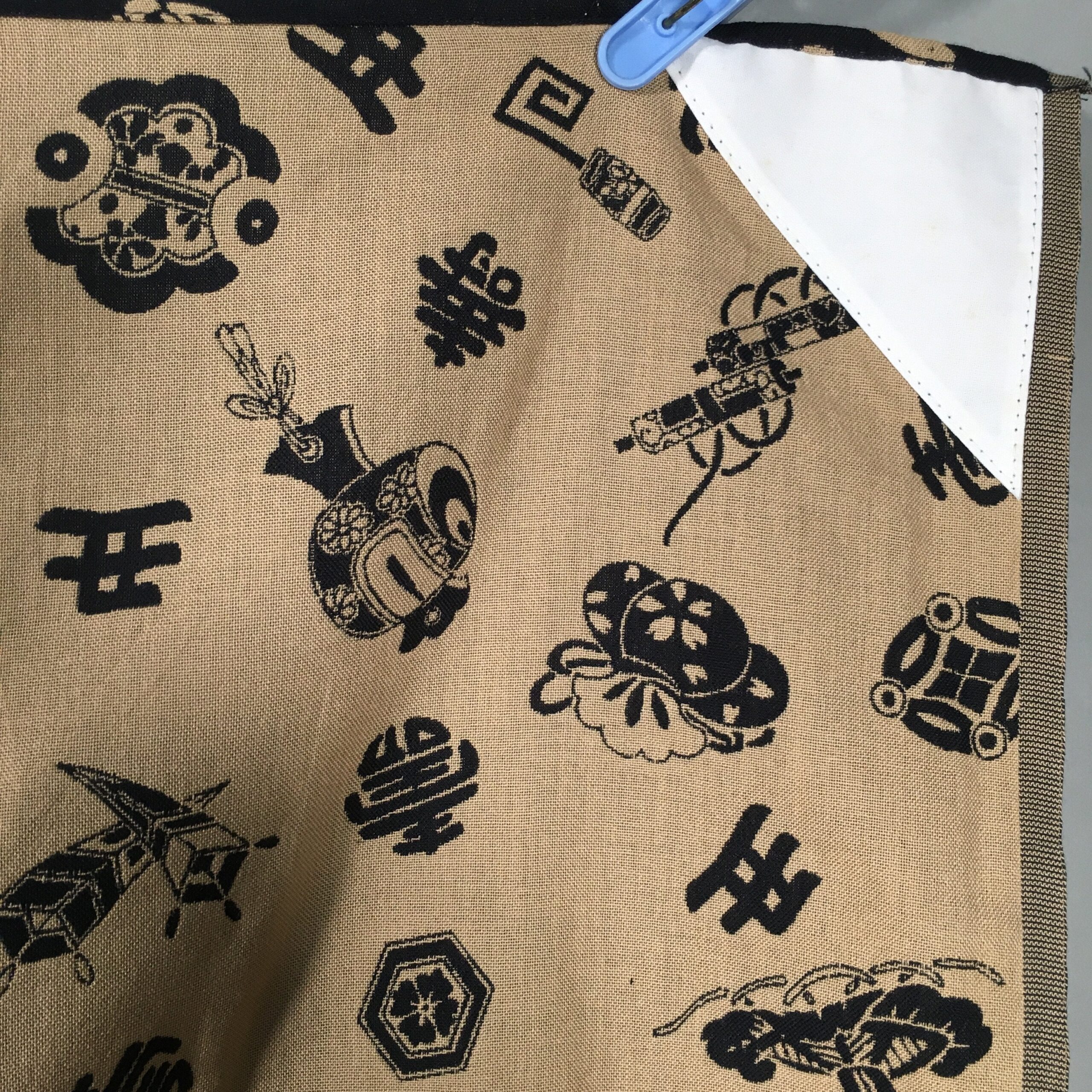 - Design: Dark navy and brown reversible Japanese pattern with kanji, lanterns and uchide no kozuchi