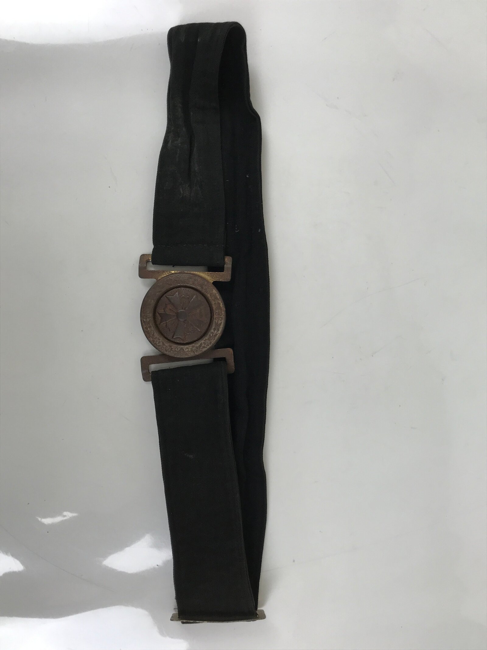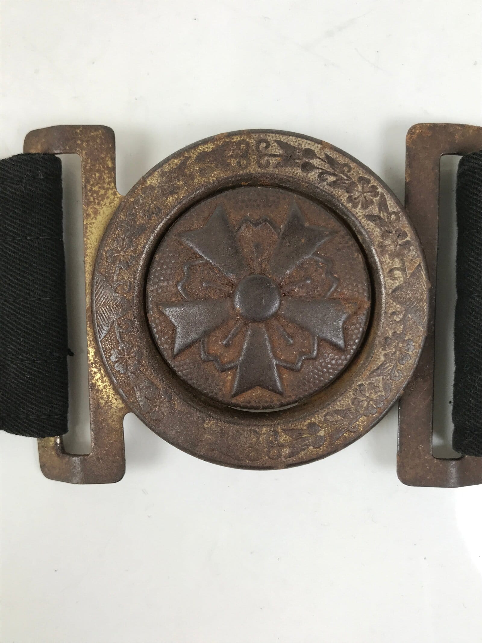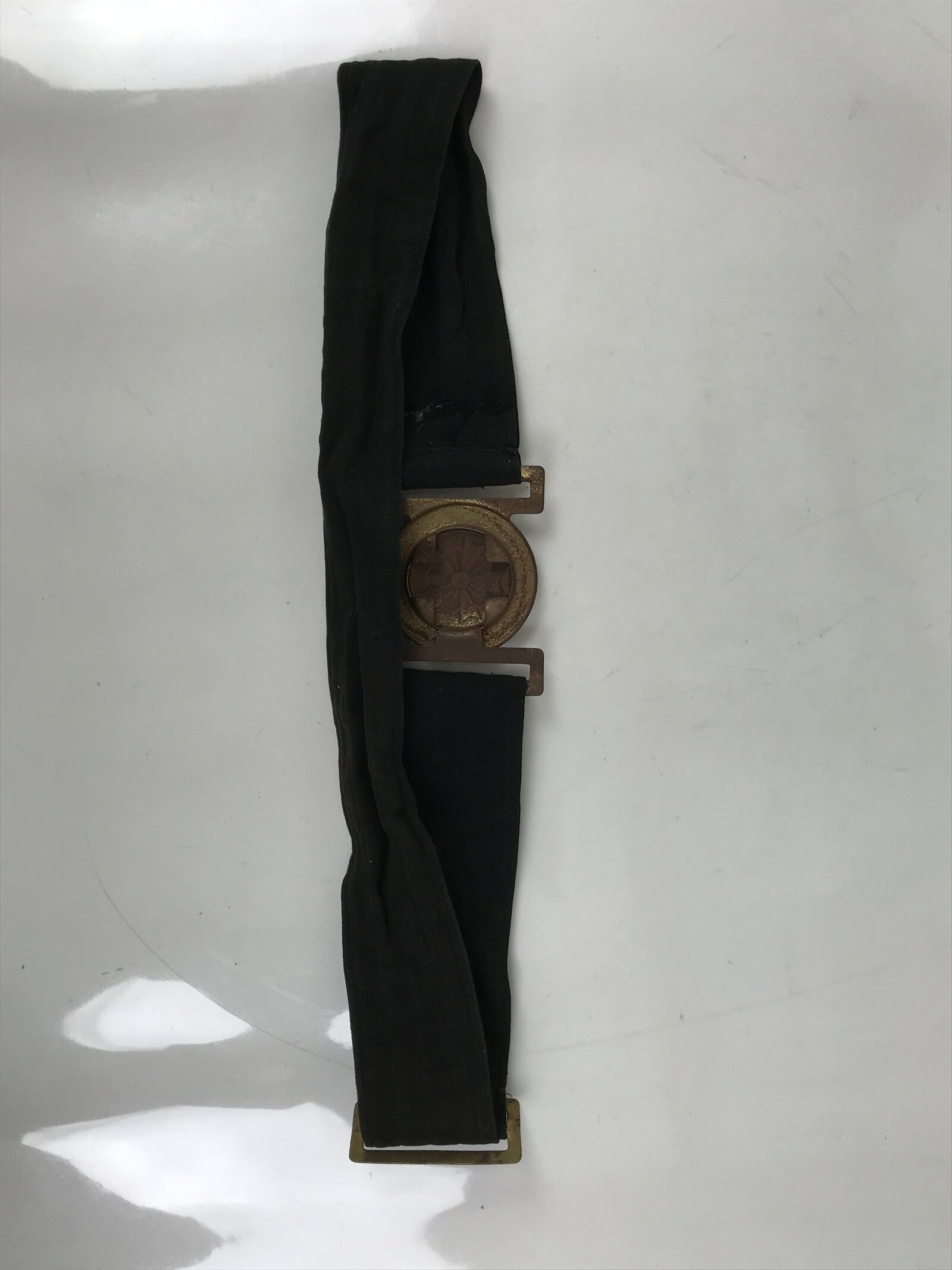 This is a vintage Japanese WWII fireman’s uniform belt. It is made of black cotton fabric and fastened together with a silver metal locking clasp. The clasp is round and fits through a cross-shaped hole that holds the belt together by tension. The clasp has a round image of a cherry blossom.