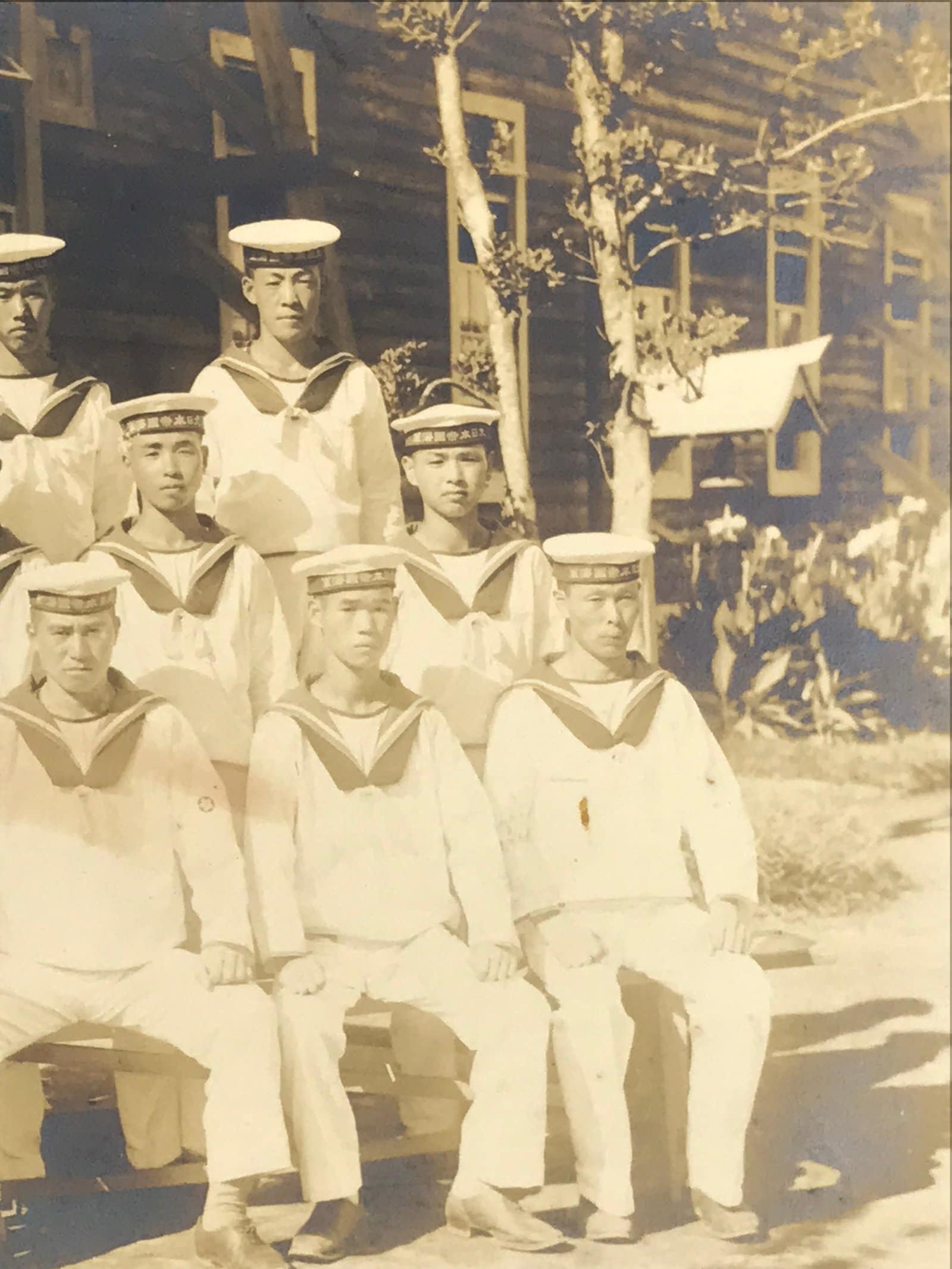 This is an original vintage Showa sepia tone photograph of a group of Japanese Navy sailors in full uniform.