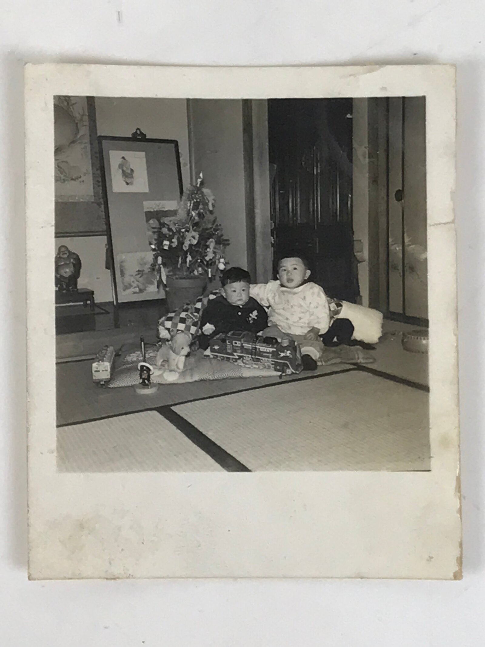 This is an original vintage Showa-era black and white portrait photograph of two small children. The boys are dressed in winter clothes and are seated against a rolled blanket in front of a small Christmas tree. There are several toys in front of them, including a couple of trains, a stuffed dog, and a drum.