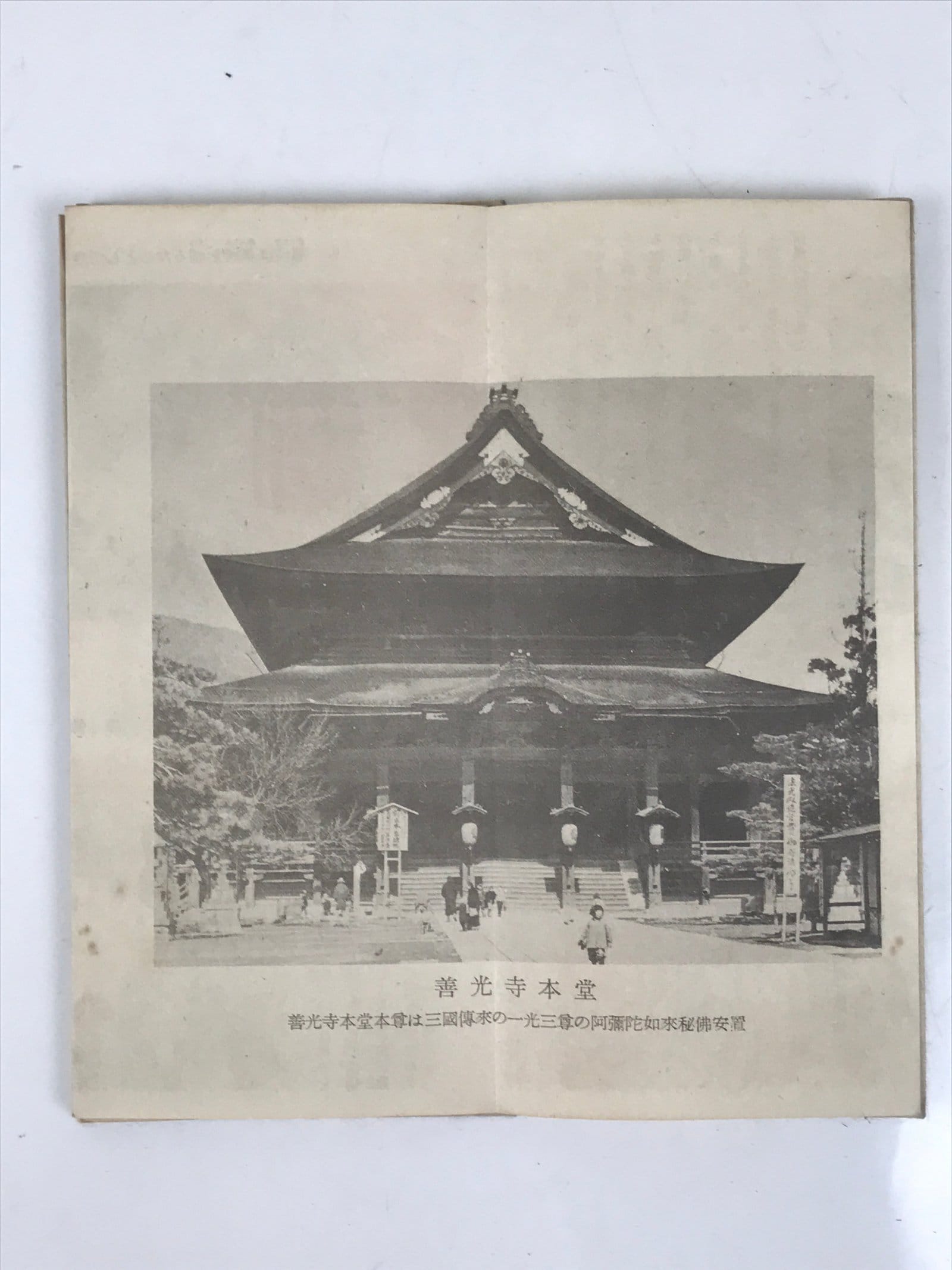 This vintage Japanese folding booklet is a souvenir from Zenkoji temple in Nagano prefecture. It has black-and-white photos of the temple on one side and texts with colored illustrations on the other. Texts are likely Buddhist stories. The booklet was published in 1949 (Showa 24).