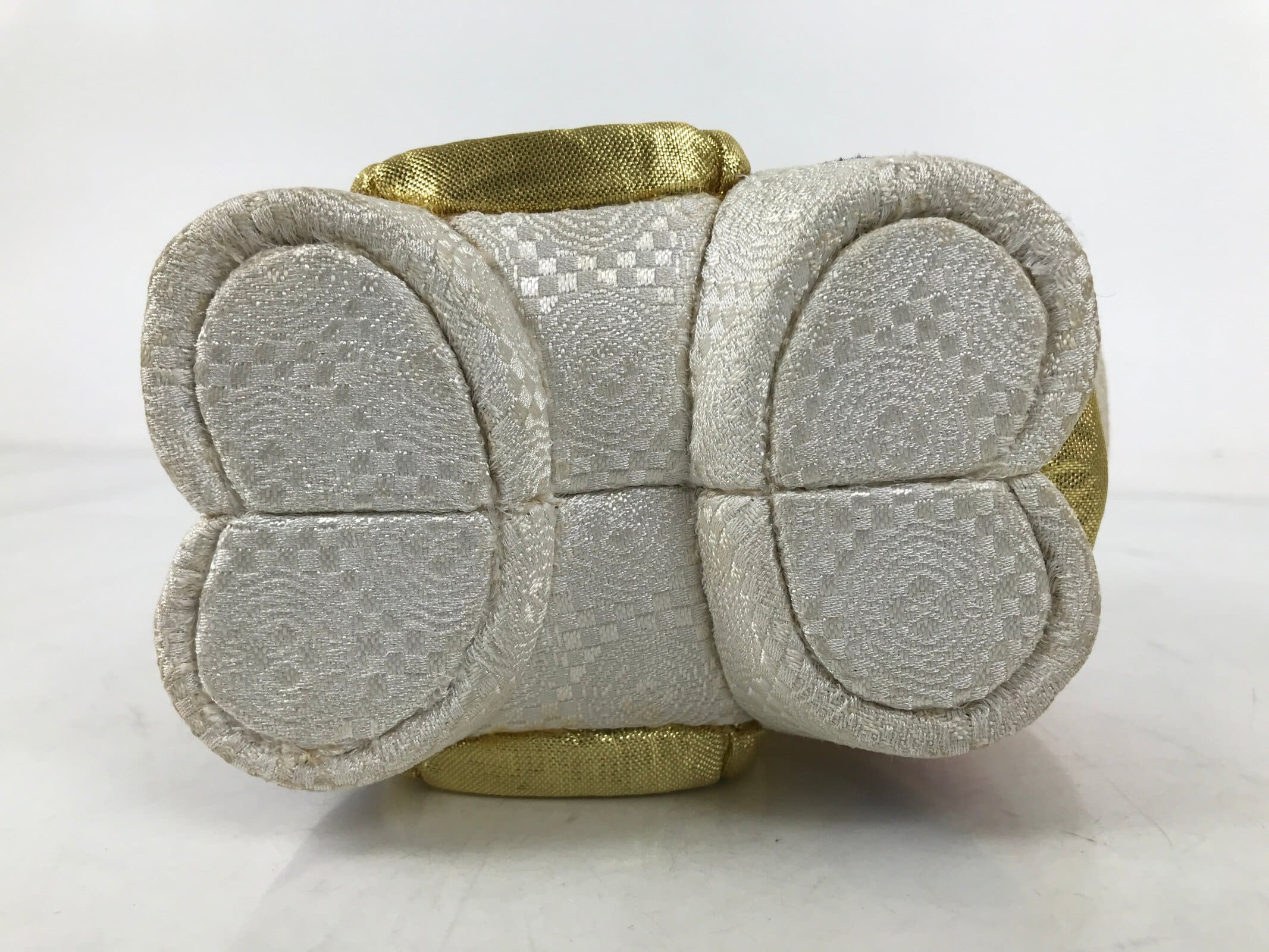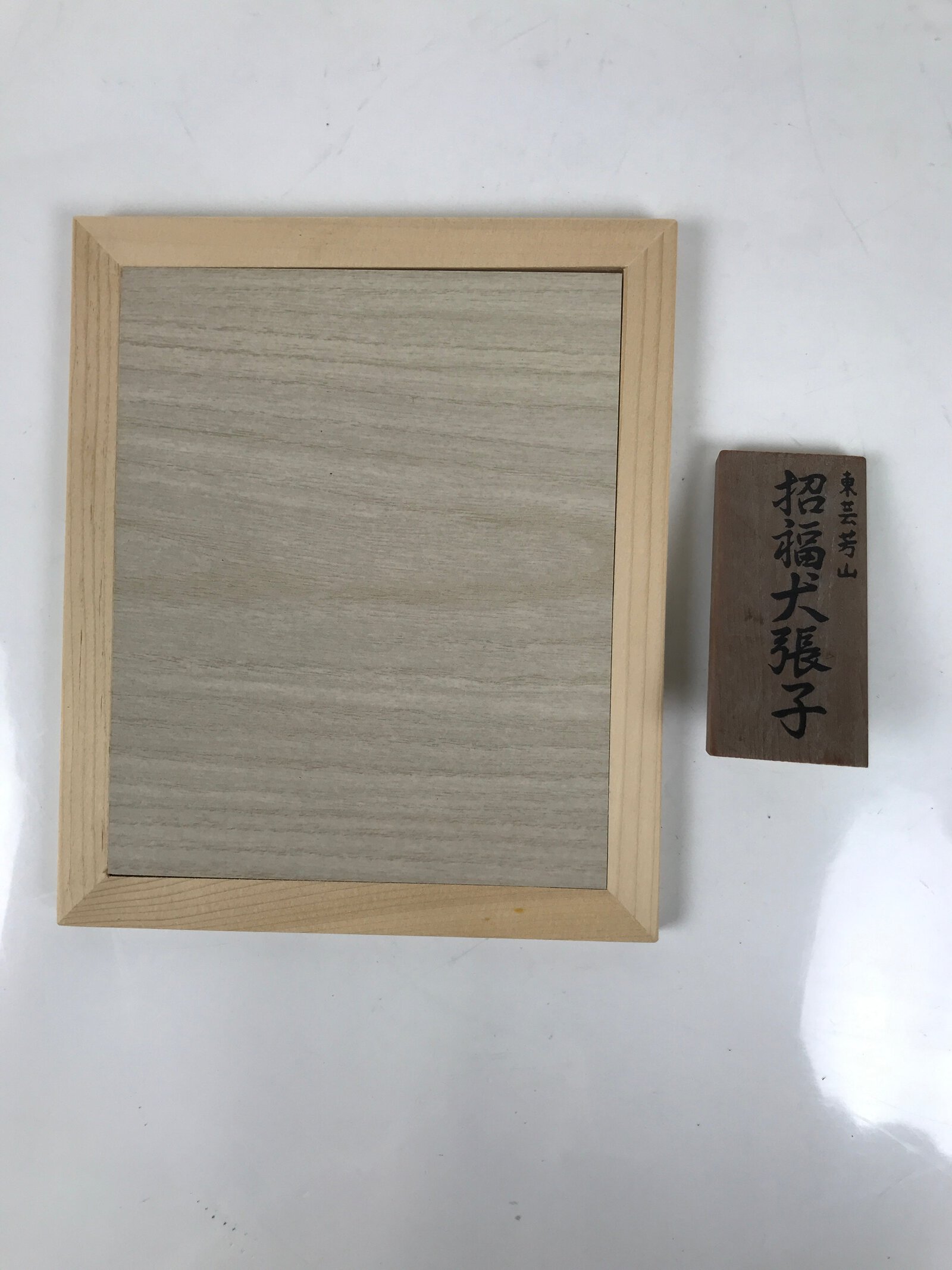 This vintage Japanese Kimekomi fabric doll represents the form of inuhariko, a dog-shaped figure traditionally made of paper-mache. Dogs are one of the Chinese zodiac animals. Inuhariko is a toy used as an amulet for kids. It has a wooden base with silk fabric applied according to the kimekomi technique. The dog is white and purple and wears an orange saddle-like cloth. A wooden sign and a wooden stand are included. It also comes with extra fabric and the original paper box.