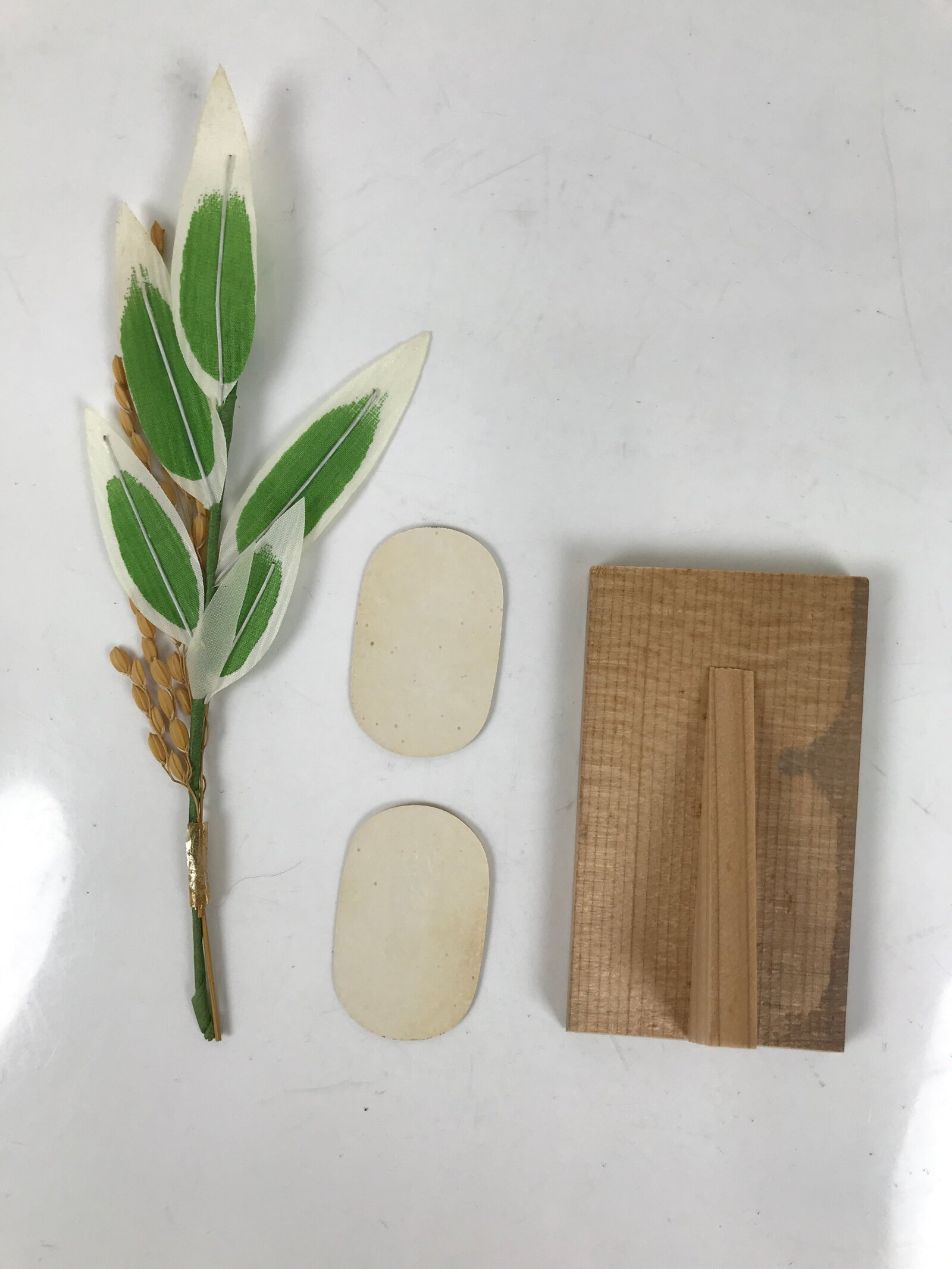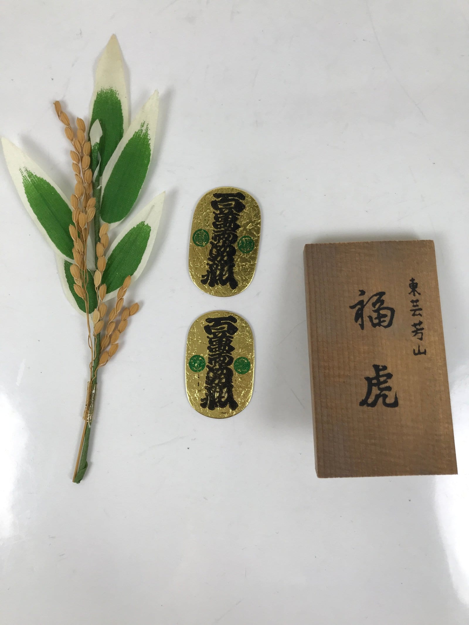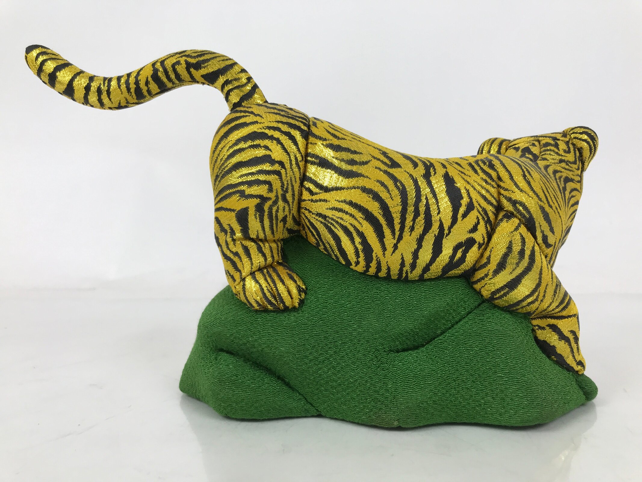 This vintage Japanese Kimekomi fabric doll represents a tiger, one of the Chinese zodiac animals, and is a decoration for the New Year. It has a wooden base with silk fabric applied according to the kimekomi technique. A wooden stand, sign, and small accessories (branch with leaves and paper koban coins) are included. It also comes with extra fabric and the original paper box.