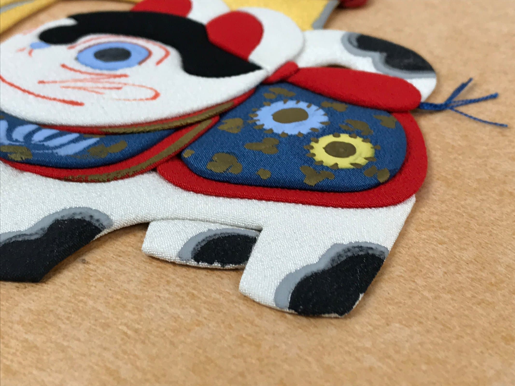This item is a vintage Japanese shikishi art board. In the style of oshie zaiku, or padded silk, this piece features raised zodiac image of a tiger and other feline traditional figurines in various colors. This particular piece was handcrafted at the Higashigawa Handicraft Workshop in Omi Hachiman, Shiga Prefecture and comes with its original cardboard cover. It is signed with red seals.