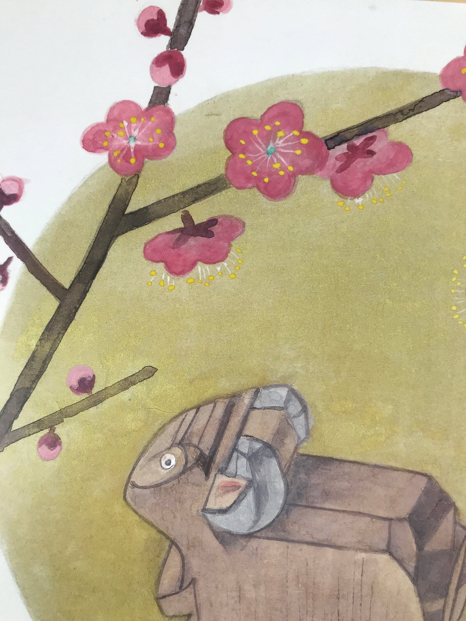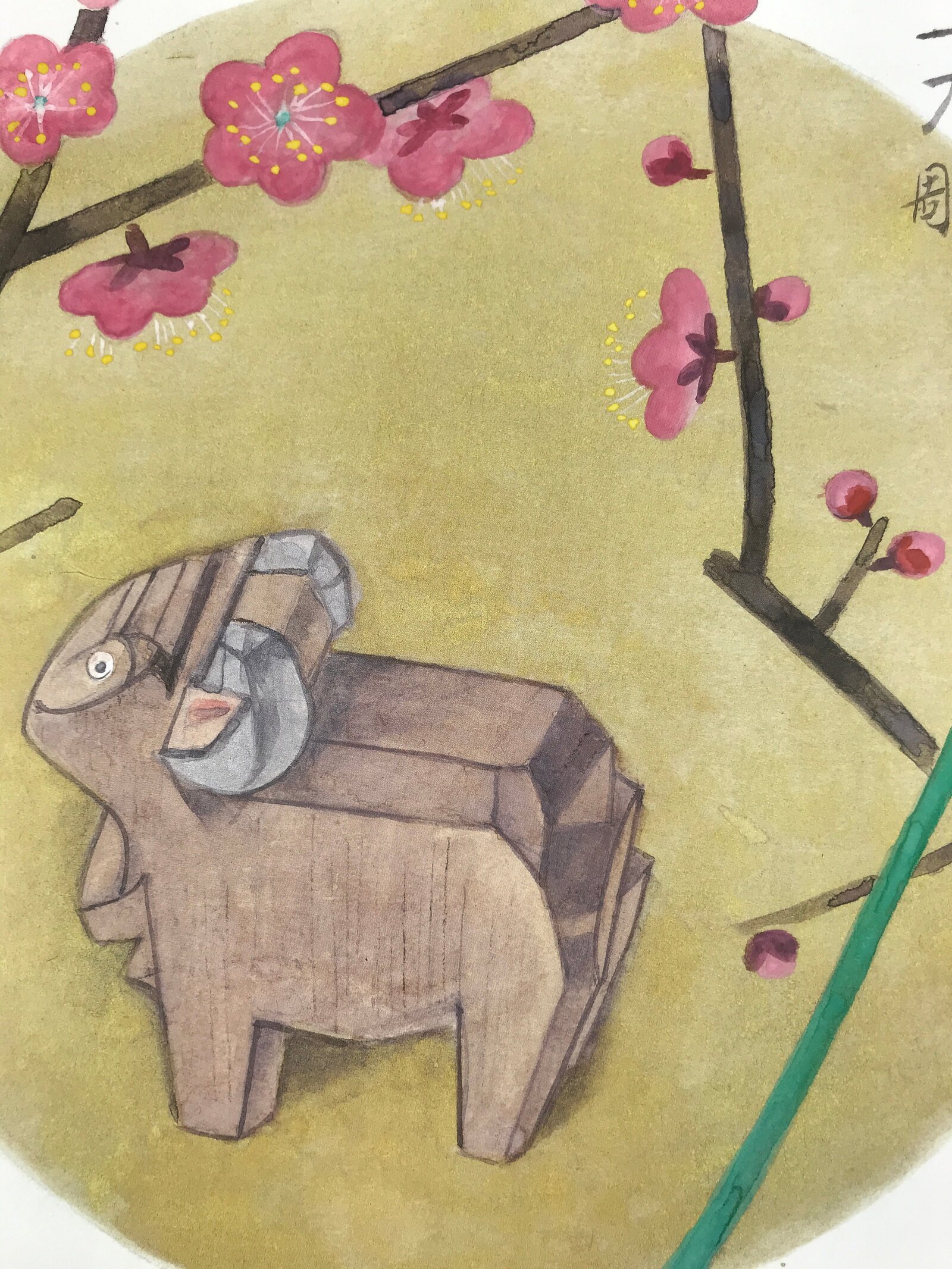 This is a vintage Japanese shikishi art board printed with the image of a carved wooden sheep representing the zodiac among branches of pink plum blossoms. There is a red stamp signature and the kanji on the upper right corner says “Nara (prefecture)” and “ittobori (wood carving)”.