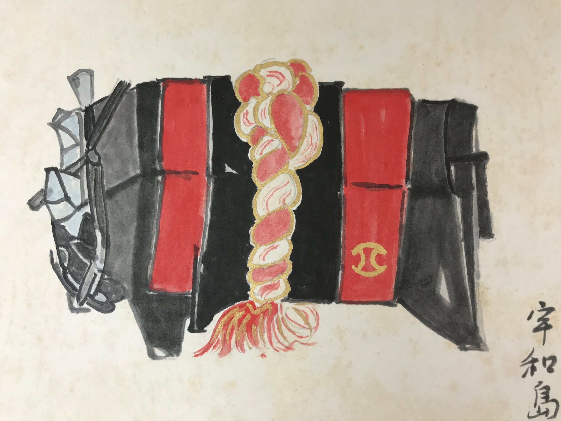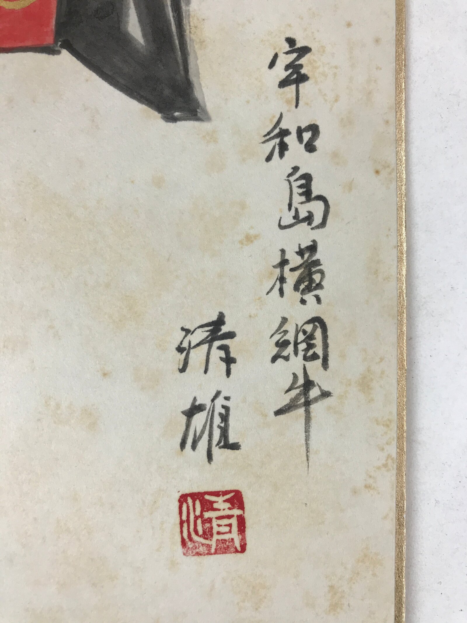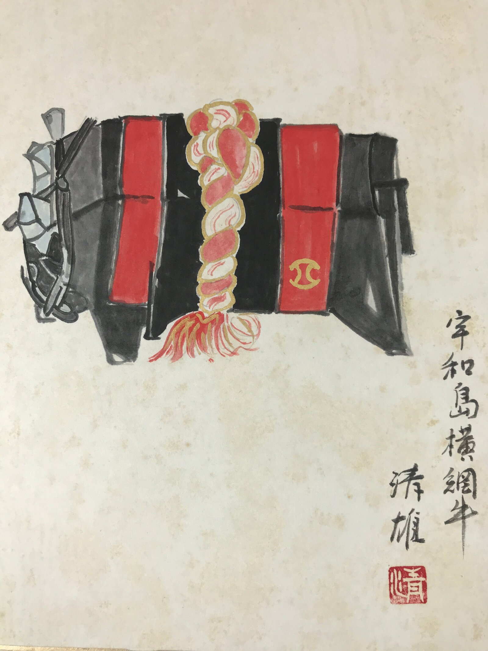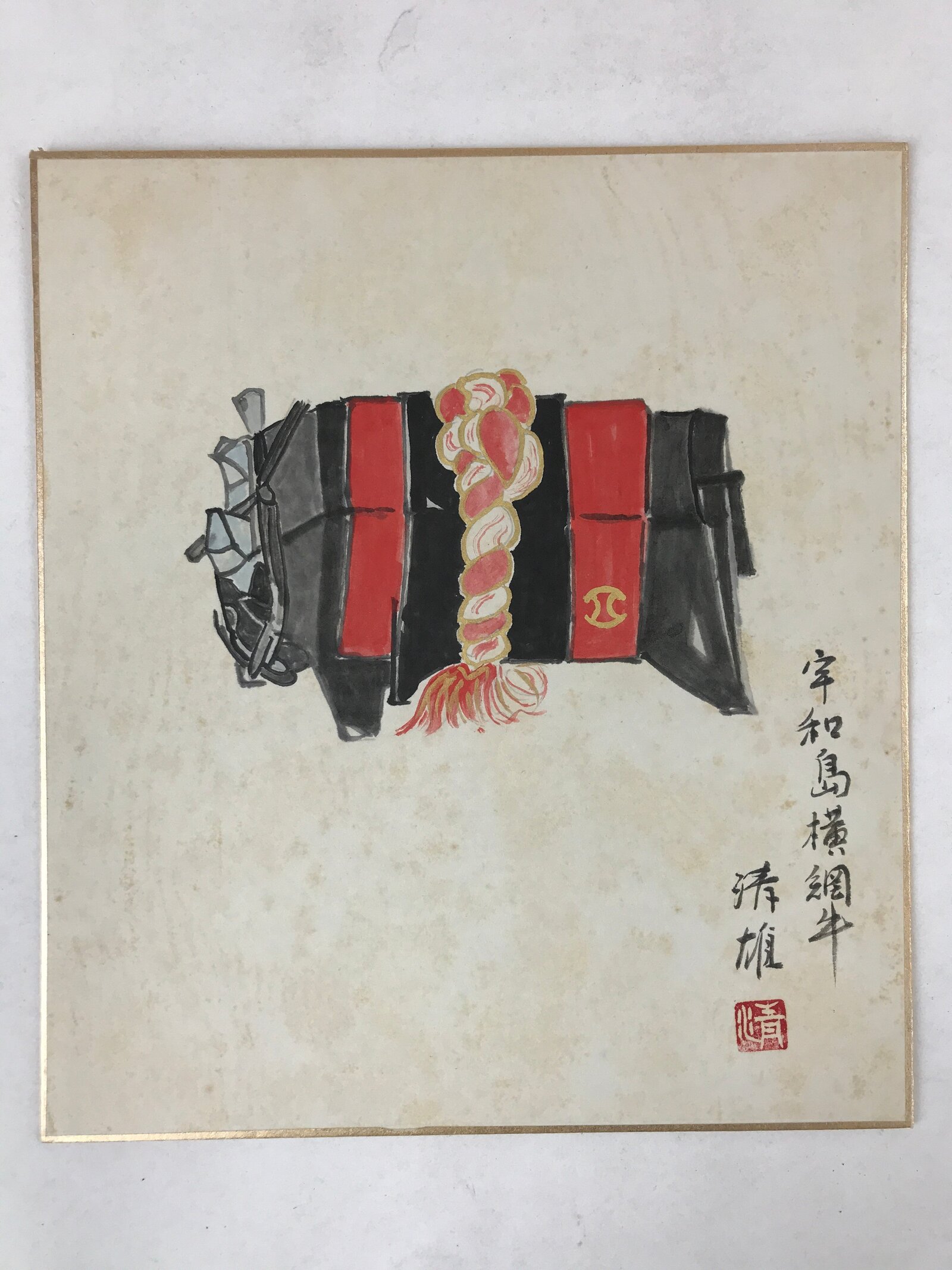 This item is a vintage Japanese shikishi art board. It is hand-painted and features a bull wearing a red and black ‘yokozuna’ champion’s belt. The design has some gold paint. There is a title and the shikishi art board is signed.