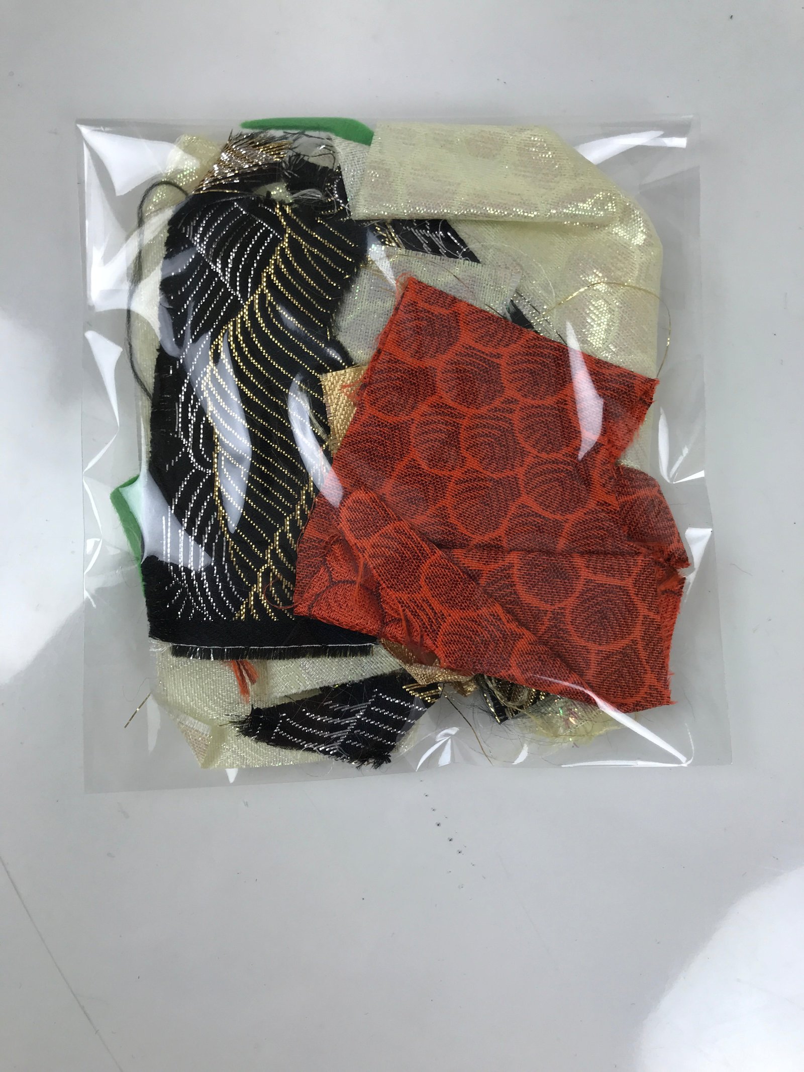 This vintage Japanese Kimekomi decorative fabric doll represents a rooster, one of the Chinese zodiac animals, and is a decoration for the New Year. It has a wooden base with silk fabric applied according to the kimekomi technique. The rooster is a combination of white, gold, orange, and black fabric in varying patterns. It comes with a wooden platform stand and a packet of small fabric scraps from crafting.