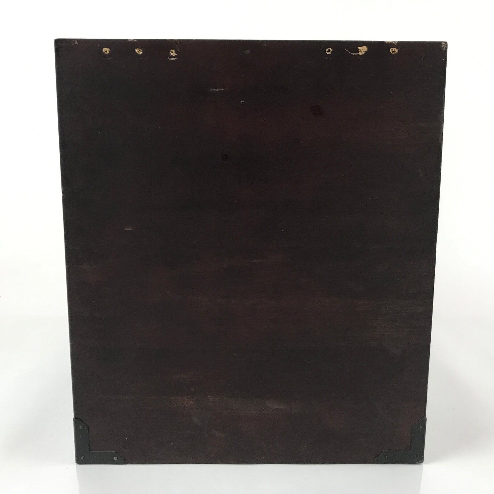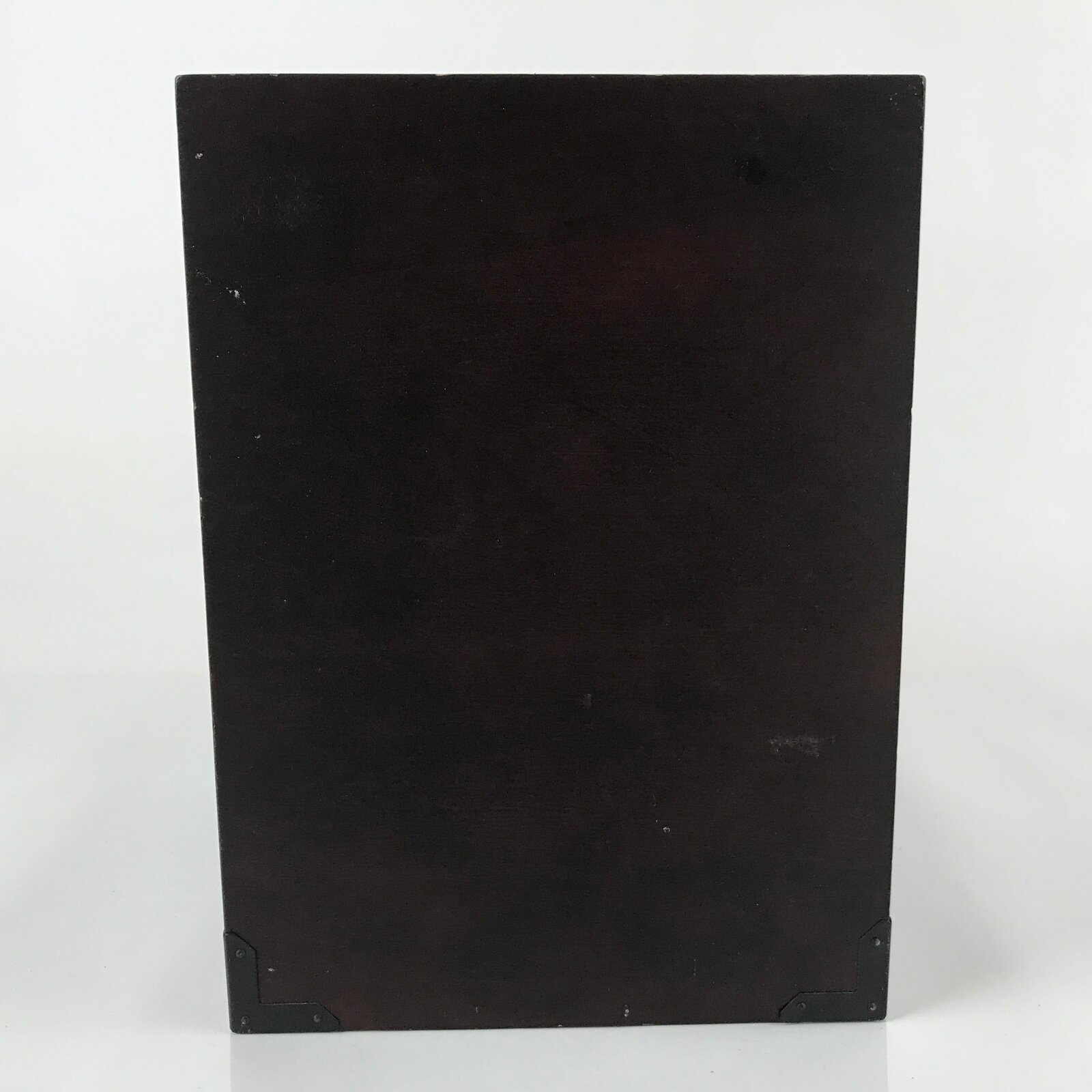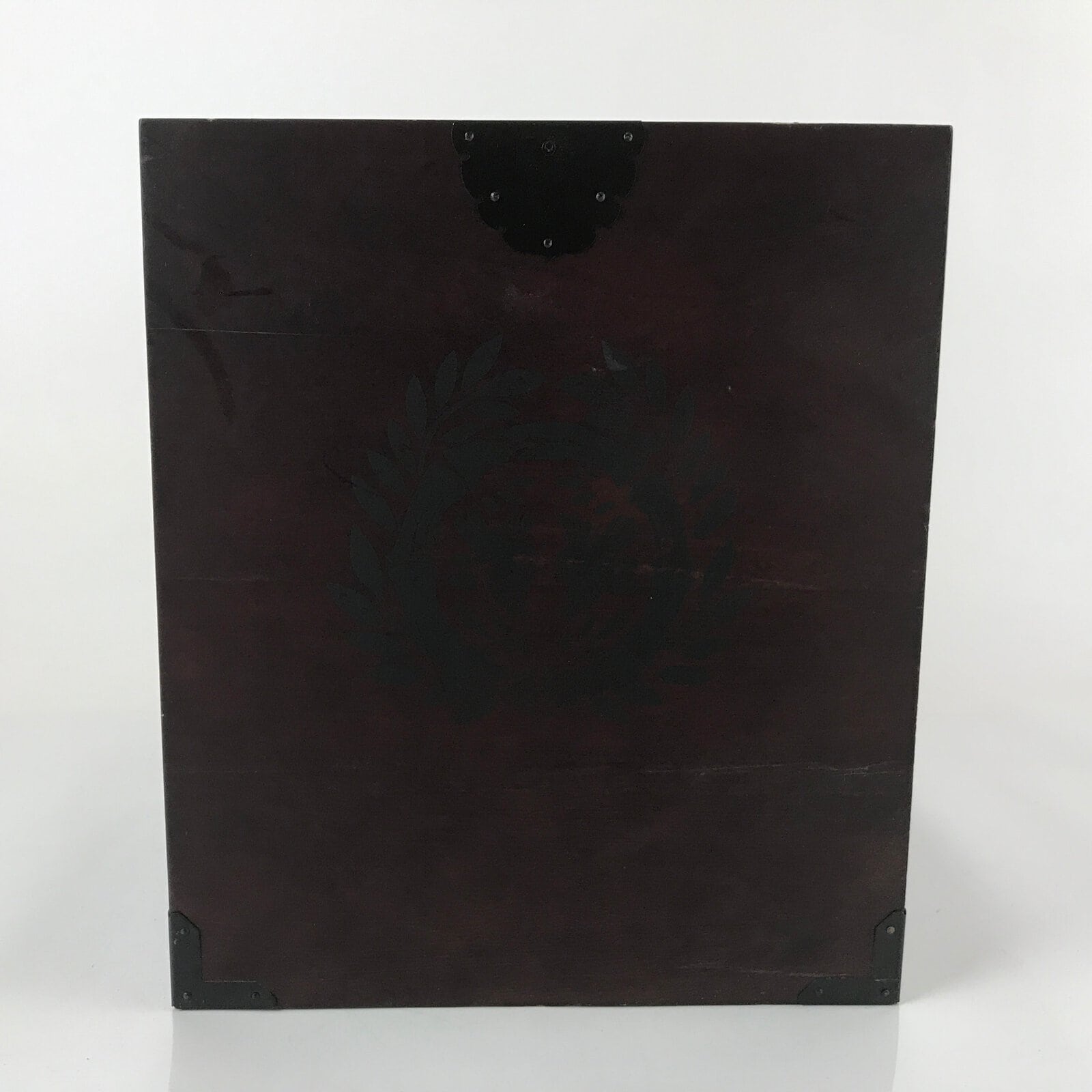This is a vintage Japanese open wooden box coated in a dark brown brushed lacquer. There is a stamped black mon or kamon symbol of two birds inside a bamboo laurel wreath. On the bottom corners are black metal decoration as well as a decorative metal plate on the front top. There was a lid at one time, but it is missing. This unique box is perfect for general storage and for home and office decor.